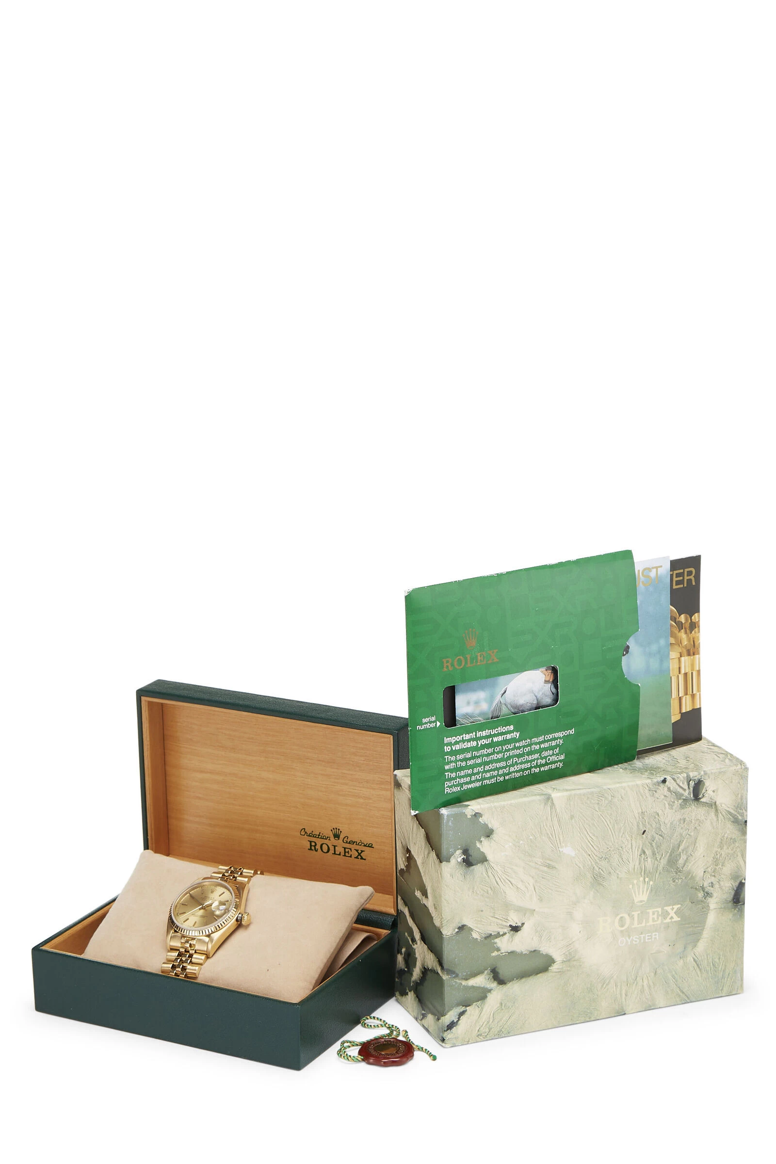 With impeccable craftsmanship and classic aesthetics, the Rolex Datejust watch is a timeless investment. First debuted in 1945, the Datejust watch features automatic movement with quickset date function, 18k yellow gold 40mm Oyster case with fluted bezel and scratch-resistant genuine sapphire crystal, a champagne dial with index hour markers and a magnified Cyclops date window, finished with a yellow gold American Oval Jubilee bracelet and hidden crown Oysterclasp closure. Includes branded box and papers.