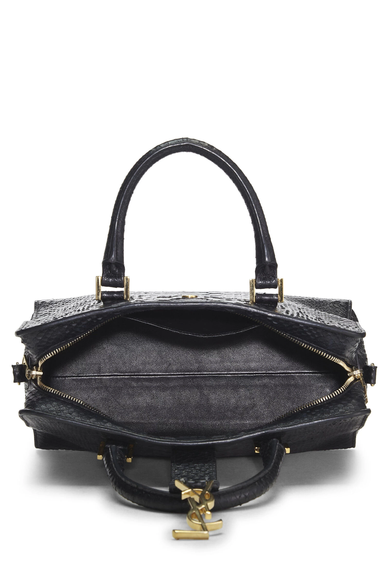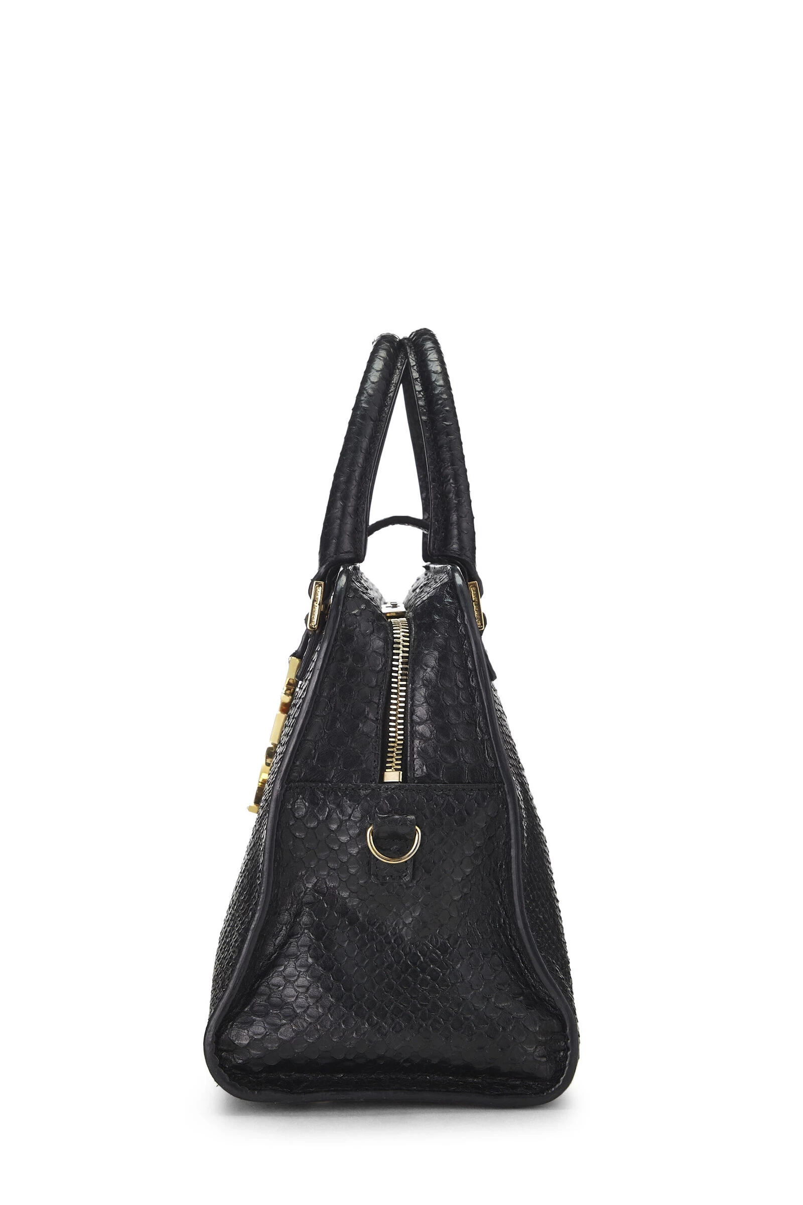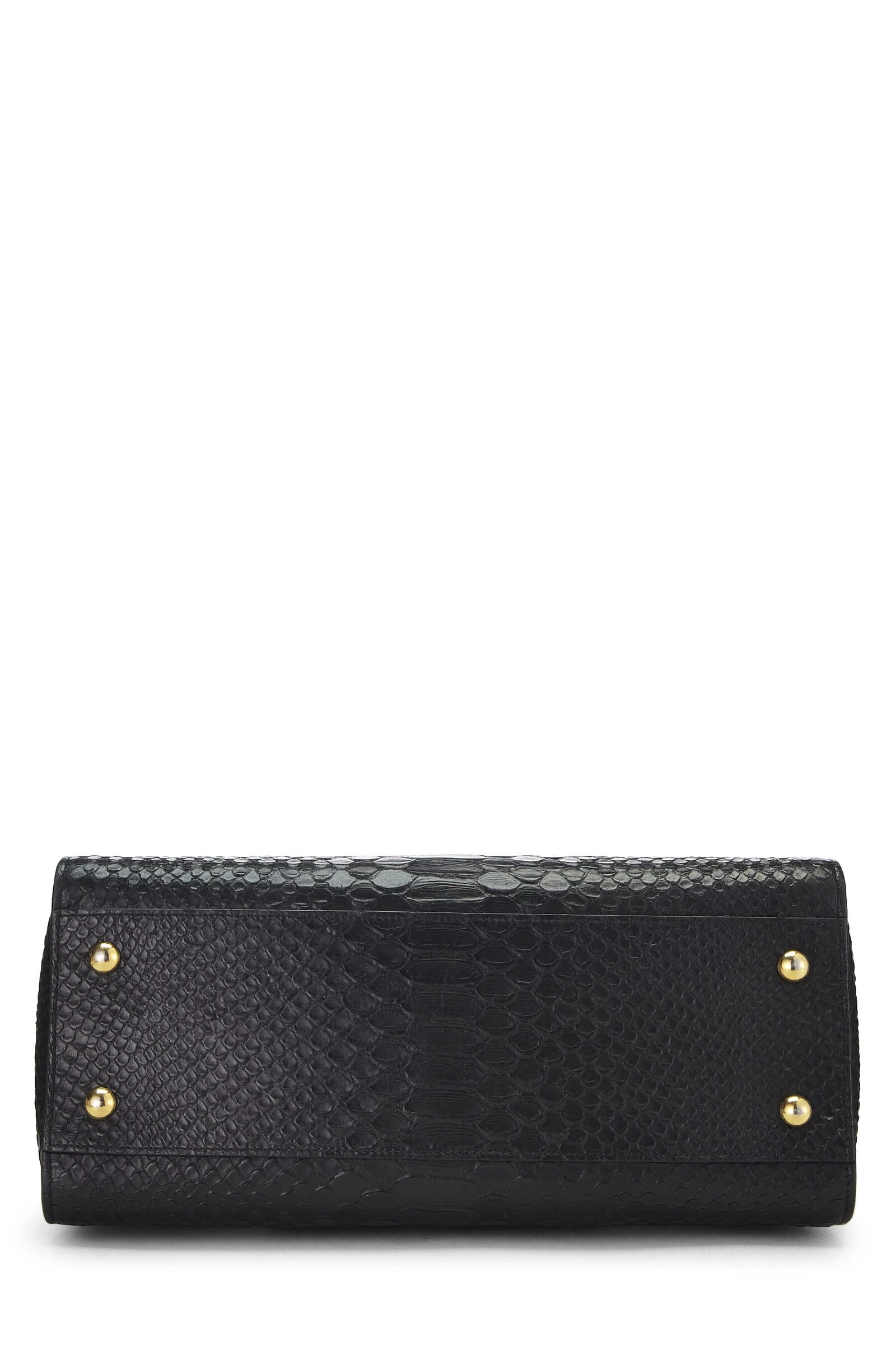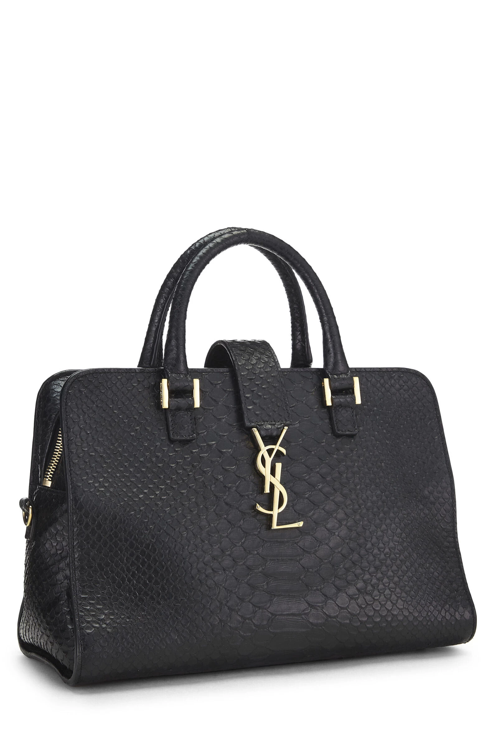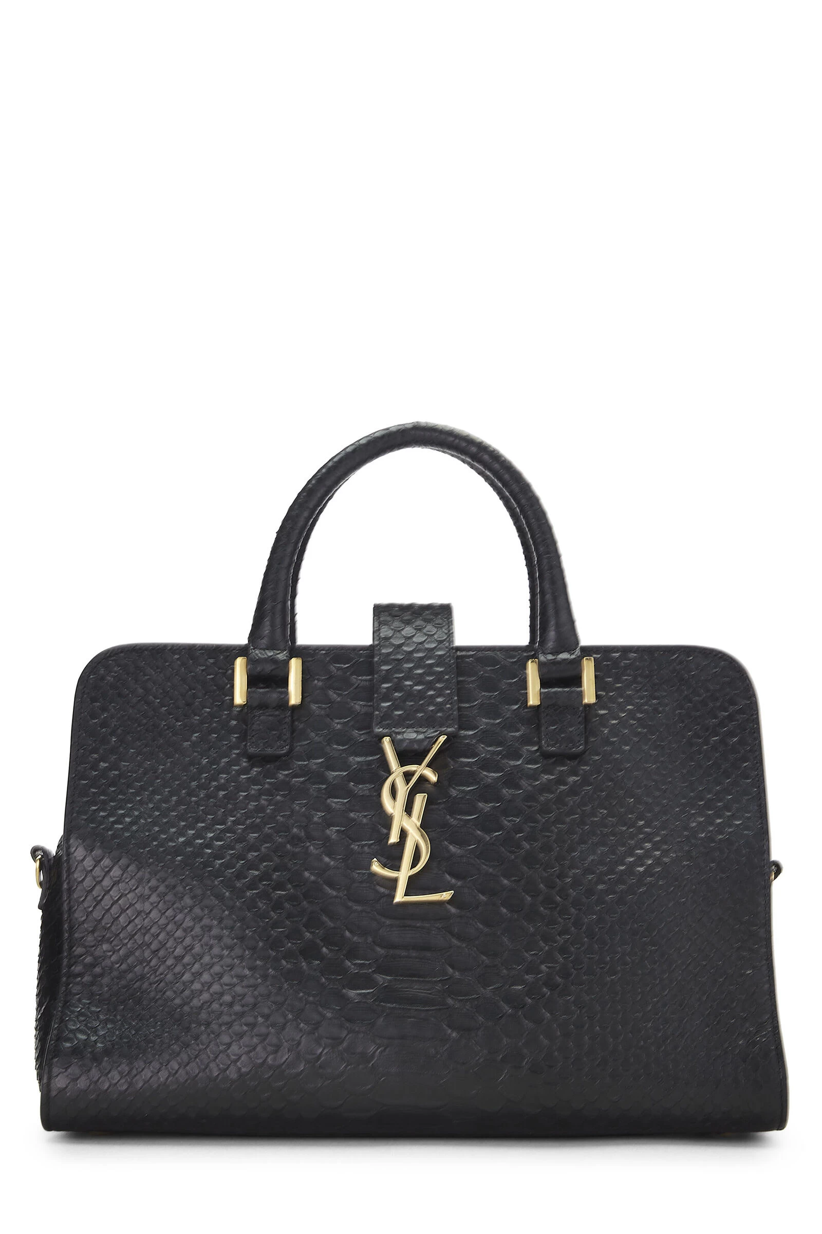 Structured and chic YSL small Downtown Cabas tote crafted in black embossed python leather with embossed side panels, featuring gold-tone hardware and iconic YSL logo. In addition to two rolled top handles, the tote also includes an optional shoulder strap for versatile carry.