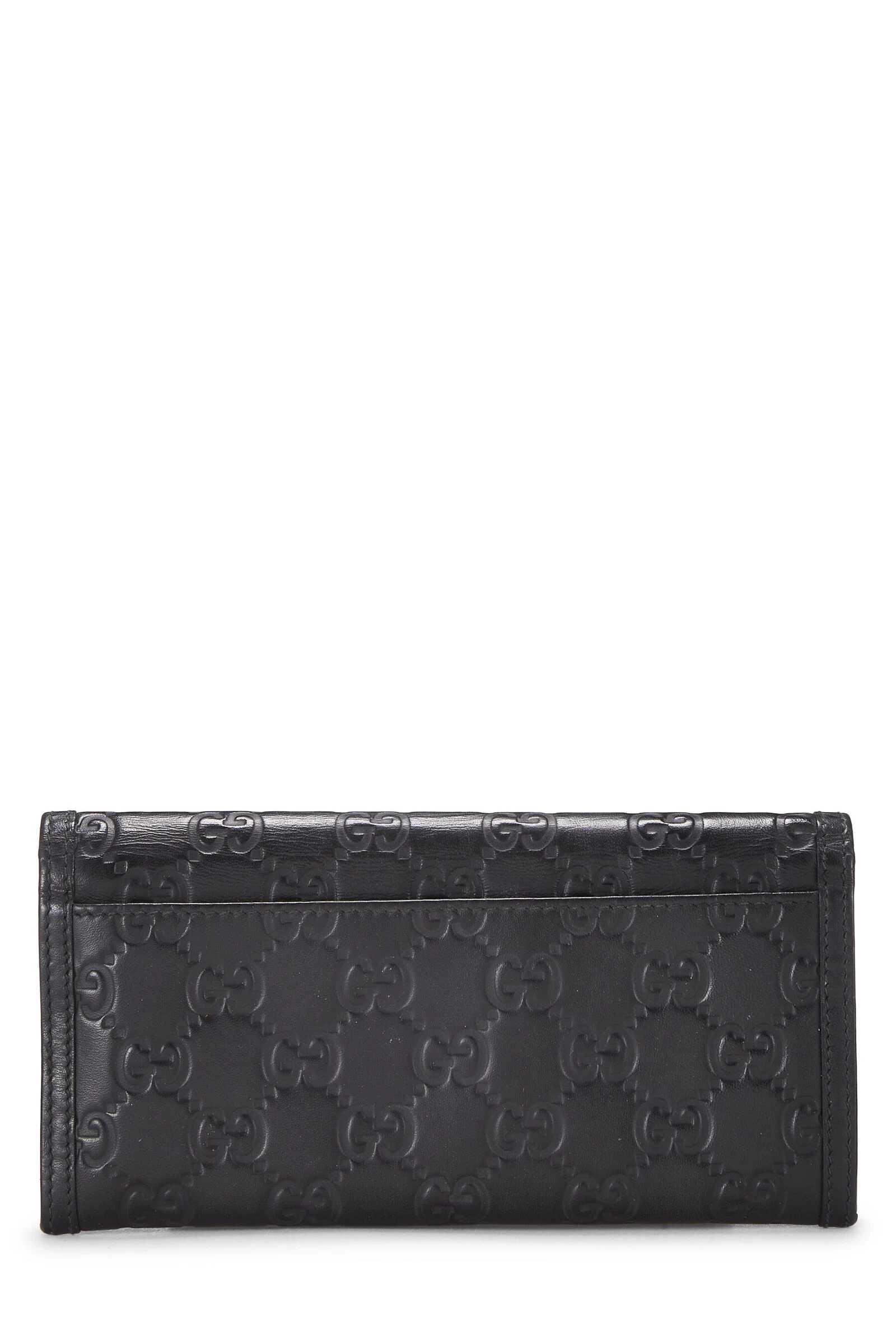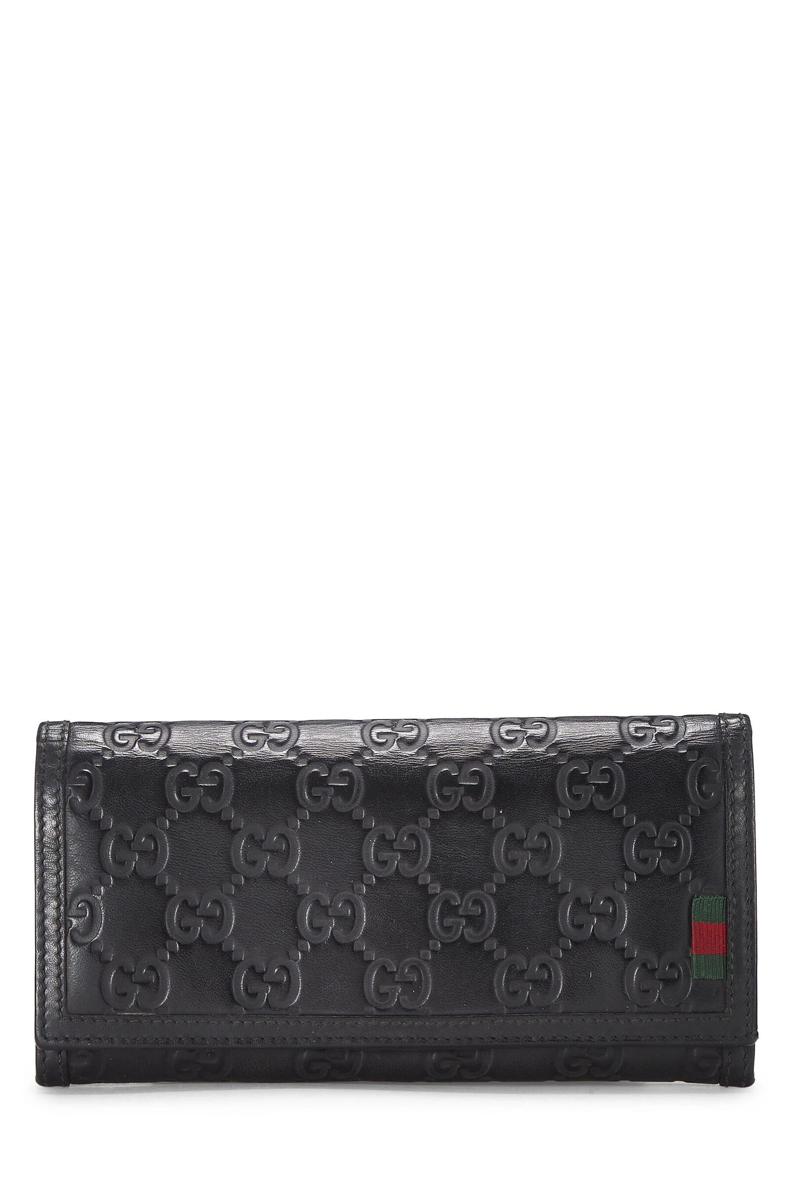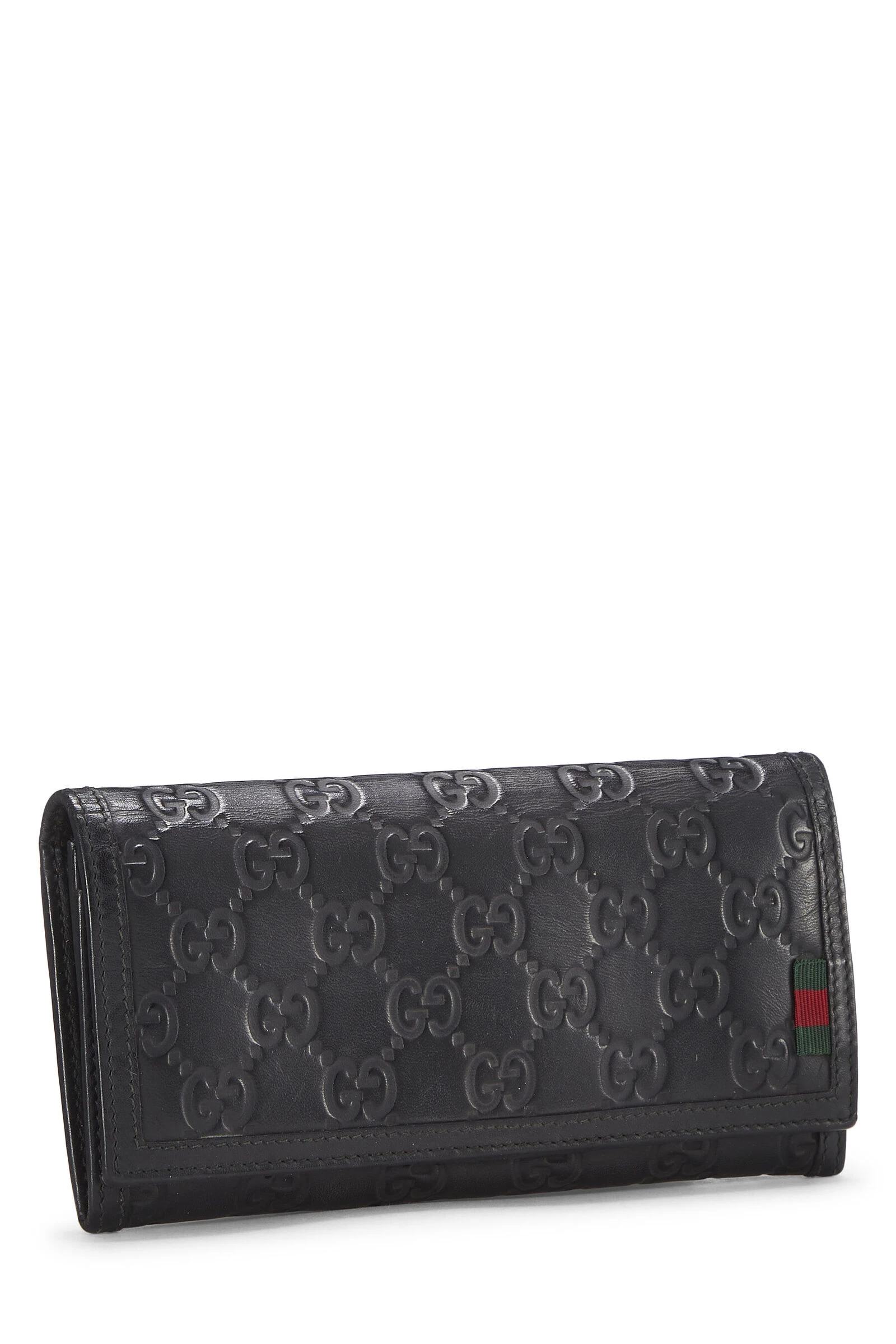 Classic checkbook silhouette continental wallet rendered in Gucci’s iconic stamped Guccissima leather. Snap the wallet open to reveal a tonal leather lining with multiple pockets and slots to hold all of your on-the-go essentials.