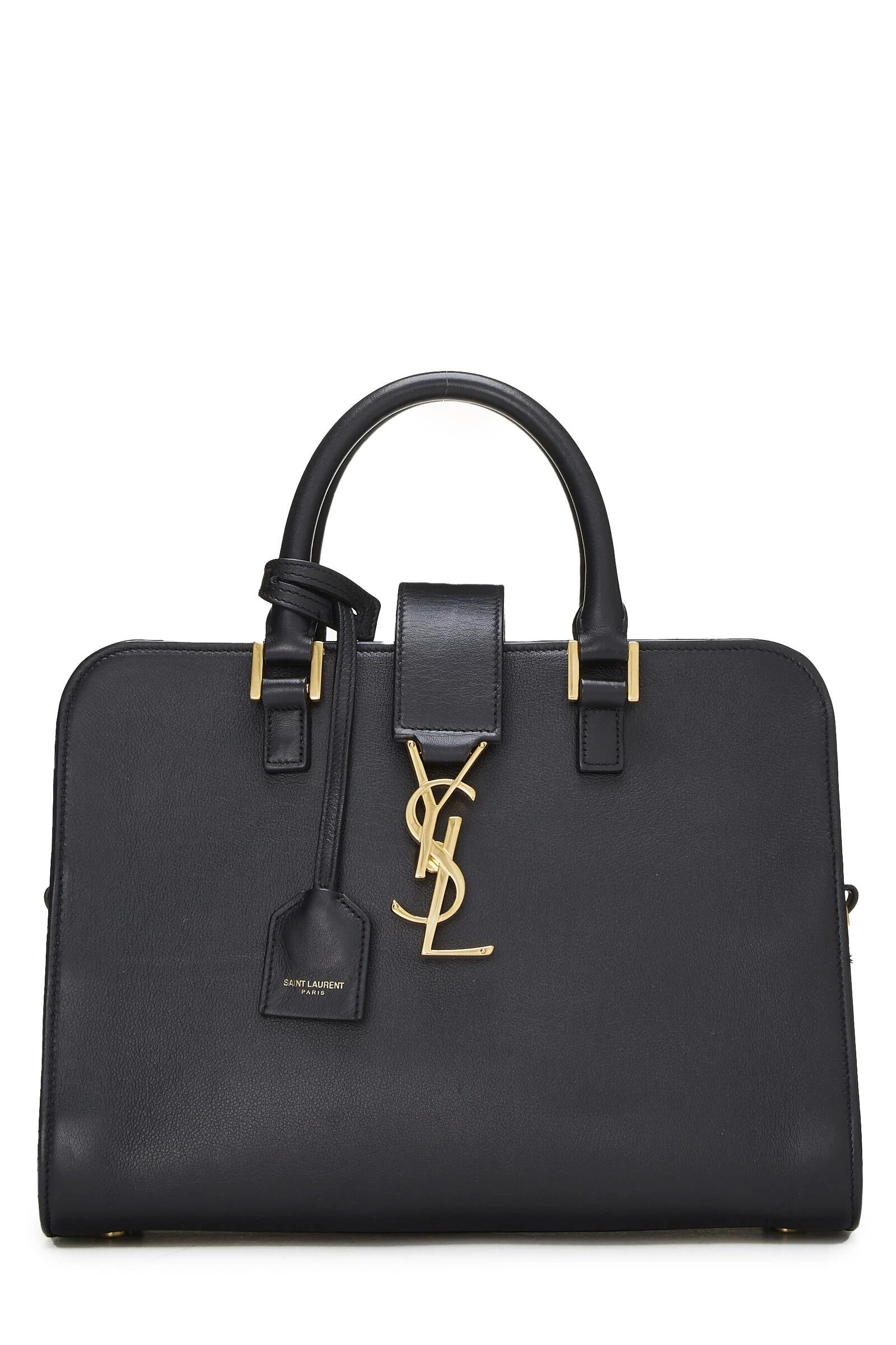Classic YSL Cabas Baby rendered in a black soft calfskin leather and accented with gold-tone logo clasp and hardware.