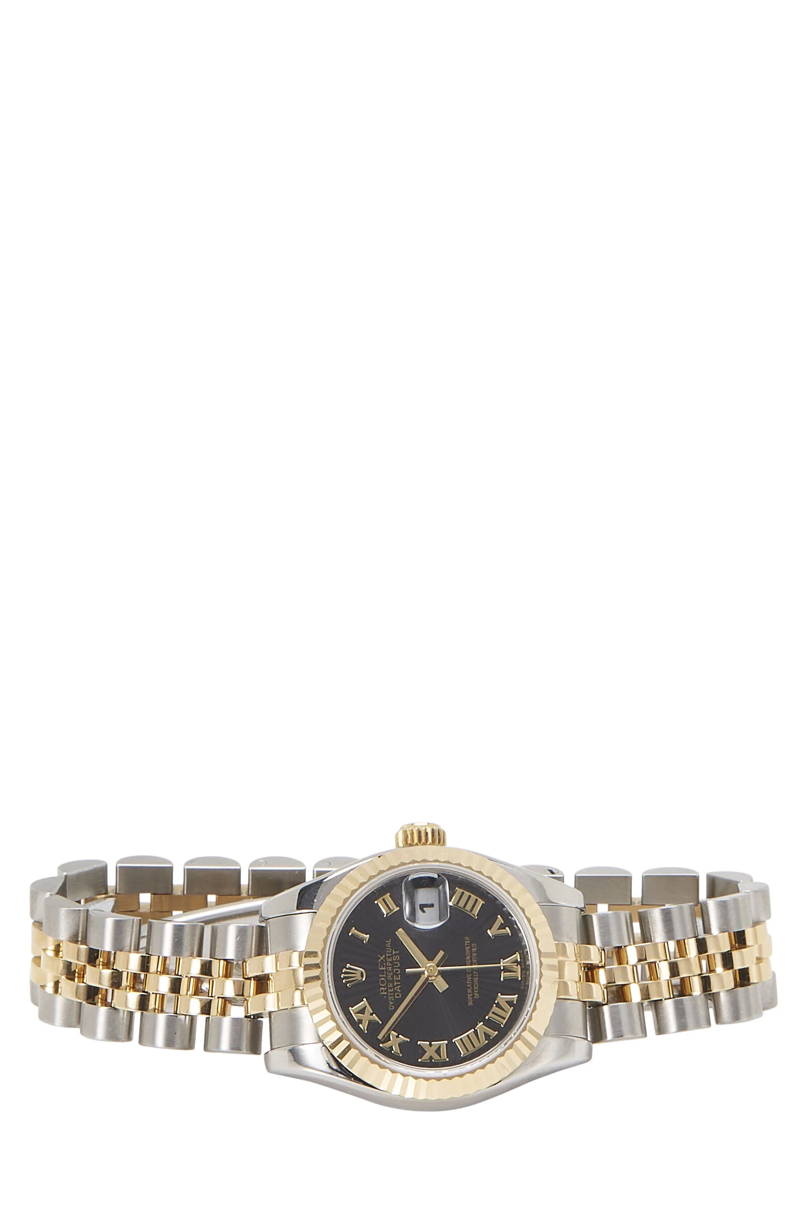 With impeccable craftsmanship and classic aesthetics, the Rolex Datejust watch is a timeless investment. First debuted in 1945, this vintage Datejust watch features automatic movement with quickset date function, stainless steel Oyster case with 18 karat yellow gold fluted bezel, scratch resistant genuine sapphire crystal with a magnified Cyclops date window, a black dial with Roman numeral hour markers, finished with a Jubilee bracelet featuring a hidden Crown clasp. Includes branded box & papers.