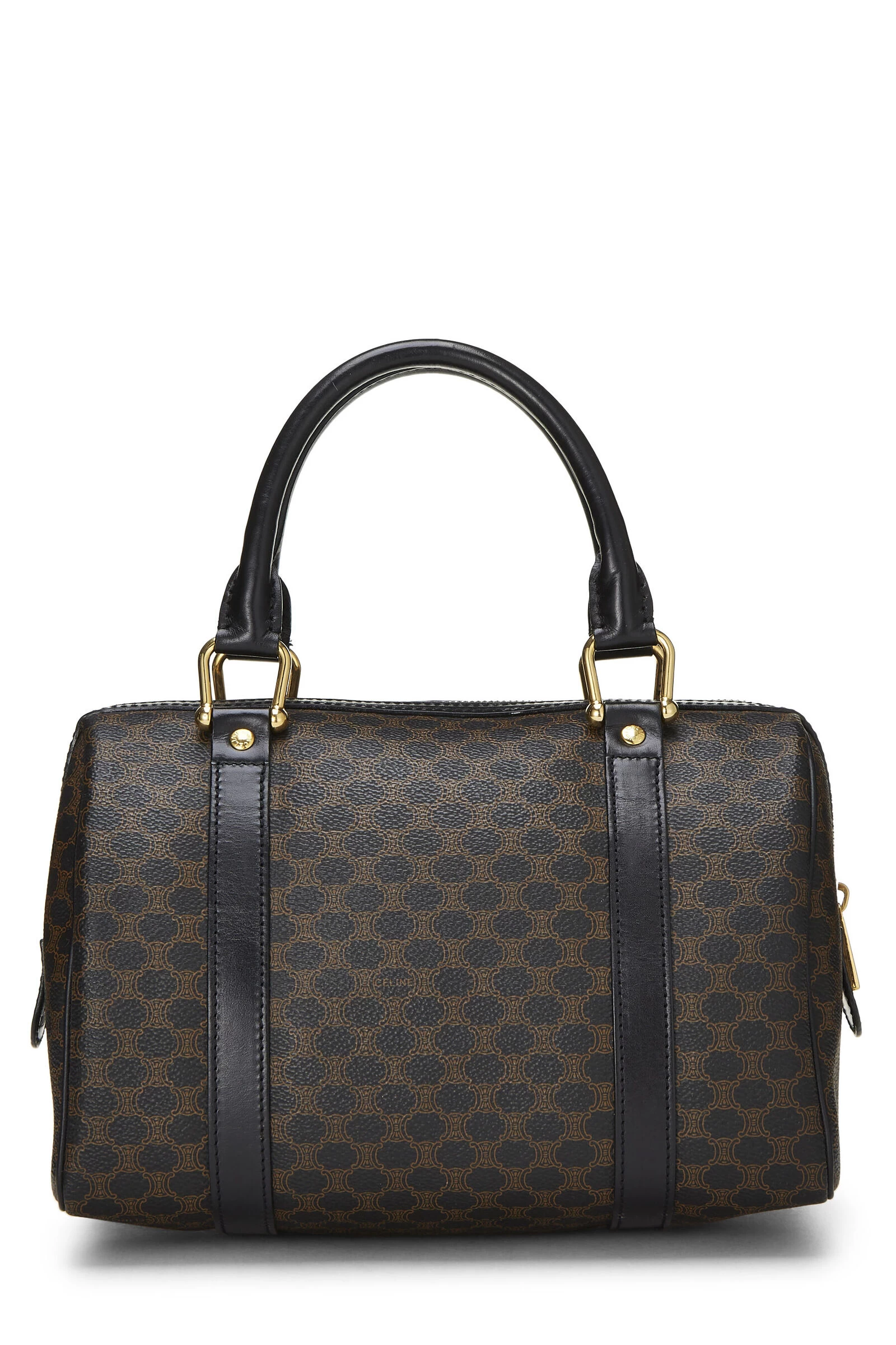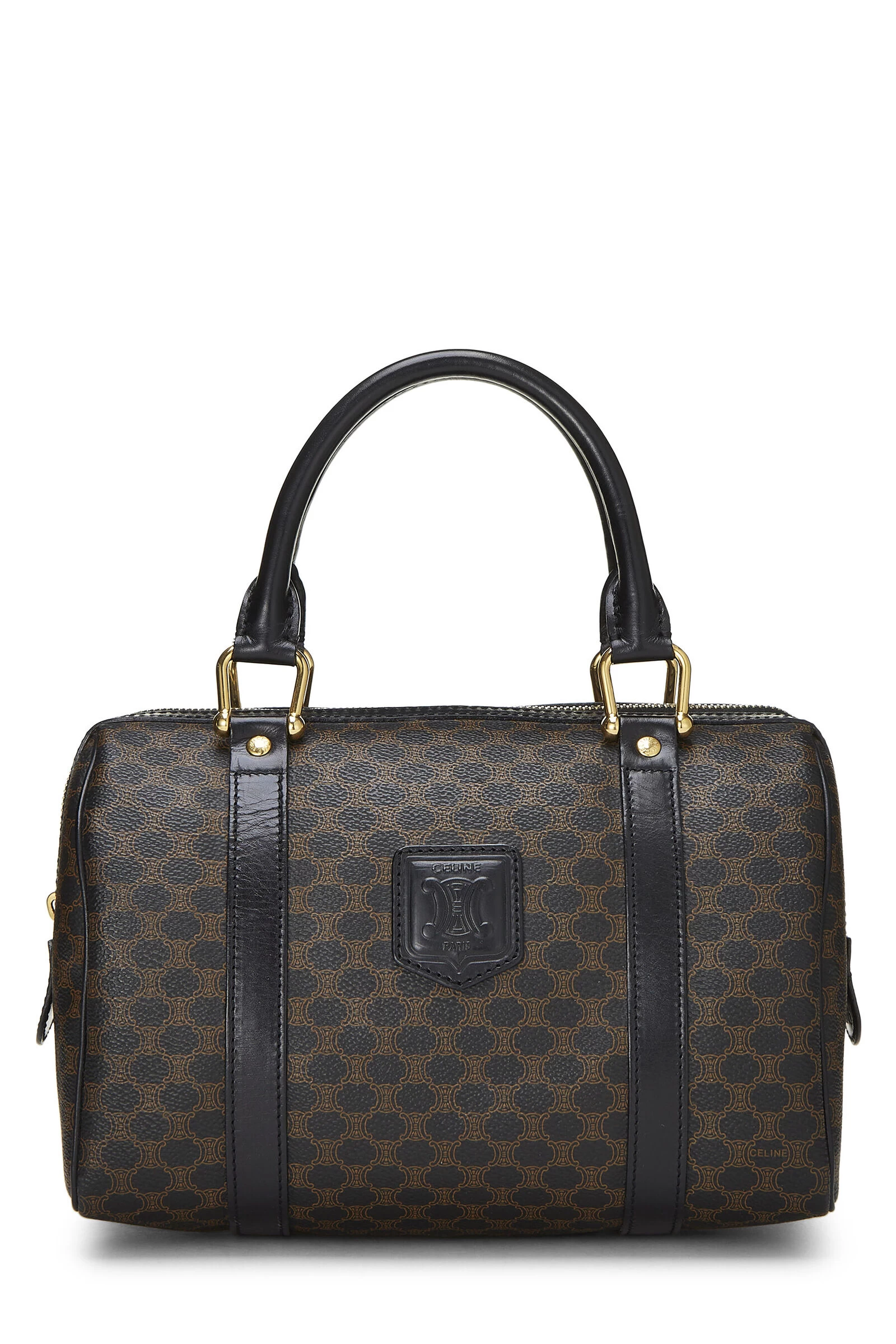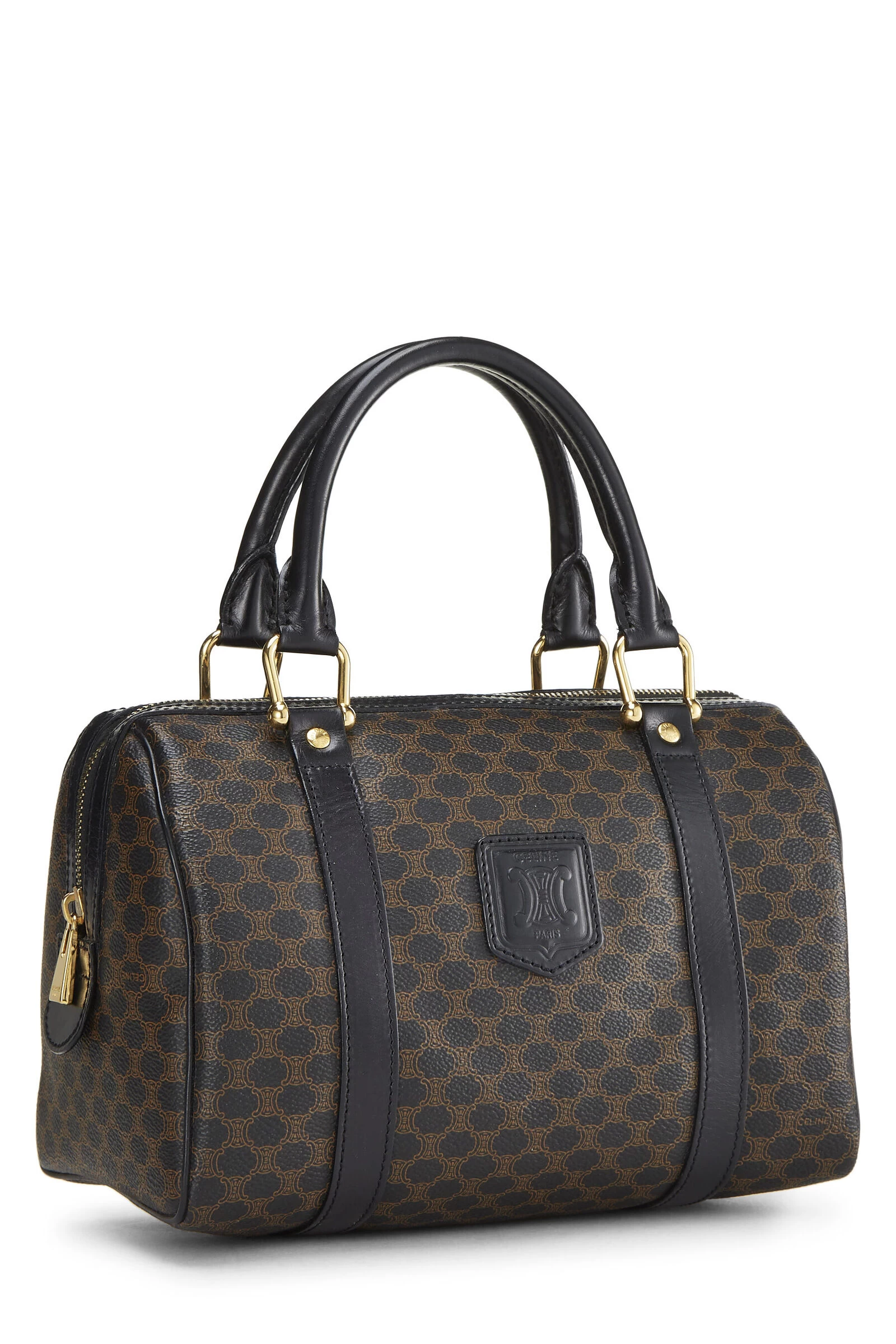 Classic Céline handbag crafted in black and brown coated canvas featuring the classic Macadam pattern throughout, accented with tonal leather trim and gold-tone hardware.