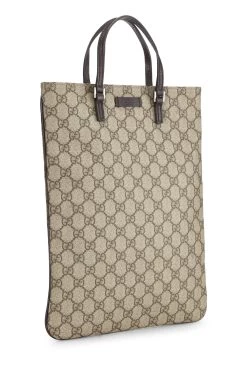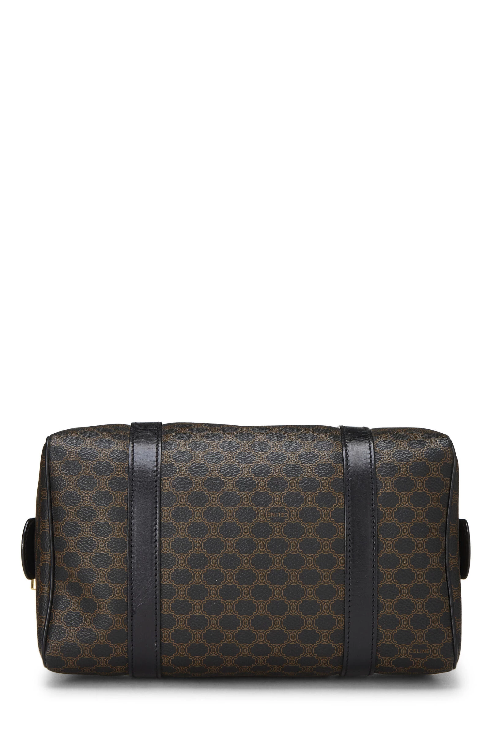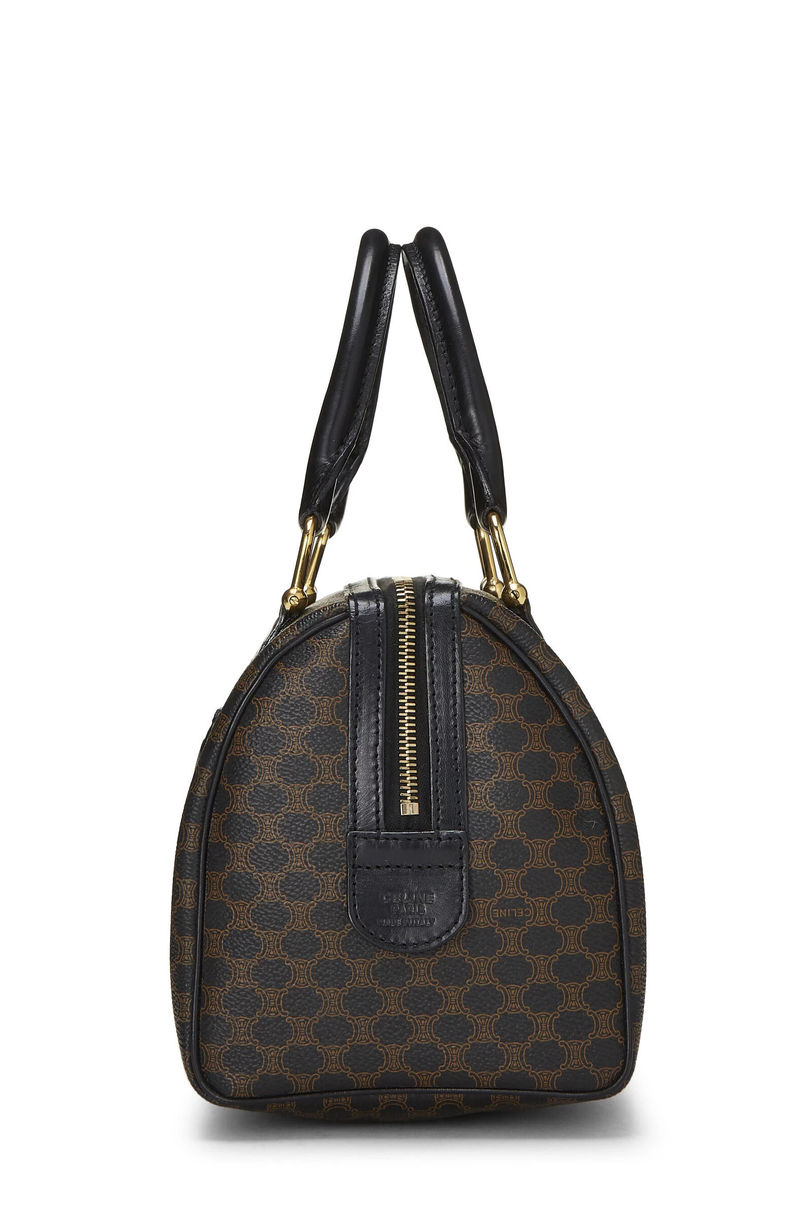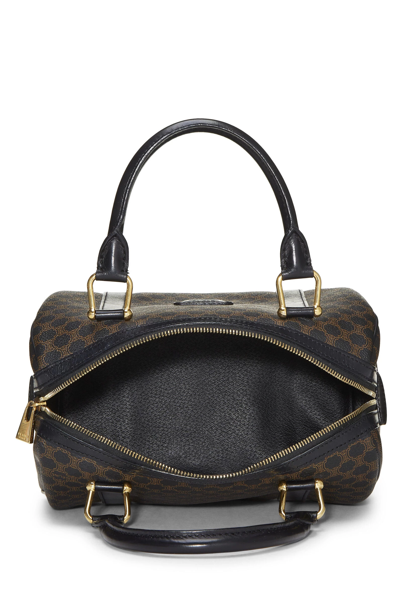 Classic Céline handbag crafted in black and brown coated canvas featuring the classic Macadam pattern throughout, accented with tonal leather trim and gold-tone hardware.