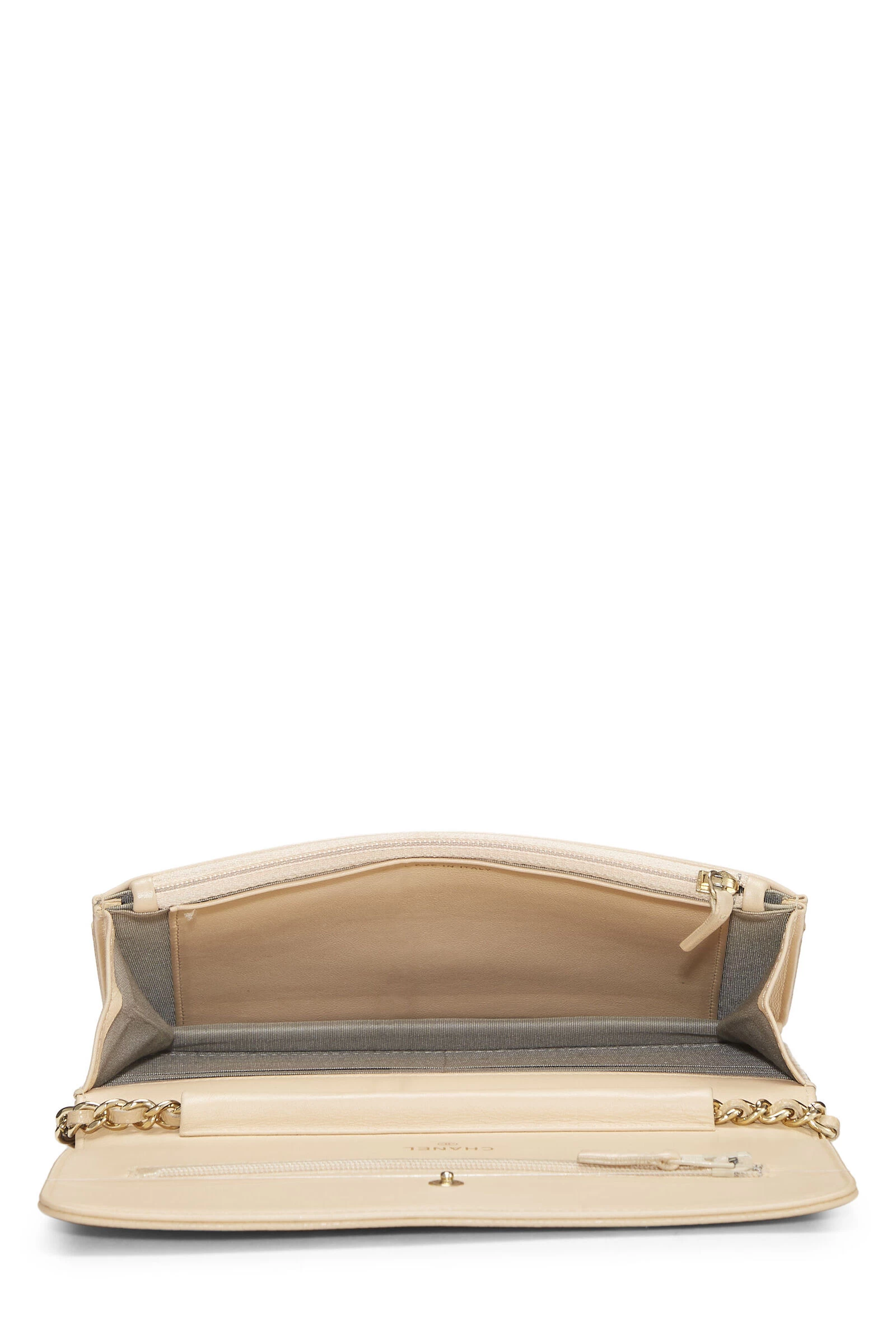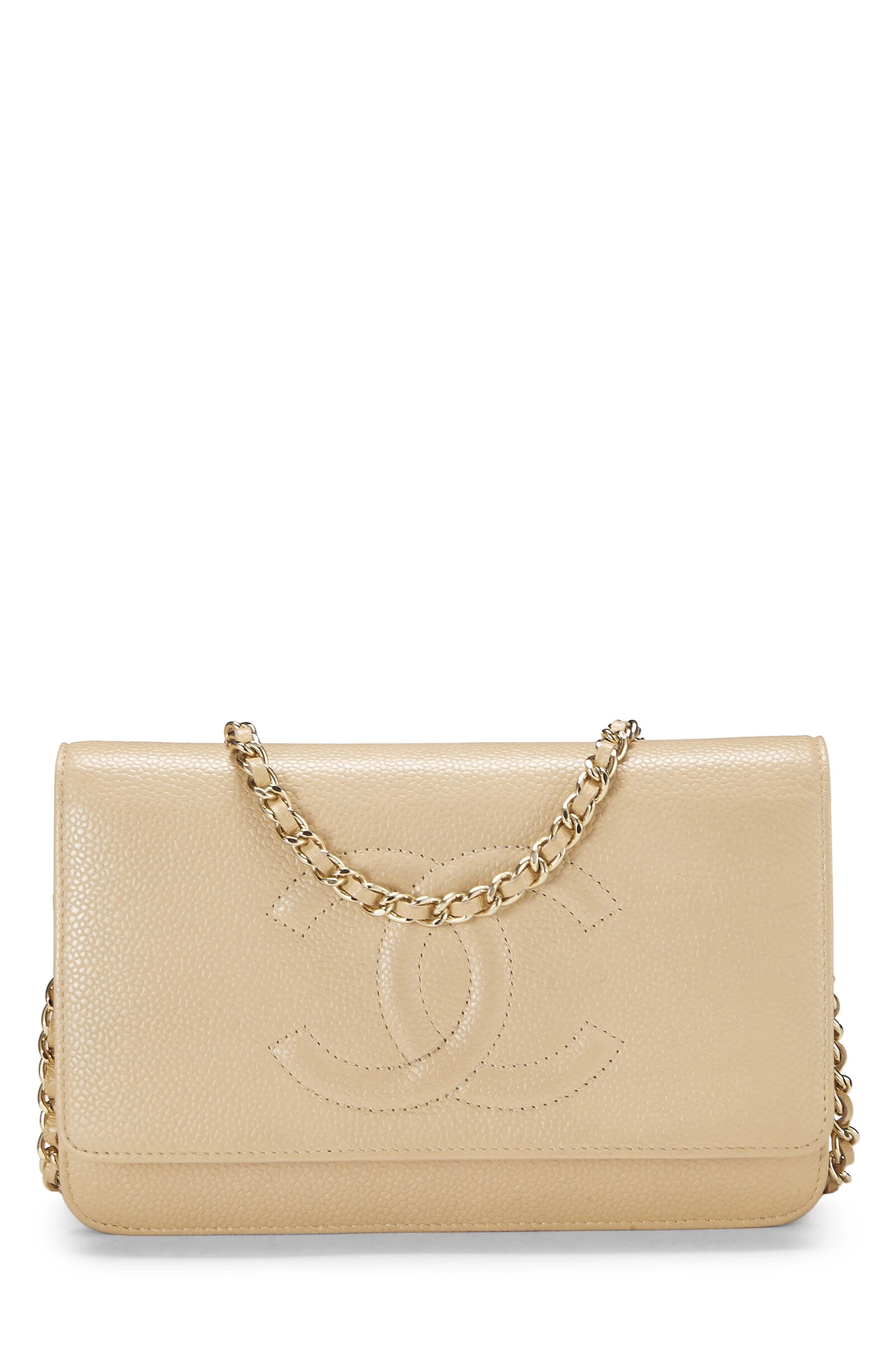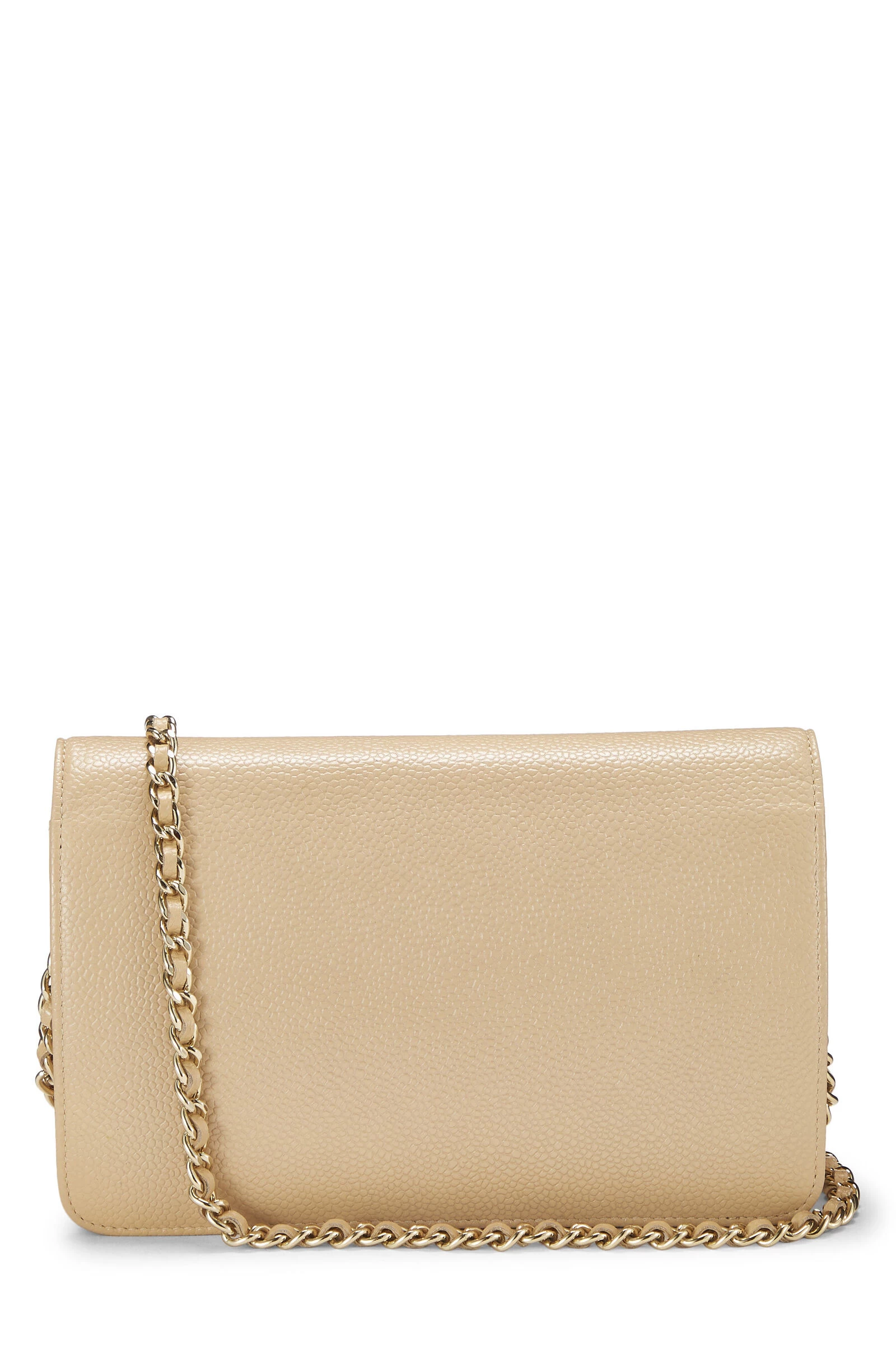 Part of Chanel’s Timeless collection, this Wallet on Chain rendered in beige grained Caviar leather, accented with interlocking CC embroidery on front flap and finished with gold-plated chain strap. Chanel’s convertible Wallet on Chain bag features a drop-in strap for use as a clutch or crossbody, while the interior features various pockets and compartments to function as a wallet.Β