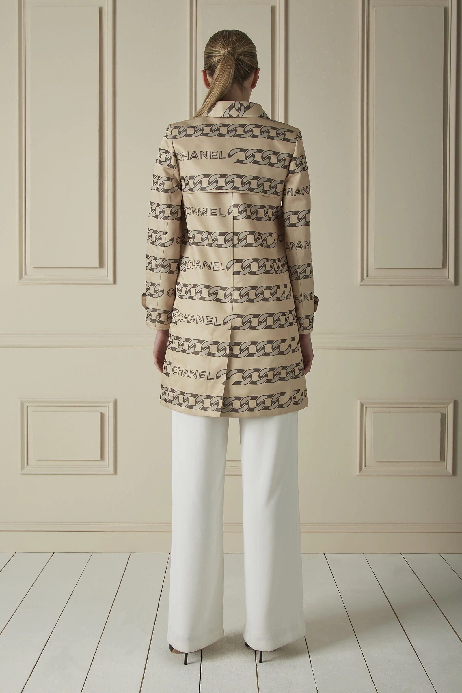 A debut from the Chanel’s Fall 2001 runway, this lightweight coat is a non-negotiable for transitional season dressing. It was crafted from a silk blend with the Maison’s name and chain illustrations printed throughout. Its silhouette traces lightly padded shoulders and falls to a knee length. Enlist yours when temperatures begin to dip.