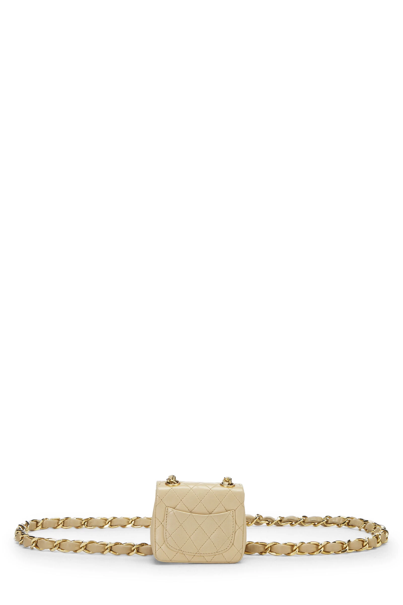 Perfectly on-trend and vintage, this Chanel belt bag features a gold-plated chain link and beige leather waist strap with adjustable hook closure, accented with a dangling micro Flap bag in tonal quilted lambskin leather and finished with the signature ‘CC’ logo hardware.