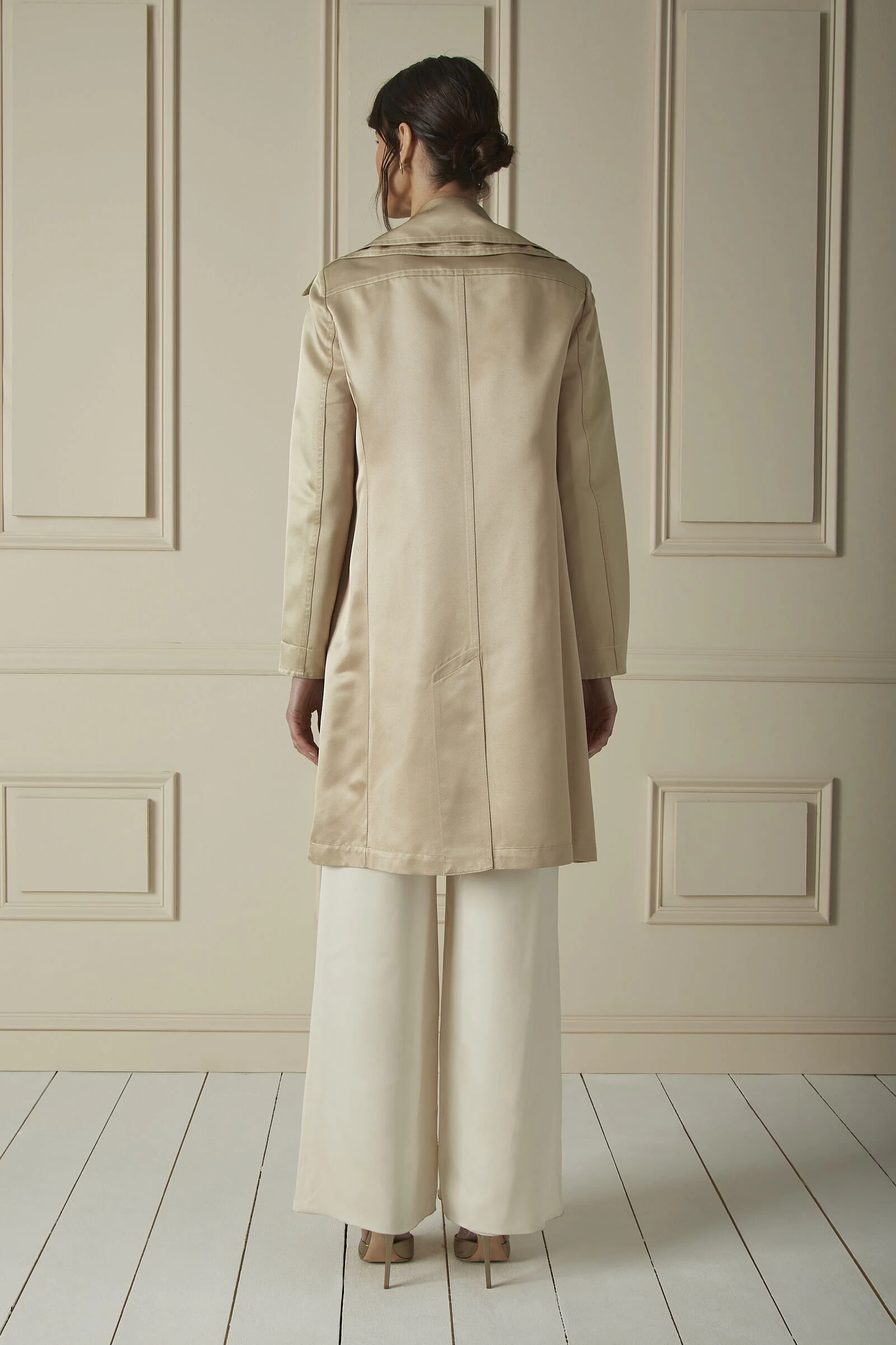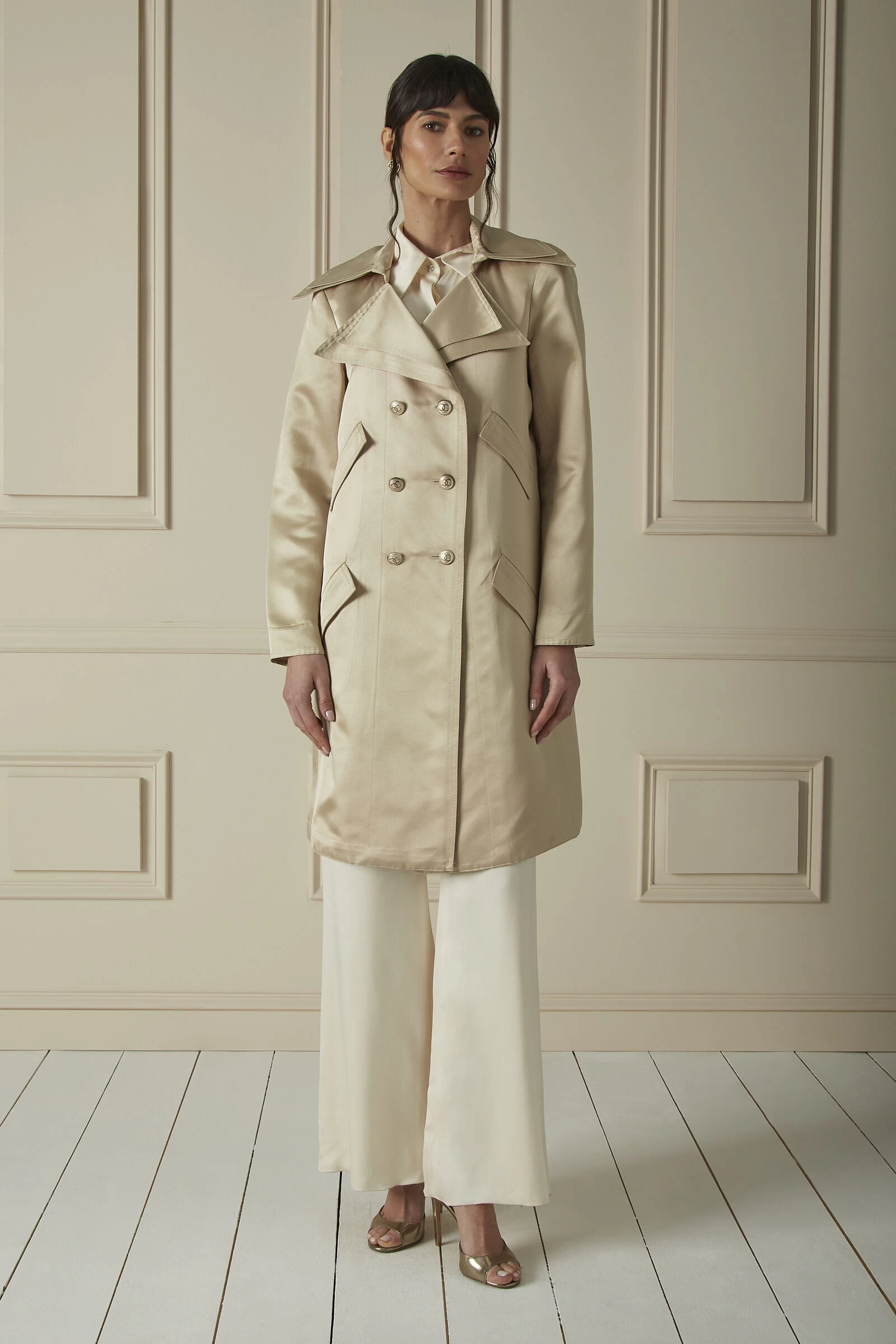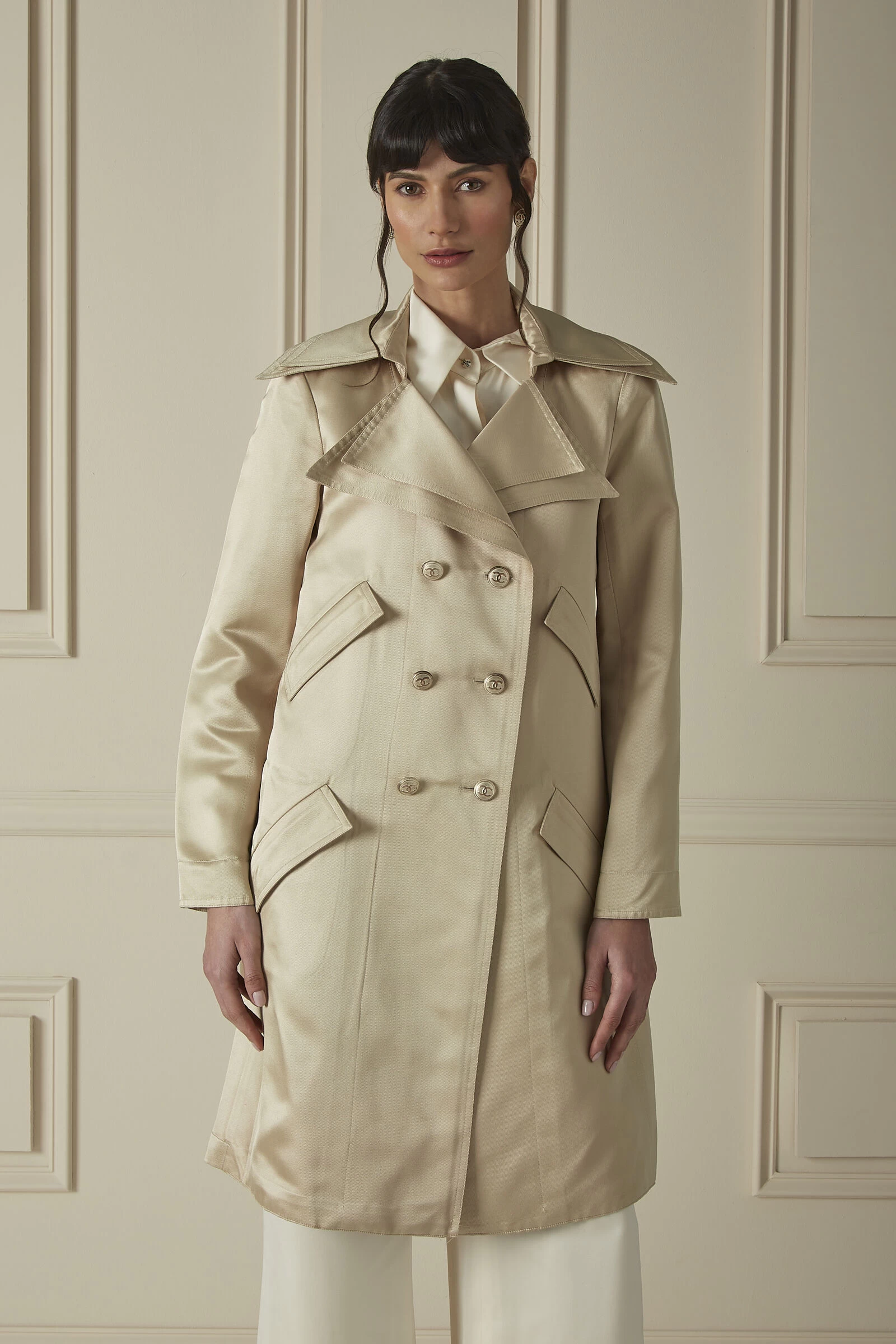 Classic and sleek, this Chanel double breasted trench coat is crafted from a beige shimmery sateen twill and is finished with copper ‘CC’-engraved buttons. With a unique double-layered notch collar and four front flap pockets, this timeless, lightweight coat effortlessly layers over any look to make a chic statement.