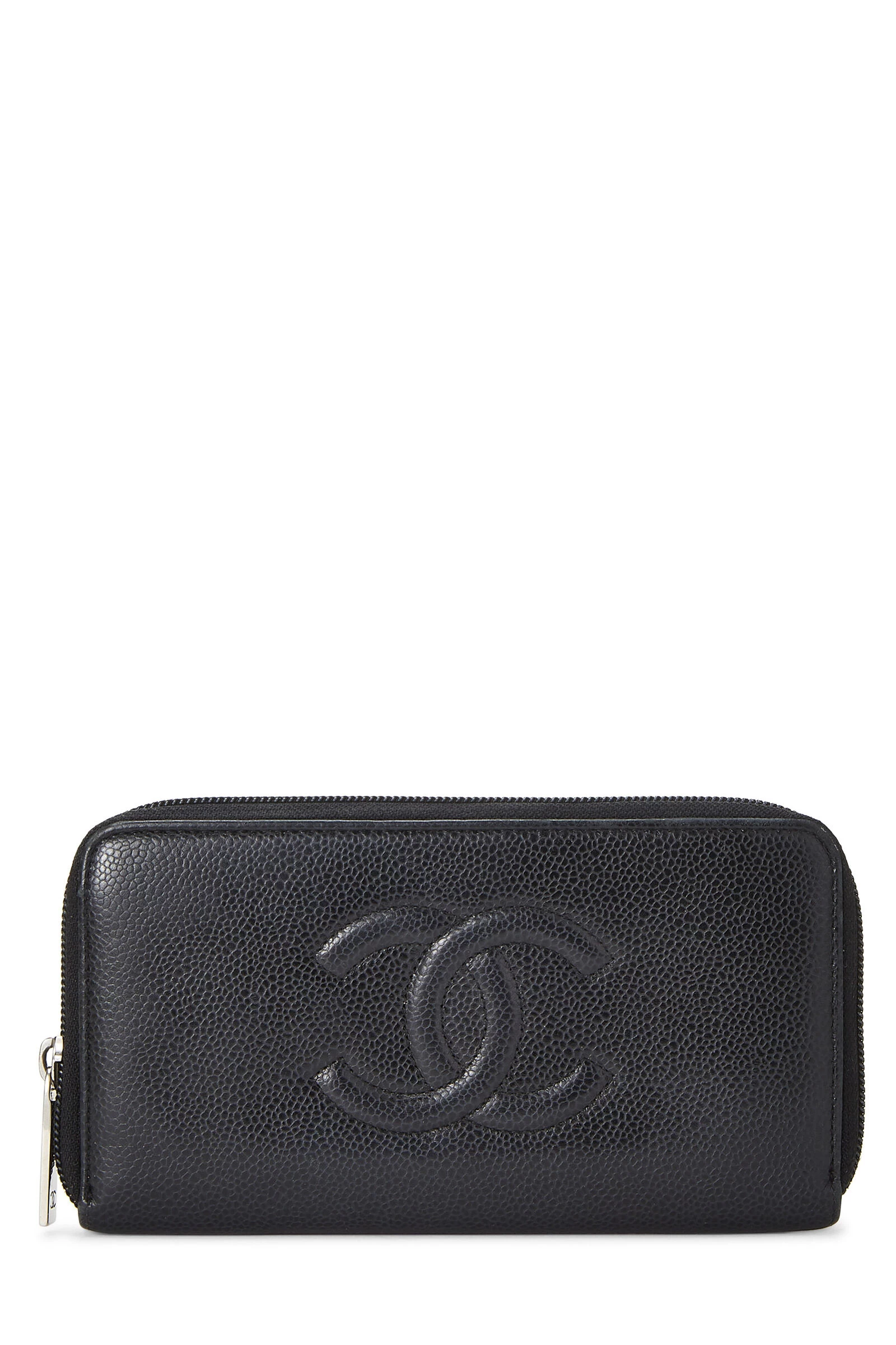 Chic Chanel zip-around wallet crafted in black Caviar leather – iconic to Chanel – accented with a tonal black leather interior and finished with silver-tone hardware. Features an embossed interlocking ‘CC’ stitched on the front of the wallet.