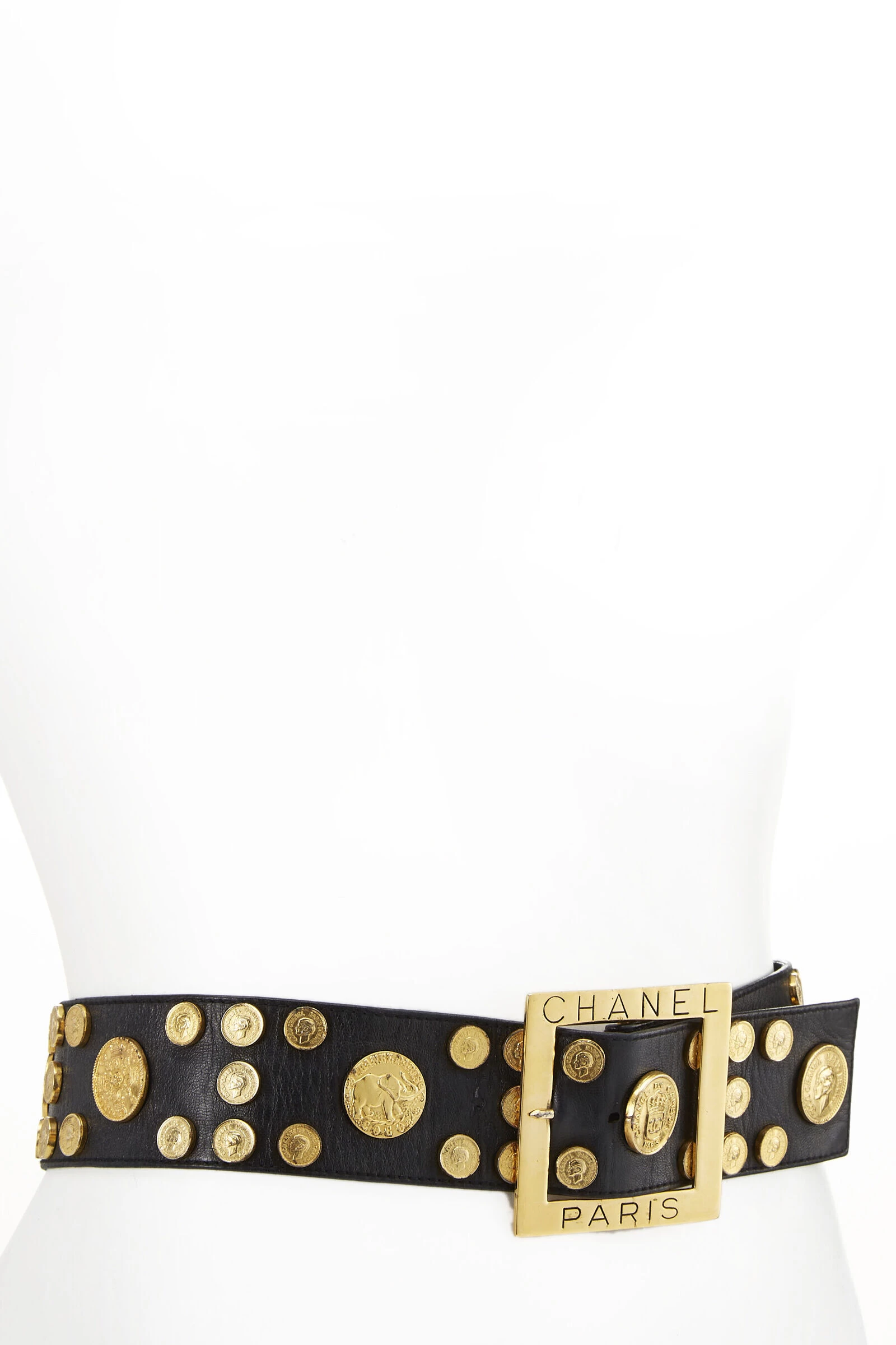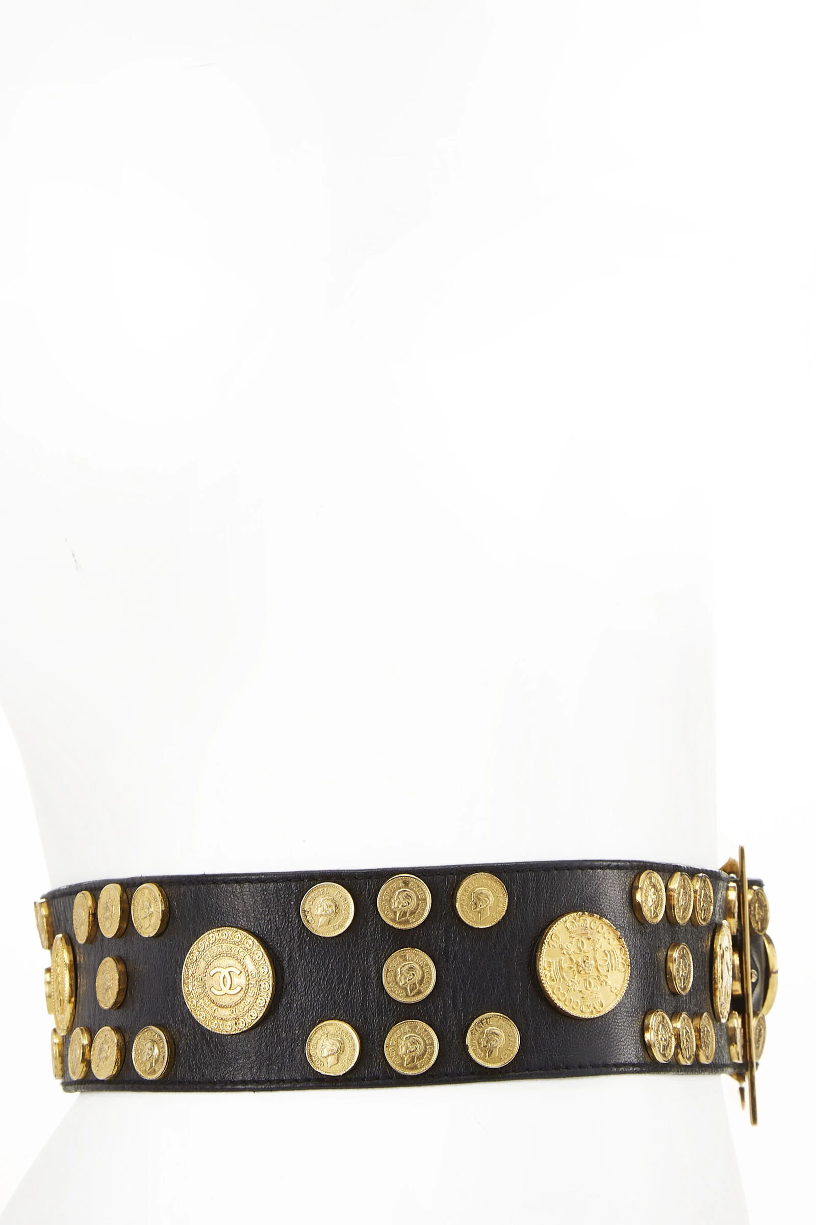 An everyday companion to your hips, this Chanel belt comes thickly cut from black leather with an engraved buckle and coordinating gold-tone coin embellishments—some of which feature Coco Chanel’s silhouette, while others are engraved with the house crest and animals. Size 70/28