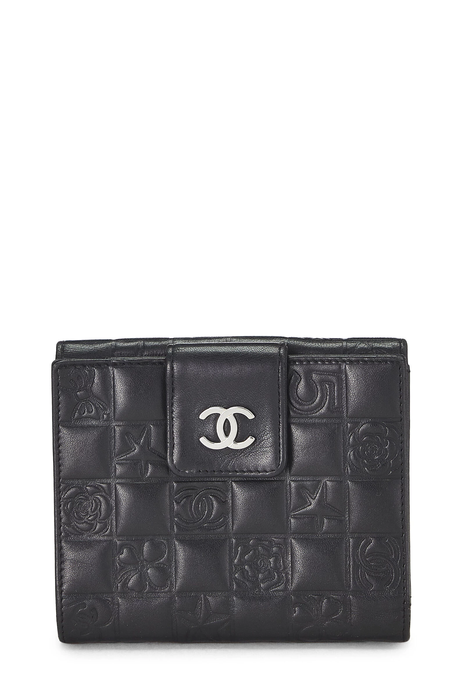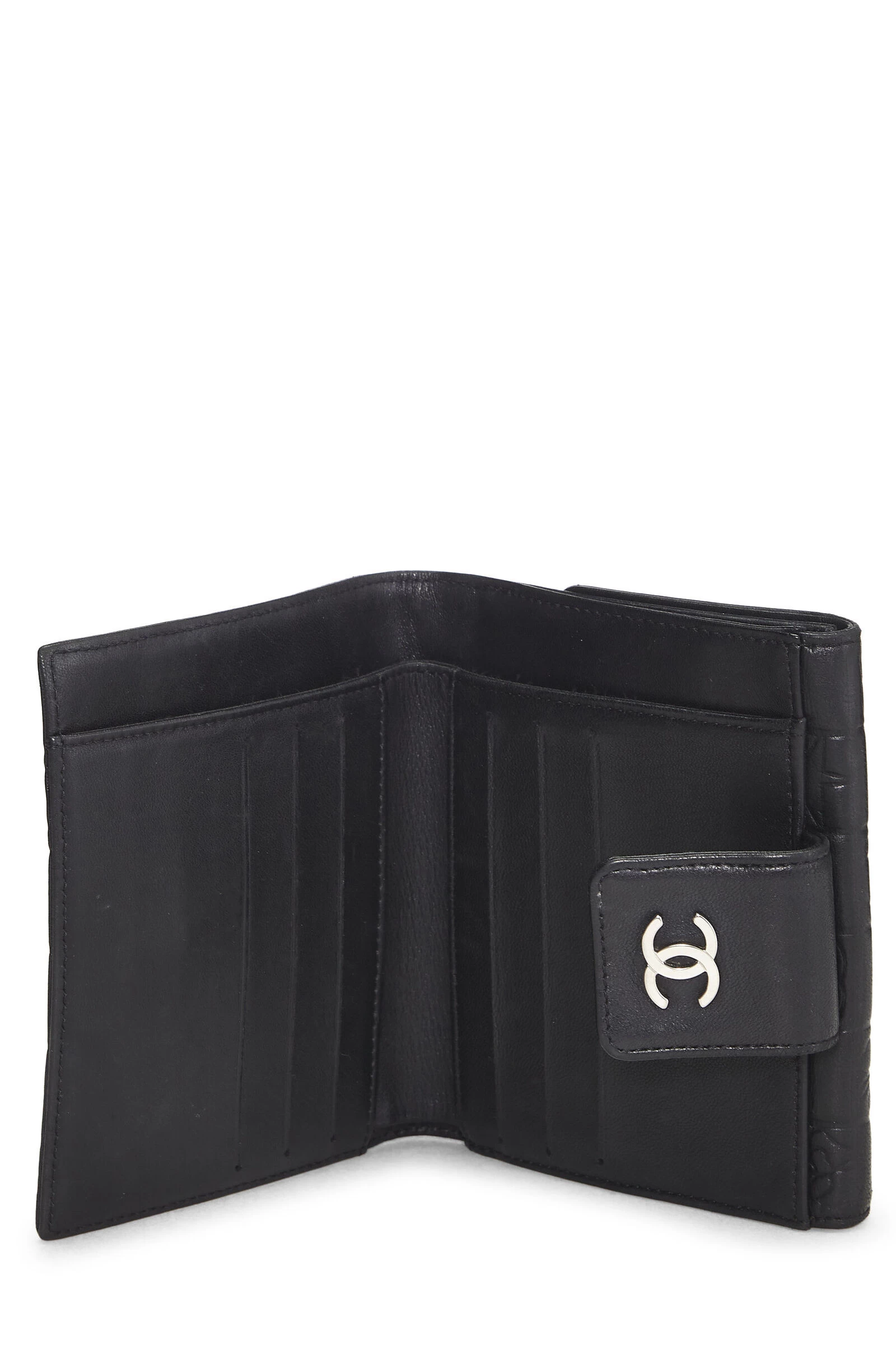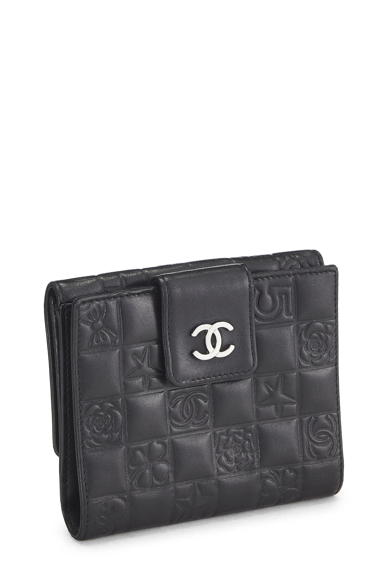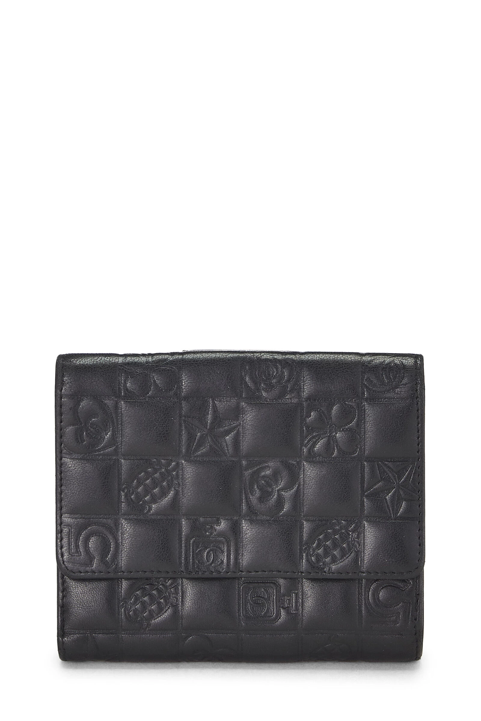 Vintage Chanel compact wallet crafted in black leather with embossed ‘Icon Charms’ from throughout the brand’s history featured on the exterior and finished with silver-plated hardware.