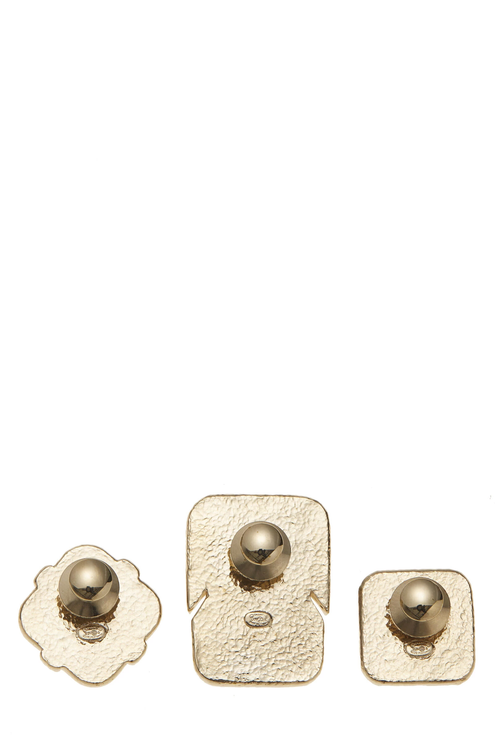 From Chanel’s Fall 2021 collection, this stylish pin set features shimmery black and white enamel , ‘CC’ and ‘5’ engraved accents, and crystal embellishments encased in ornately engraved gold-tone metal borders, reminiscent of 1920s Art Deco.