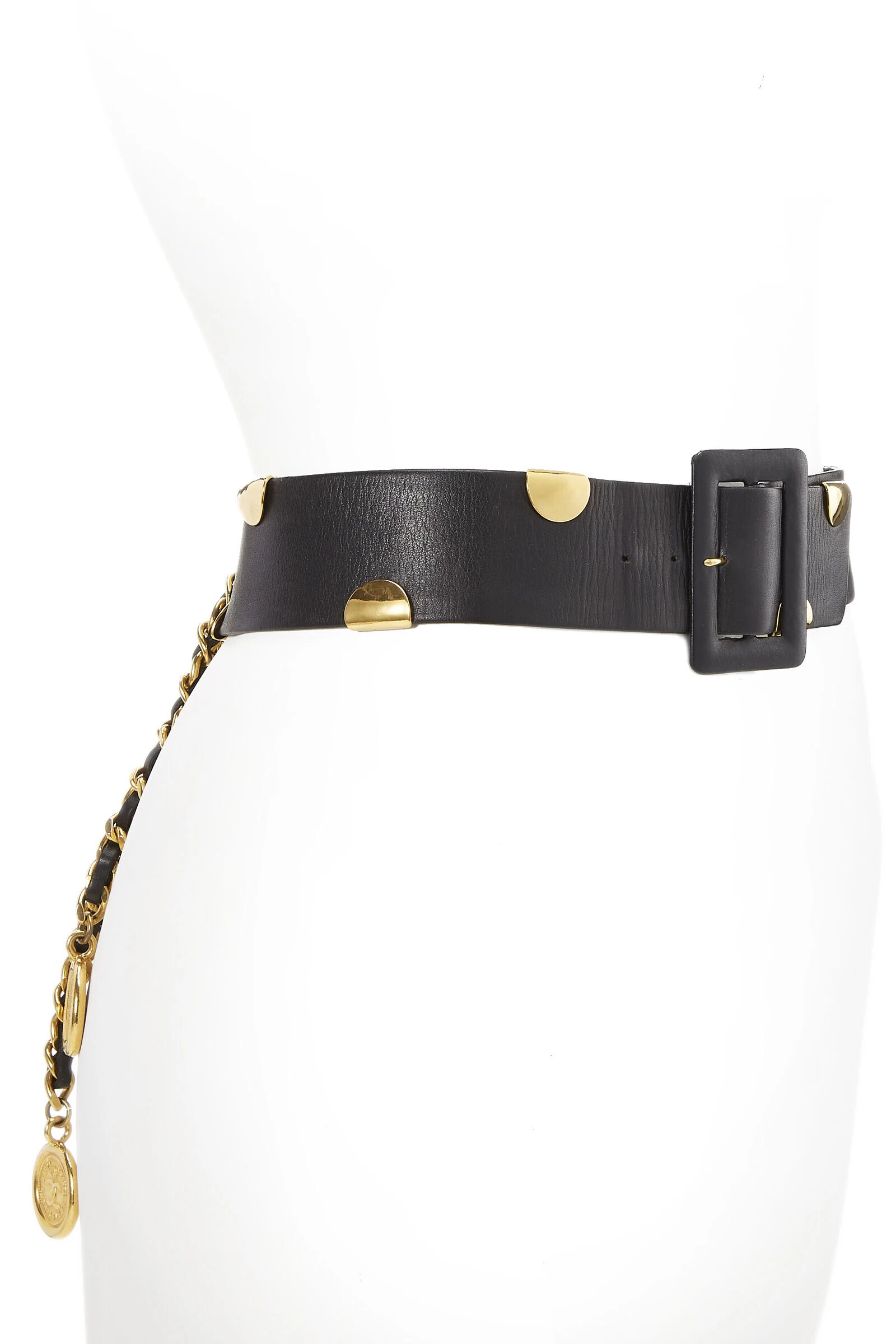 From Spring 1993 collection, a timeless companion for your hips, this Chanel belt comes crafted from head-turning black leather and gold-tone embellishments. Accented with two woven leather chain drops and ‘CC’ logo medallions. Size 70/28. Waist measures: 27″-29″