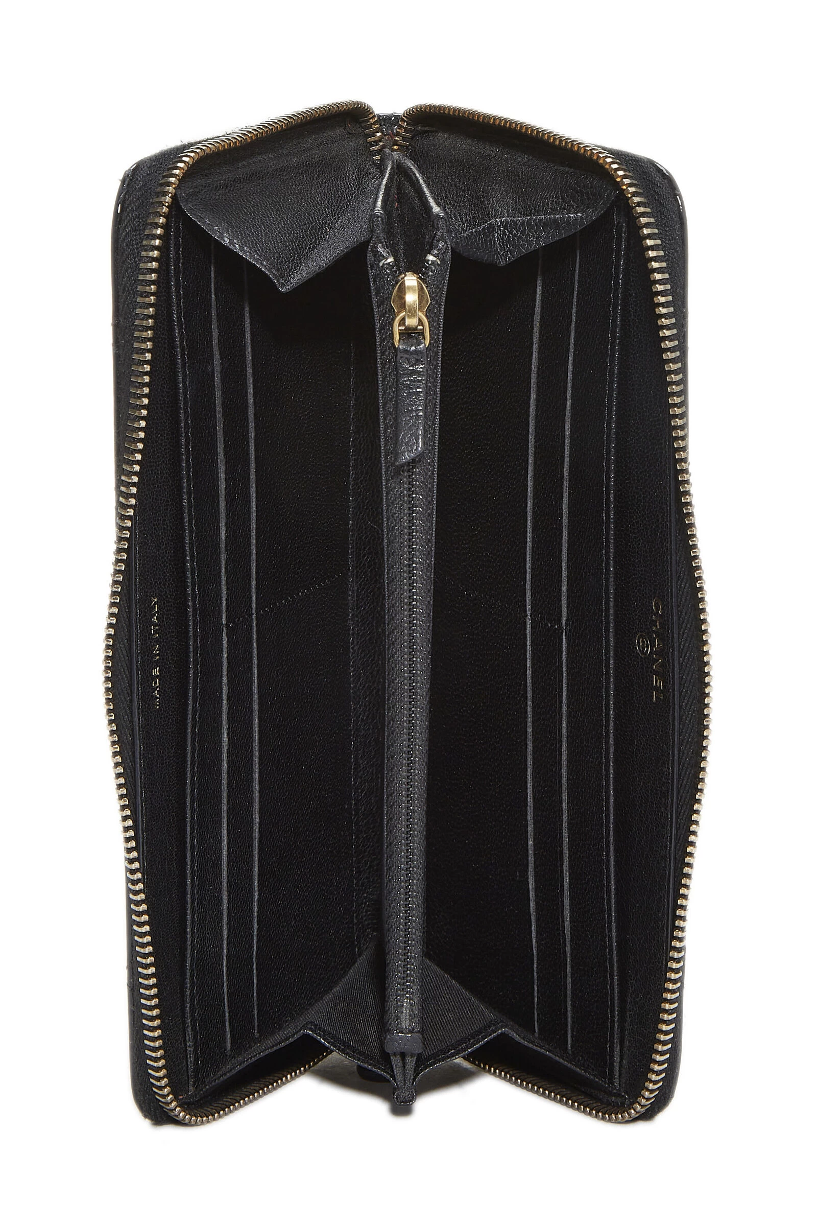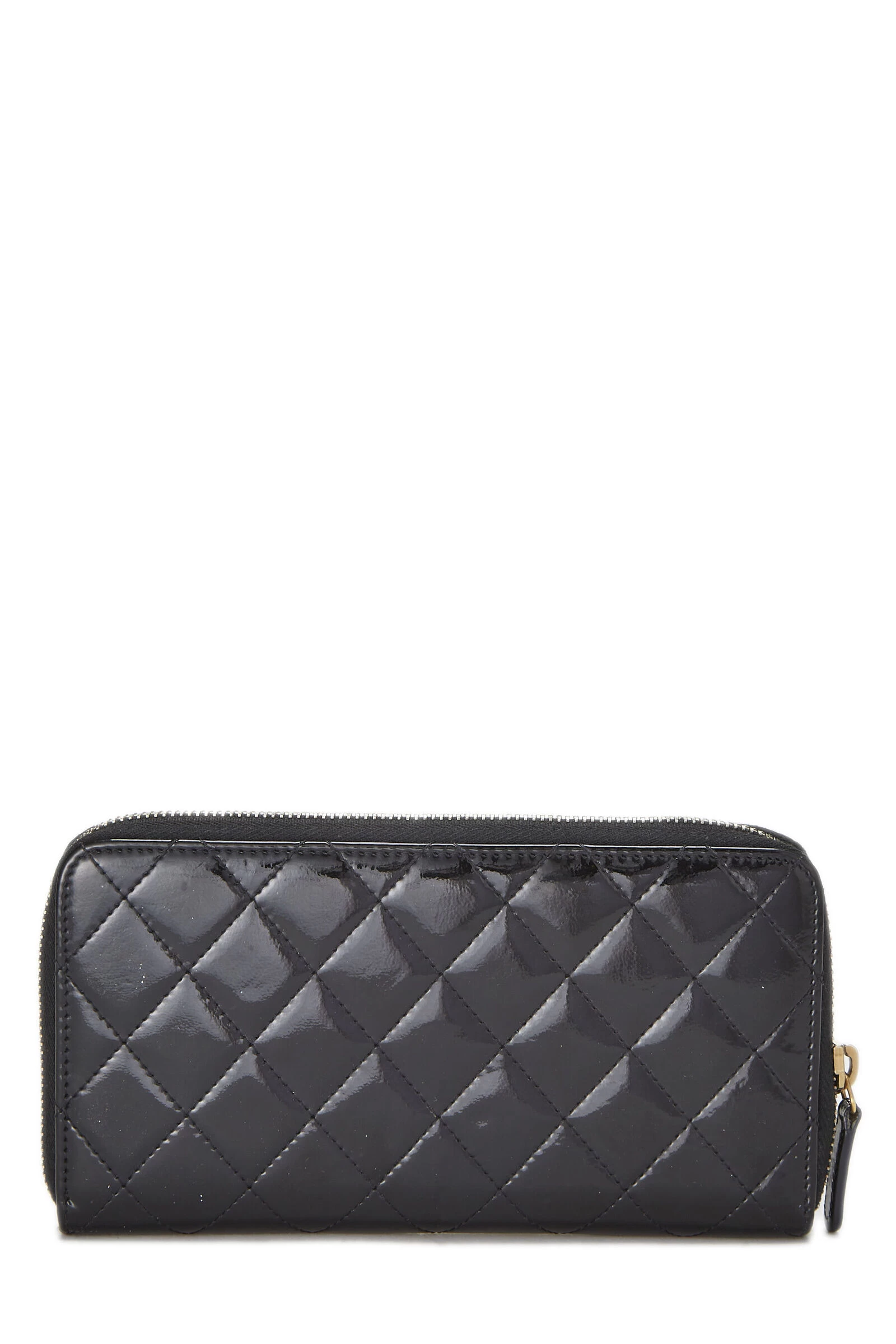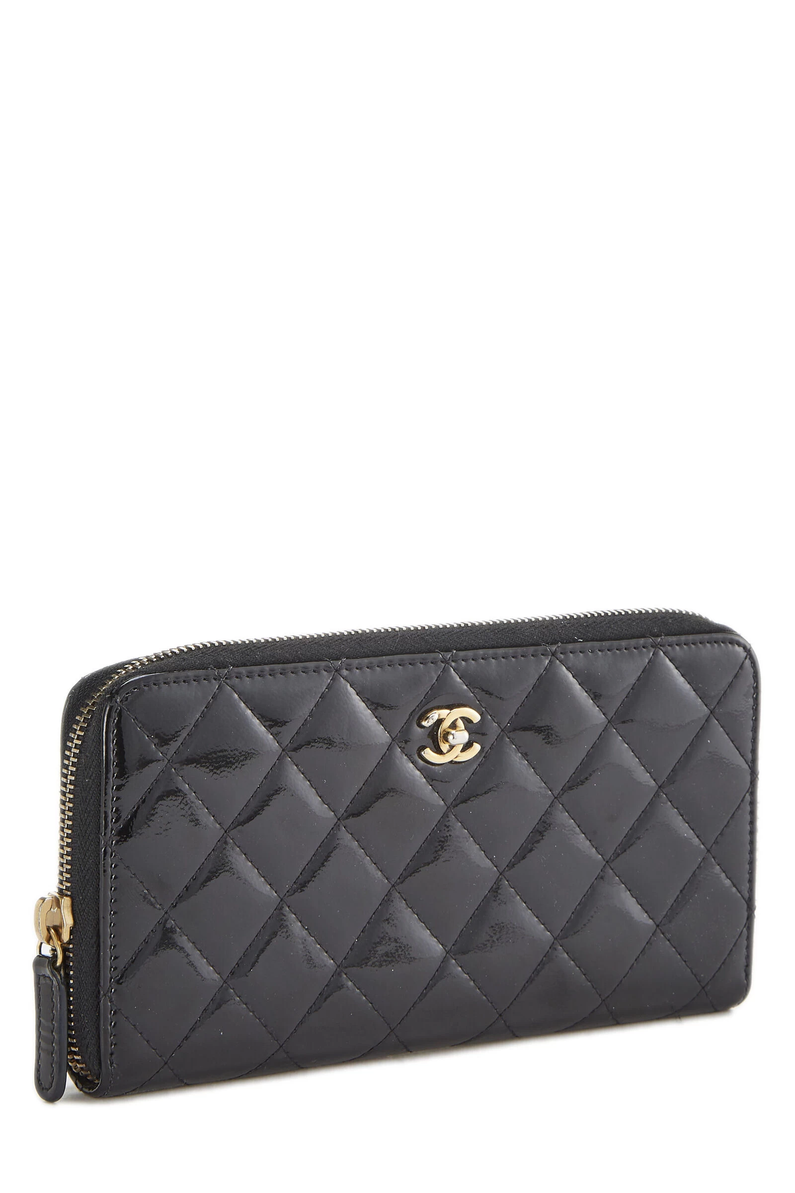 Chic Chanel zip-around wallet crafted in black diamond-quilted patent leather, featuring a black leather interior and finished with gold-tone hardware.