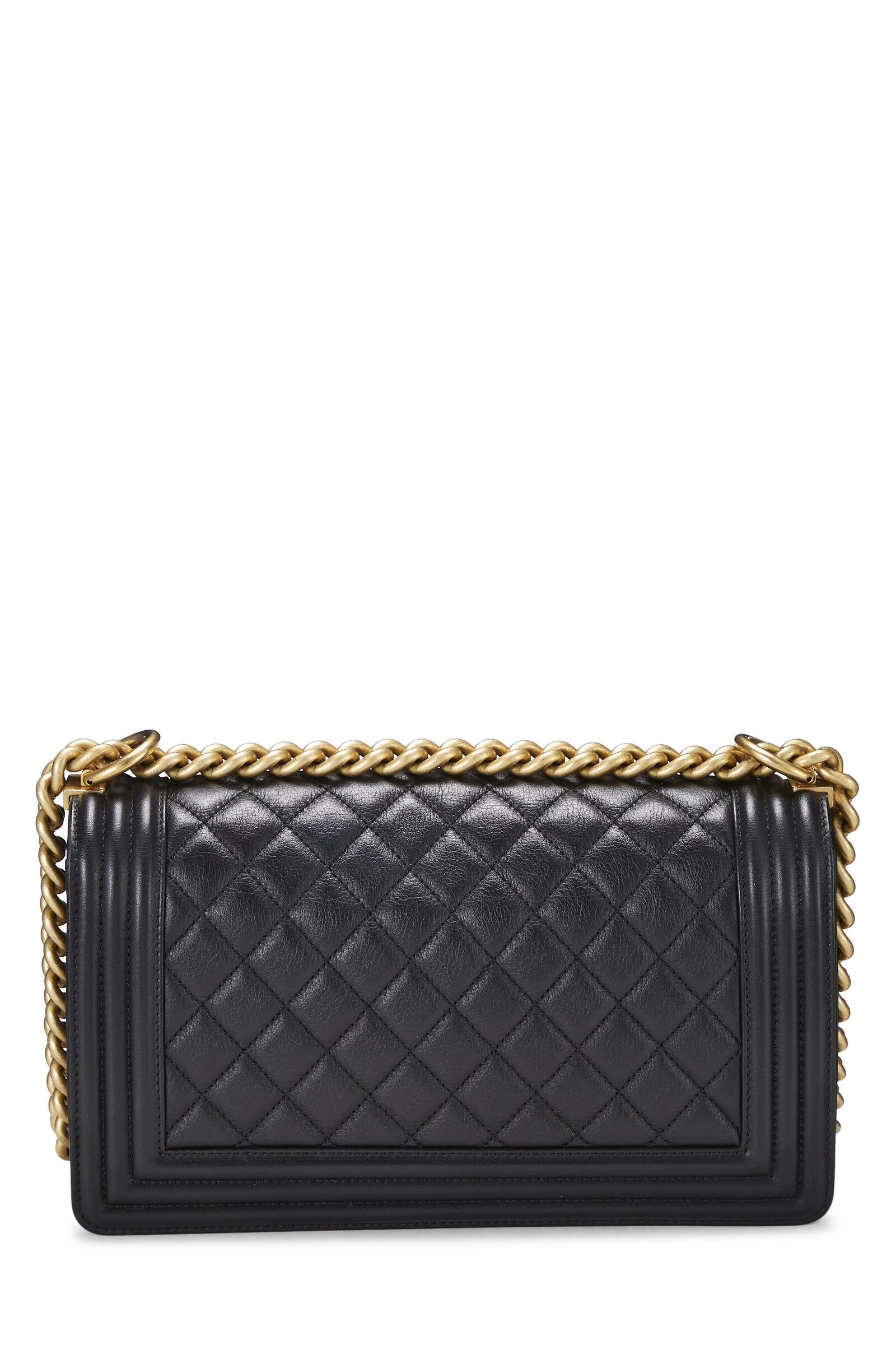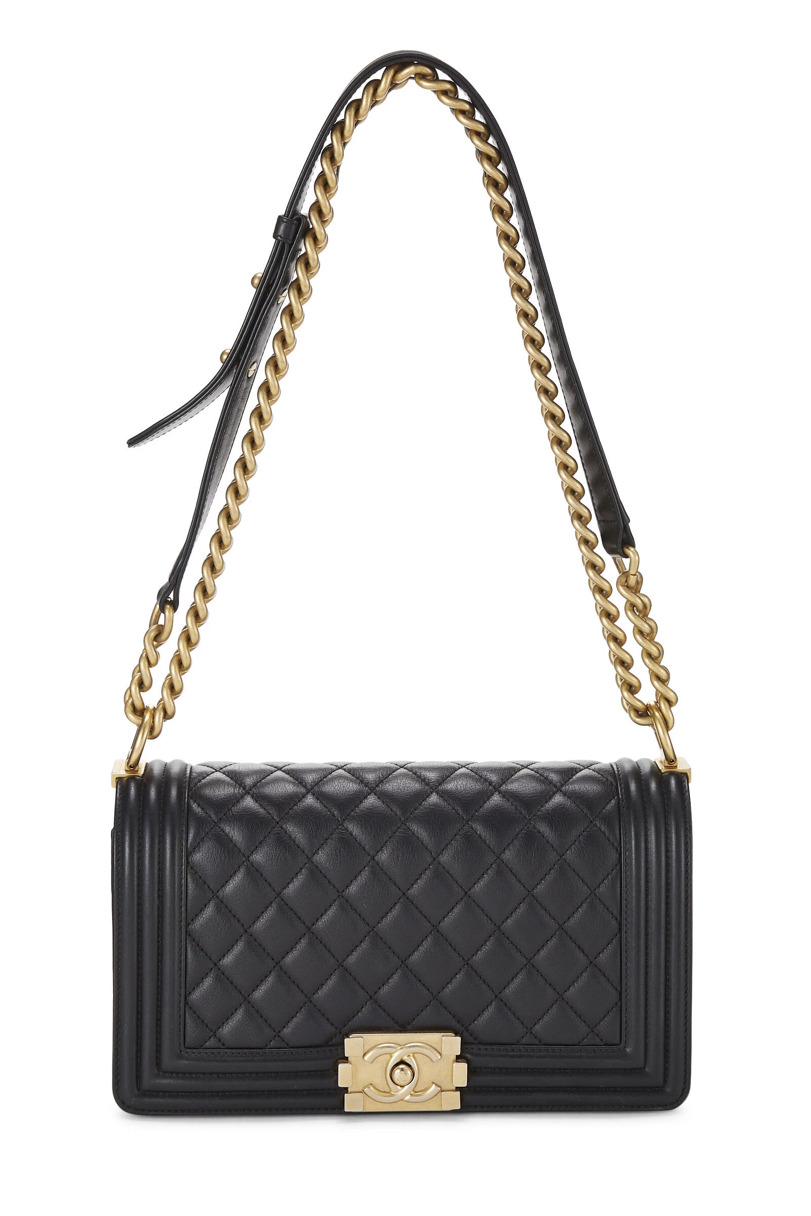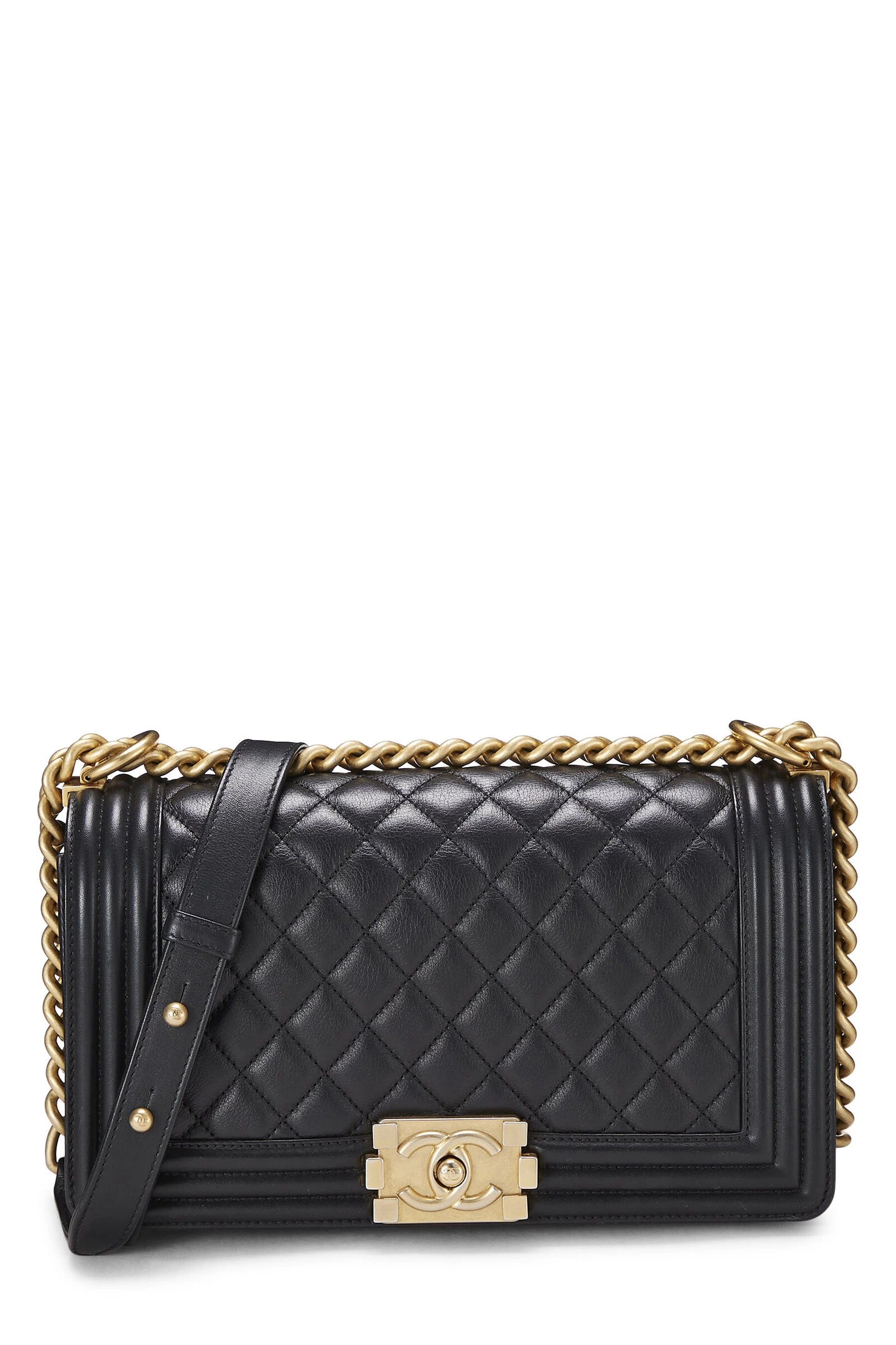 A classic and timeless Chanel style, this medium Boy Bag is rendered in black diamond-quilted calfskin leather, featuring tonal leather tri-border trim and finished with antiqued gold-tone chain hardware and the signature Boy push-lock closure.