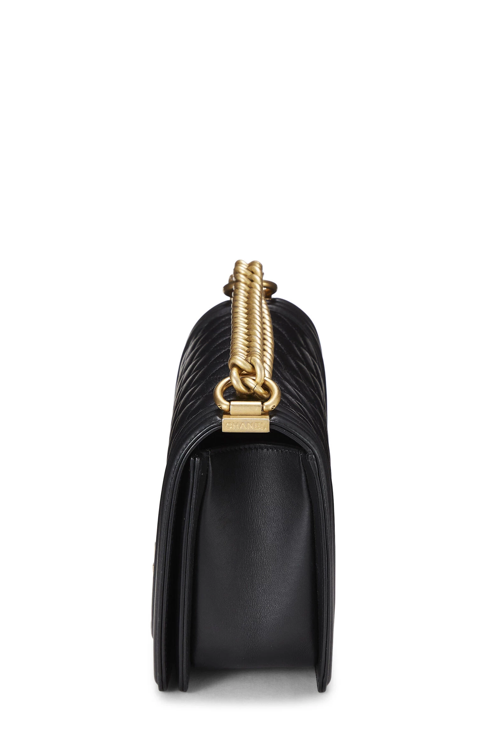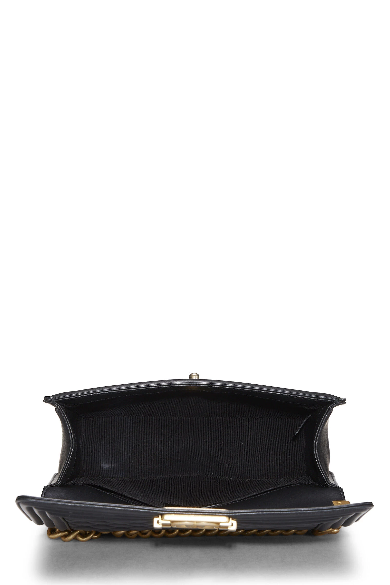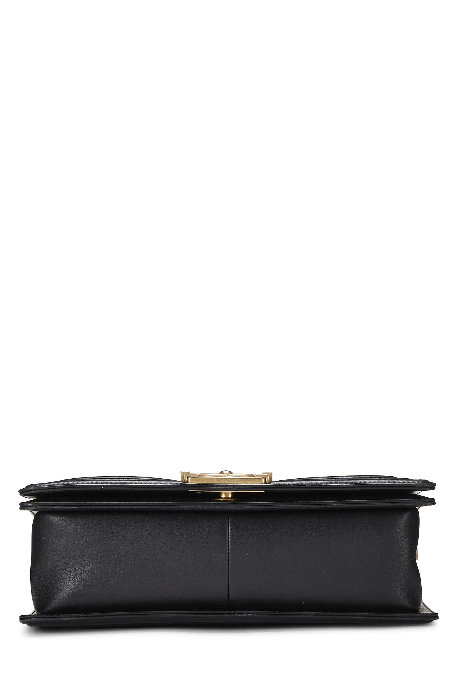 A classic and timeless Chanel style, this medium Boy Bag is rendered in black diamond-quilted calfskin leather, featuring tonal leather tri-border trim and finished with antiqued gold-tone chain hardware and the signature Boy push-lock closure.