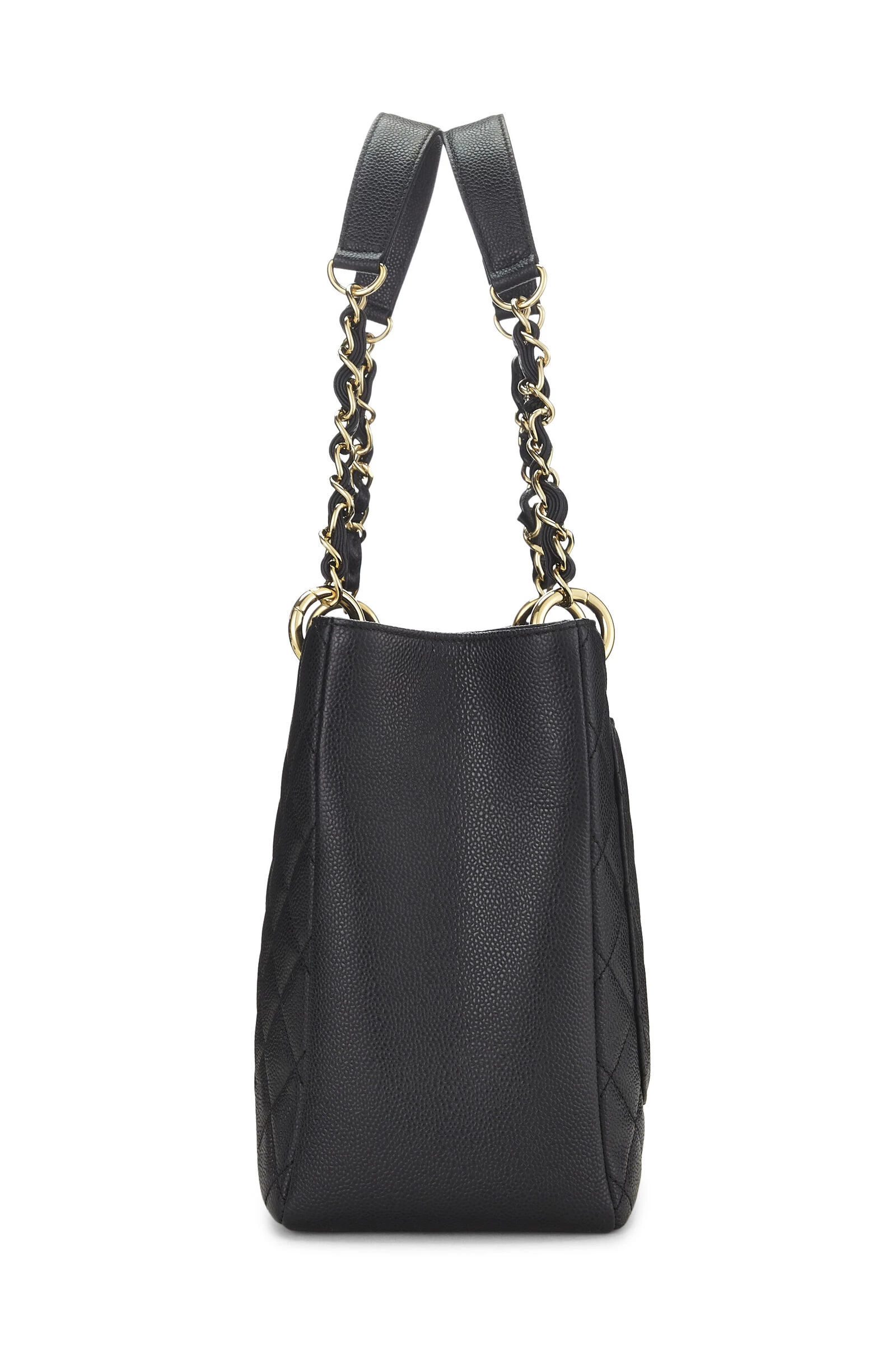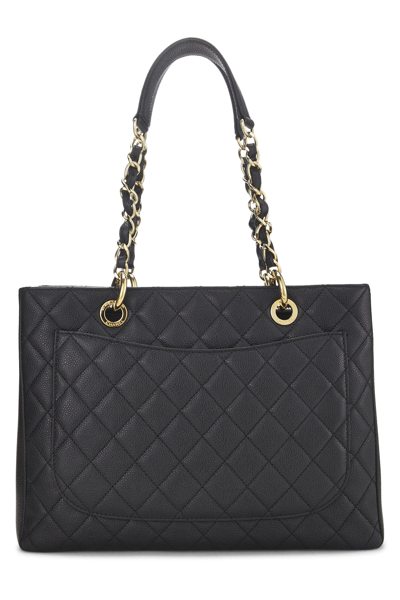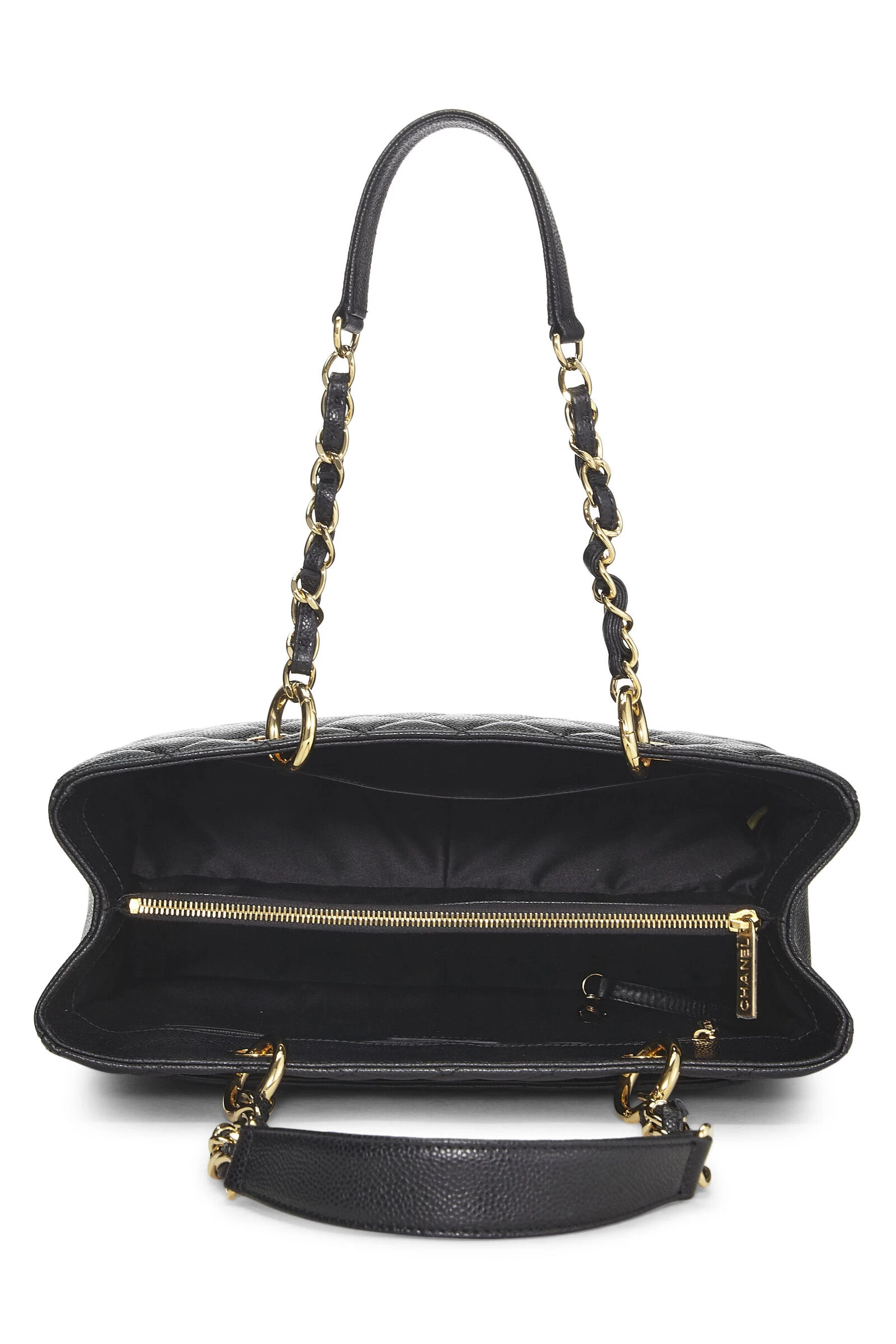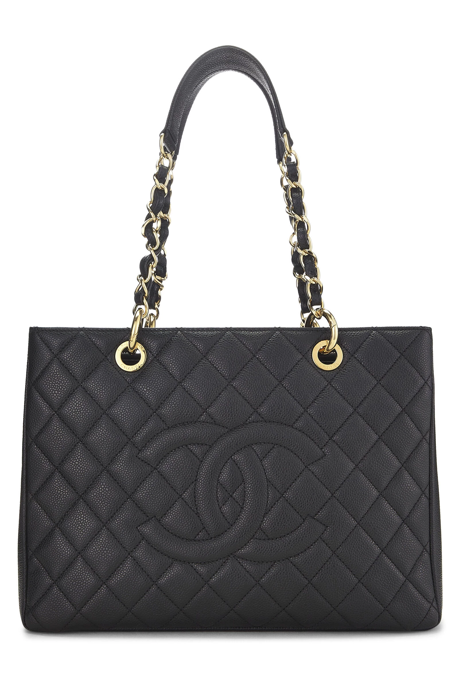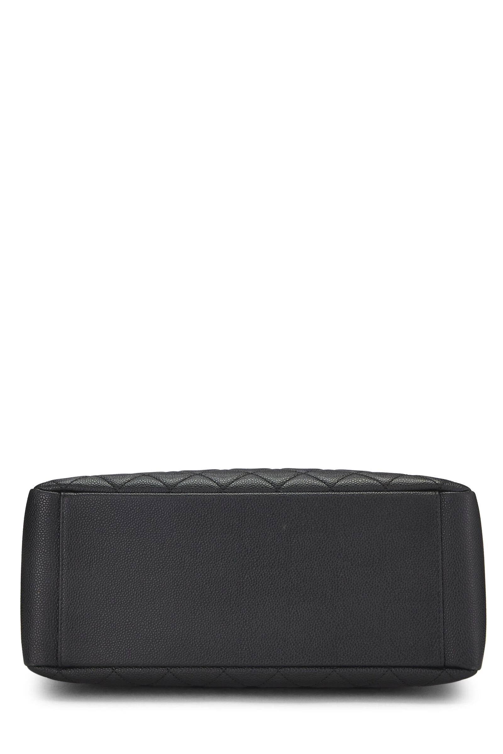 Classic Chanel Grand Shopping Tote (GST) rendered in black quilted Caviar leather, featuring interlocking ‘CC’ logo embroidery on front and finished with gold-tone chain-link hardware.