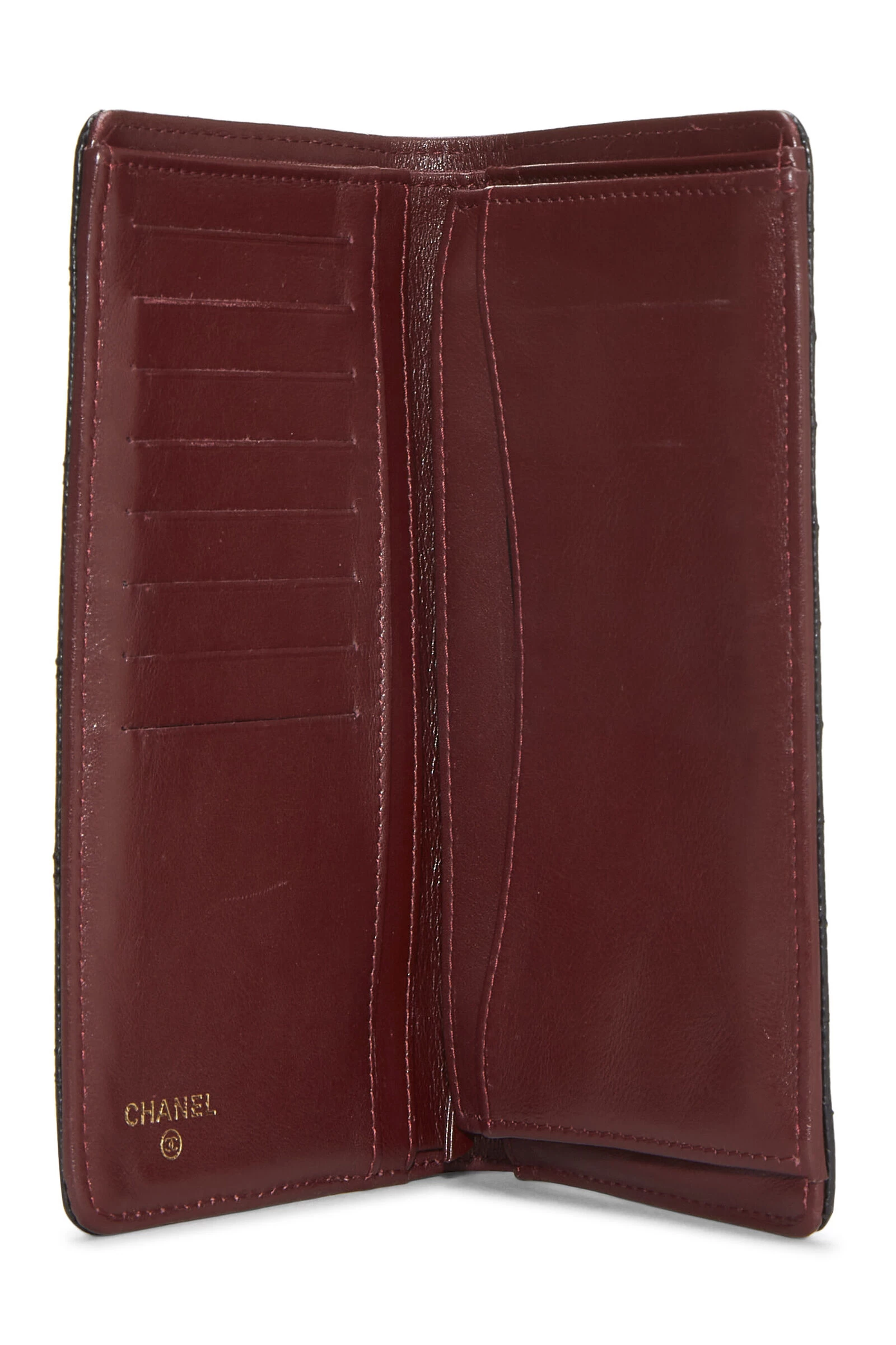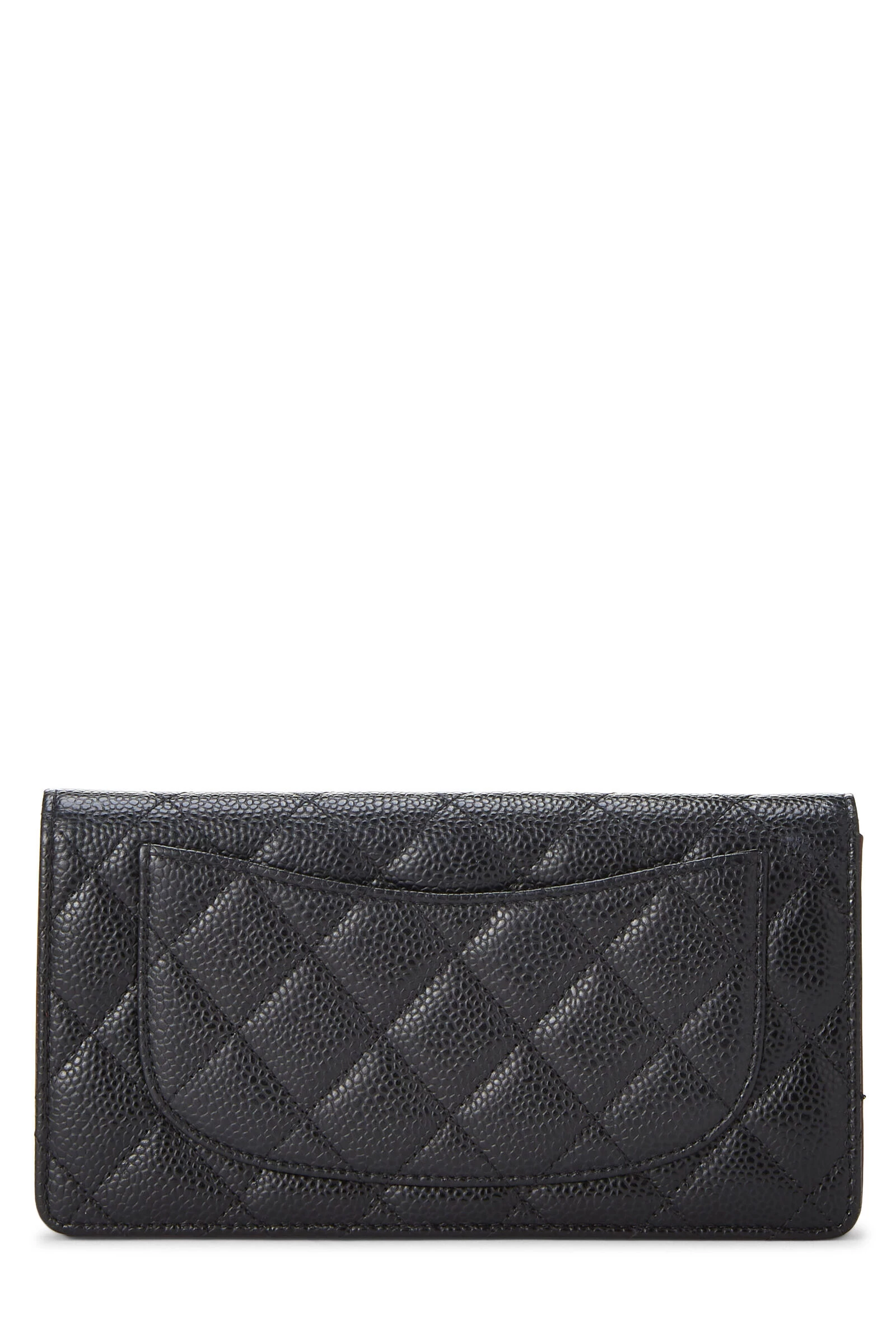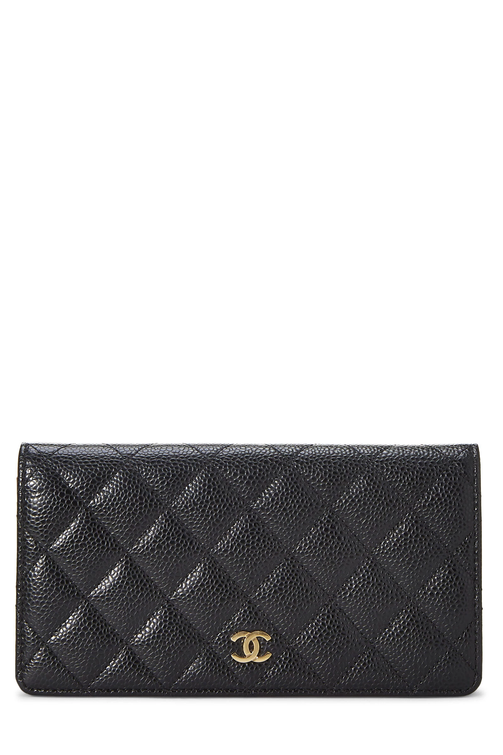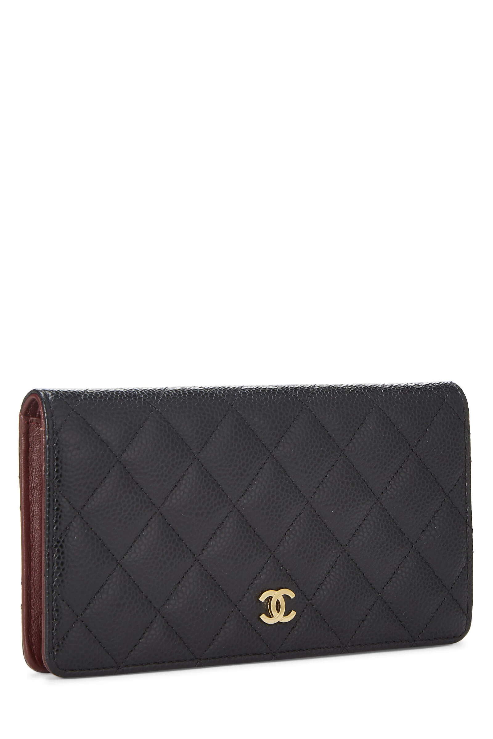 Sleek Chanel Yen wallet crafted in black grained Caviar leather with signature diamond quilting, featuring contrast burgundy leather interior and finished with gold-tone ‘CC’ logo hardware.