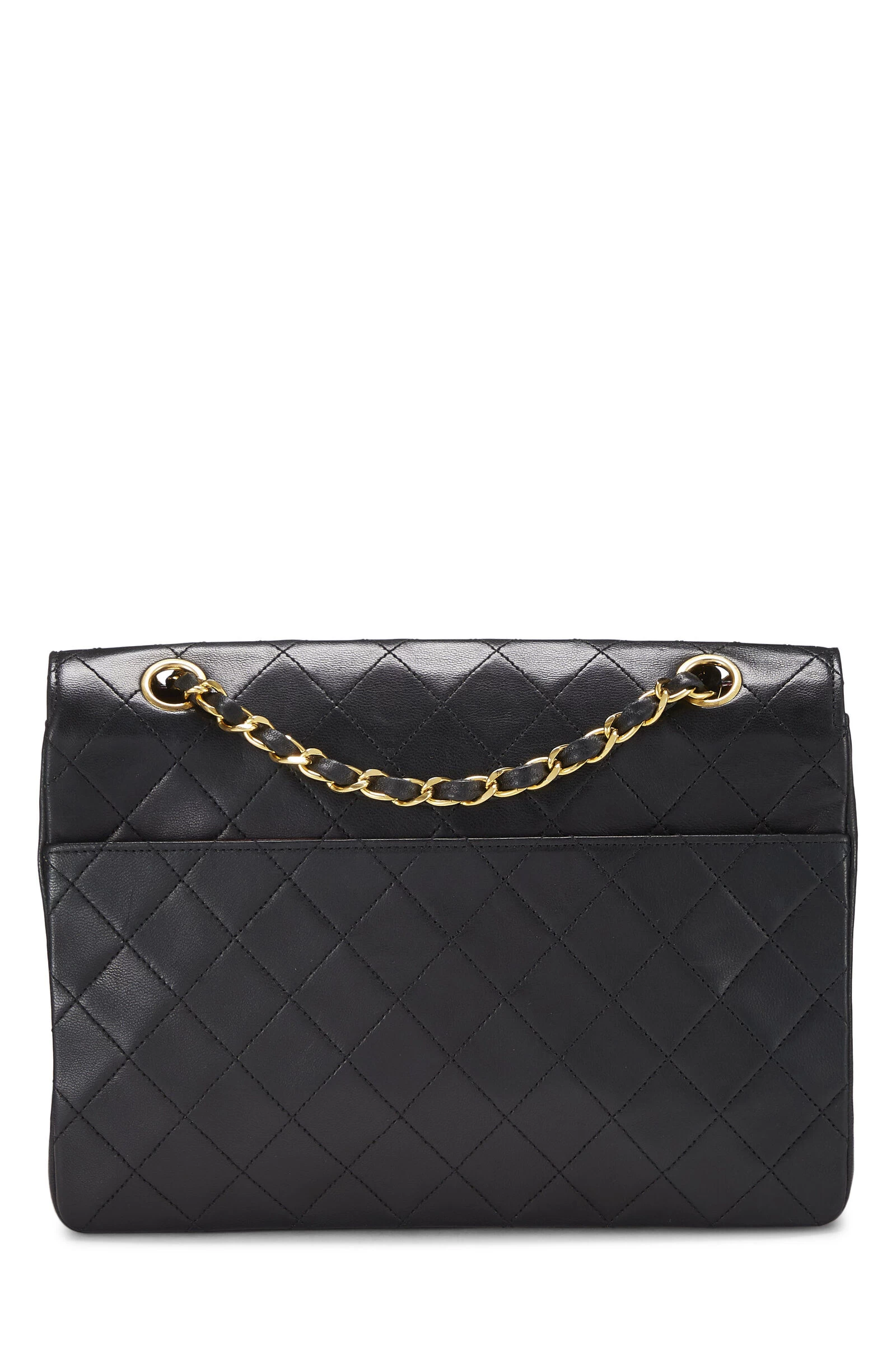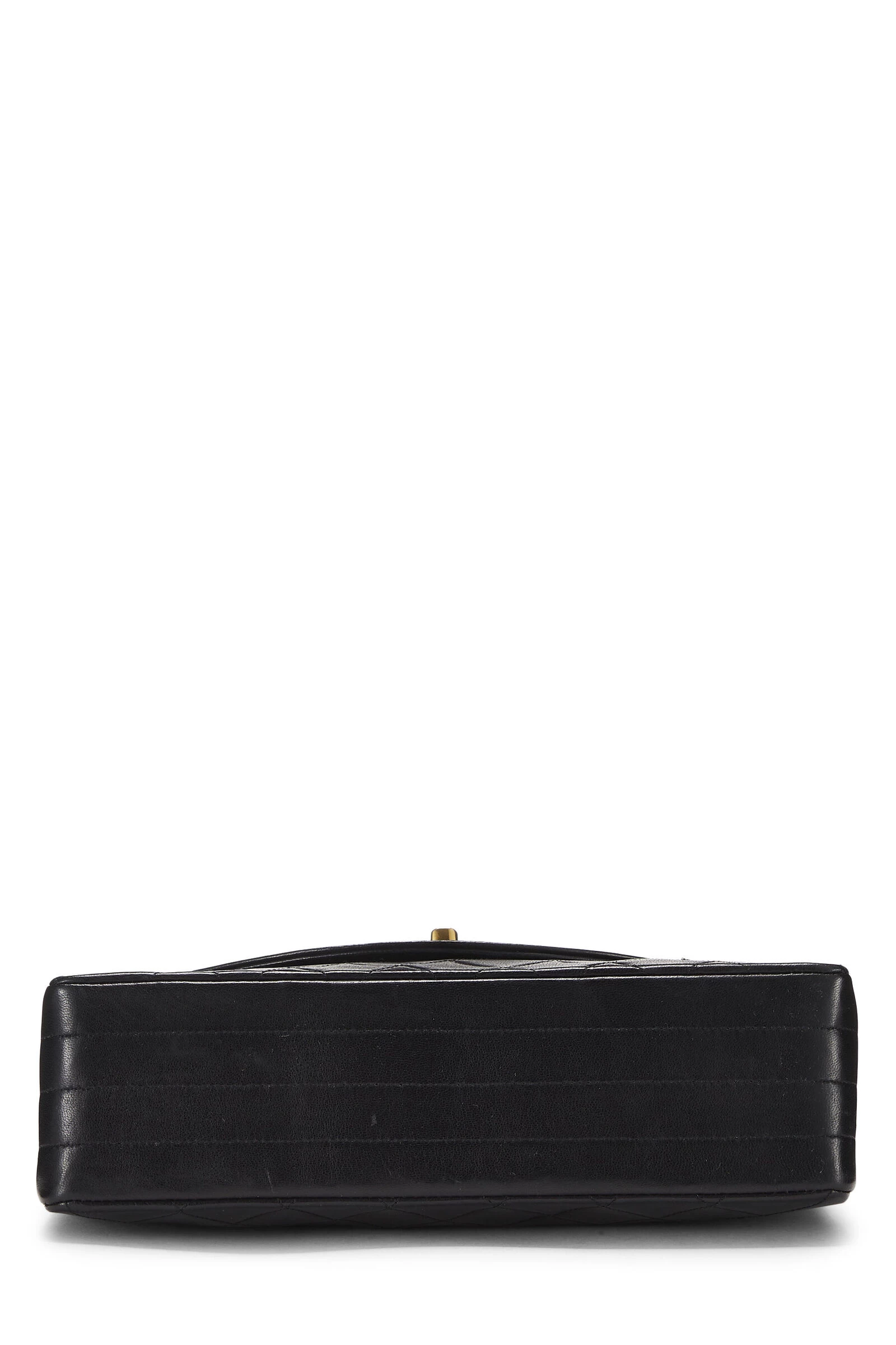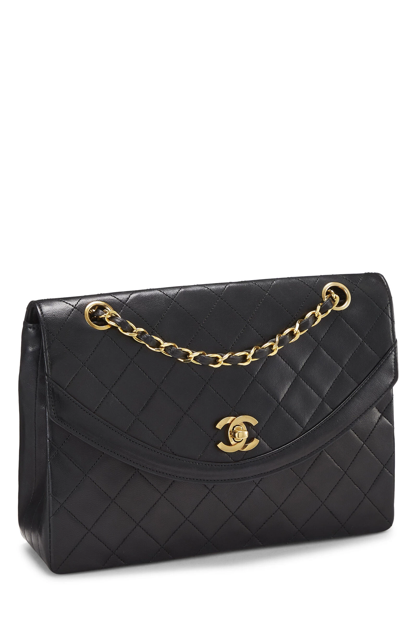 Vintage late 80s Chanel medium Round Flap bag crafted in black lambskin leather with the house’s signature diamond quilting, featuring a curved front flap finished in gold-plated metal ‘CC’ turnlock and chain hardware.