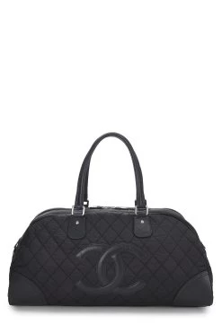 Classic Boston bag rendered in black quilted nylon featuring Chanel’s signature ‘CC’ logo in tonal calfskin at front.