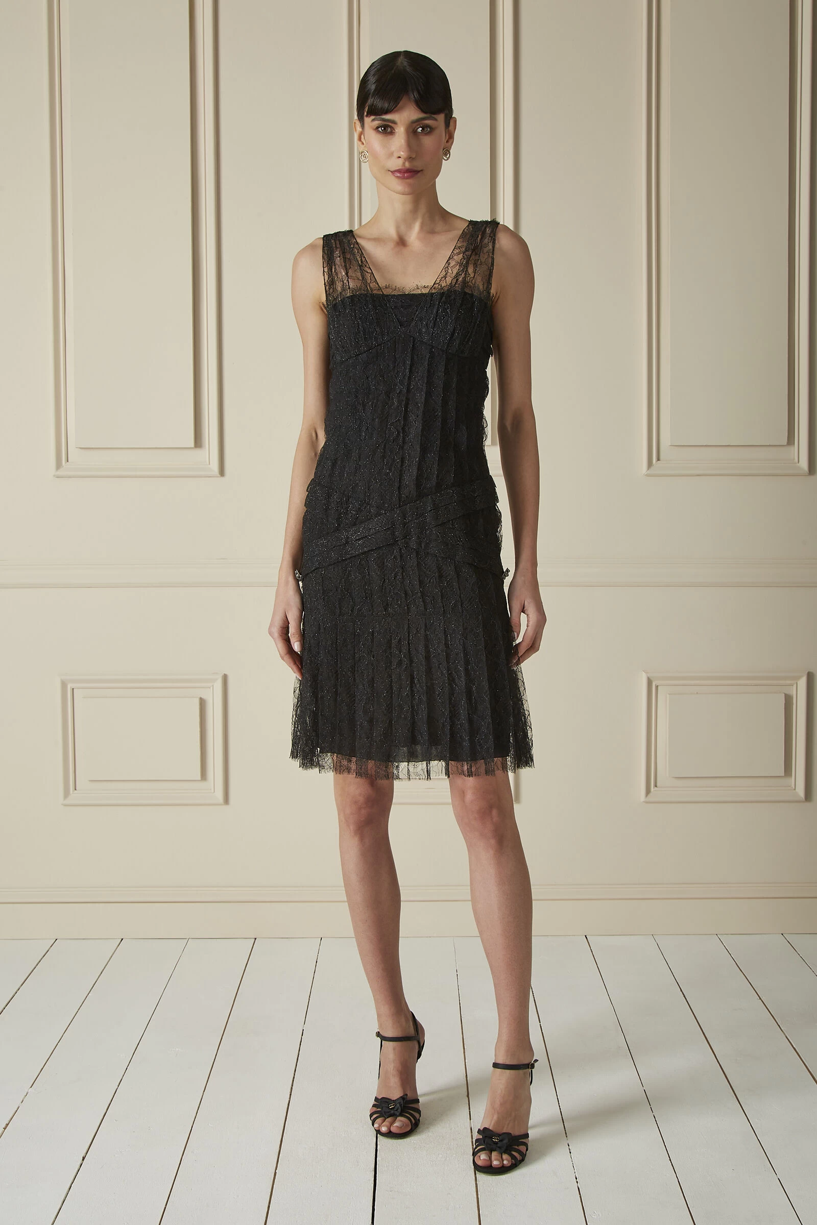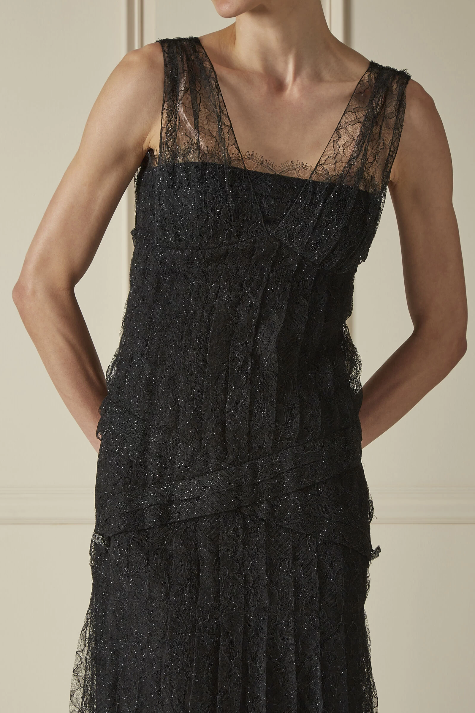 As elegant as it is glamorous, this Chanel black midi dress is crafted from glittering, pleated floral lace overlaid on tonal black silk. With criss-cross trim detailing on the front and a keyhole opening on the back, this sparkly dress is finished with ornate gunmetal-tone and clear Gripoix buttons.