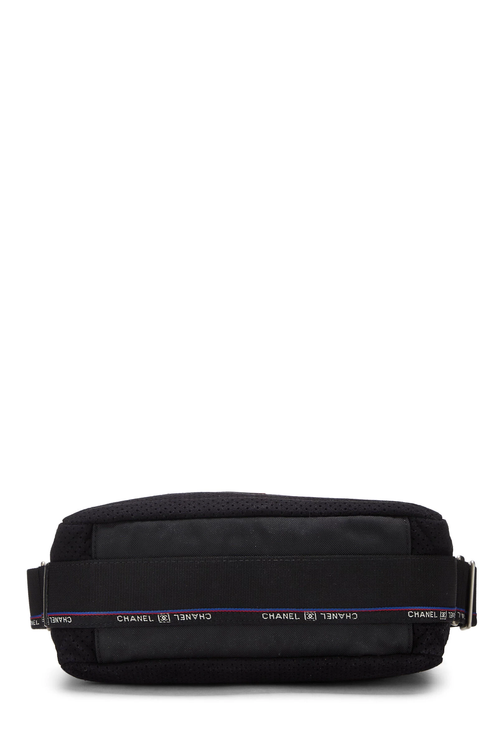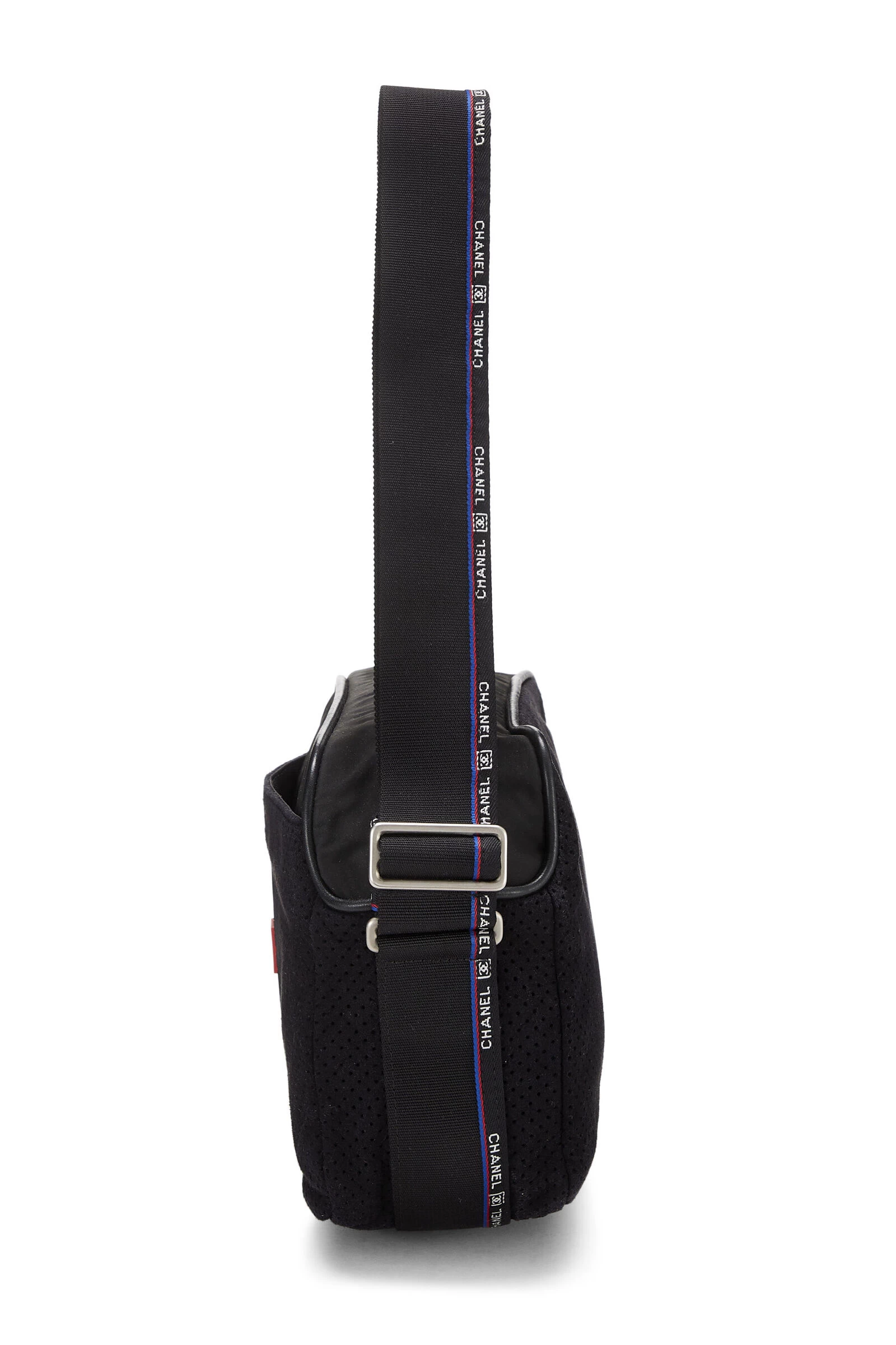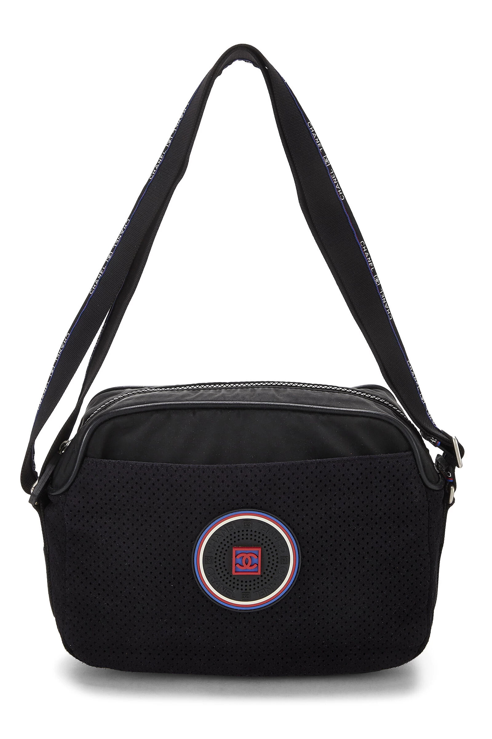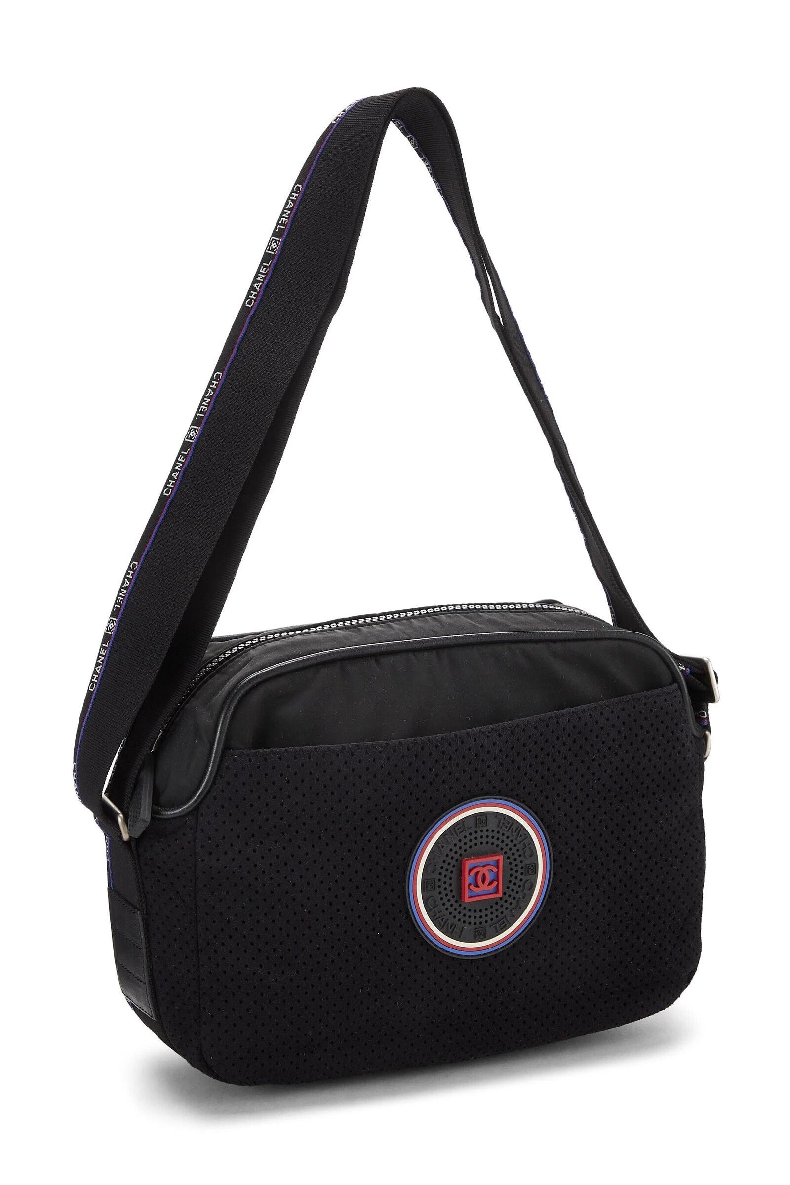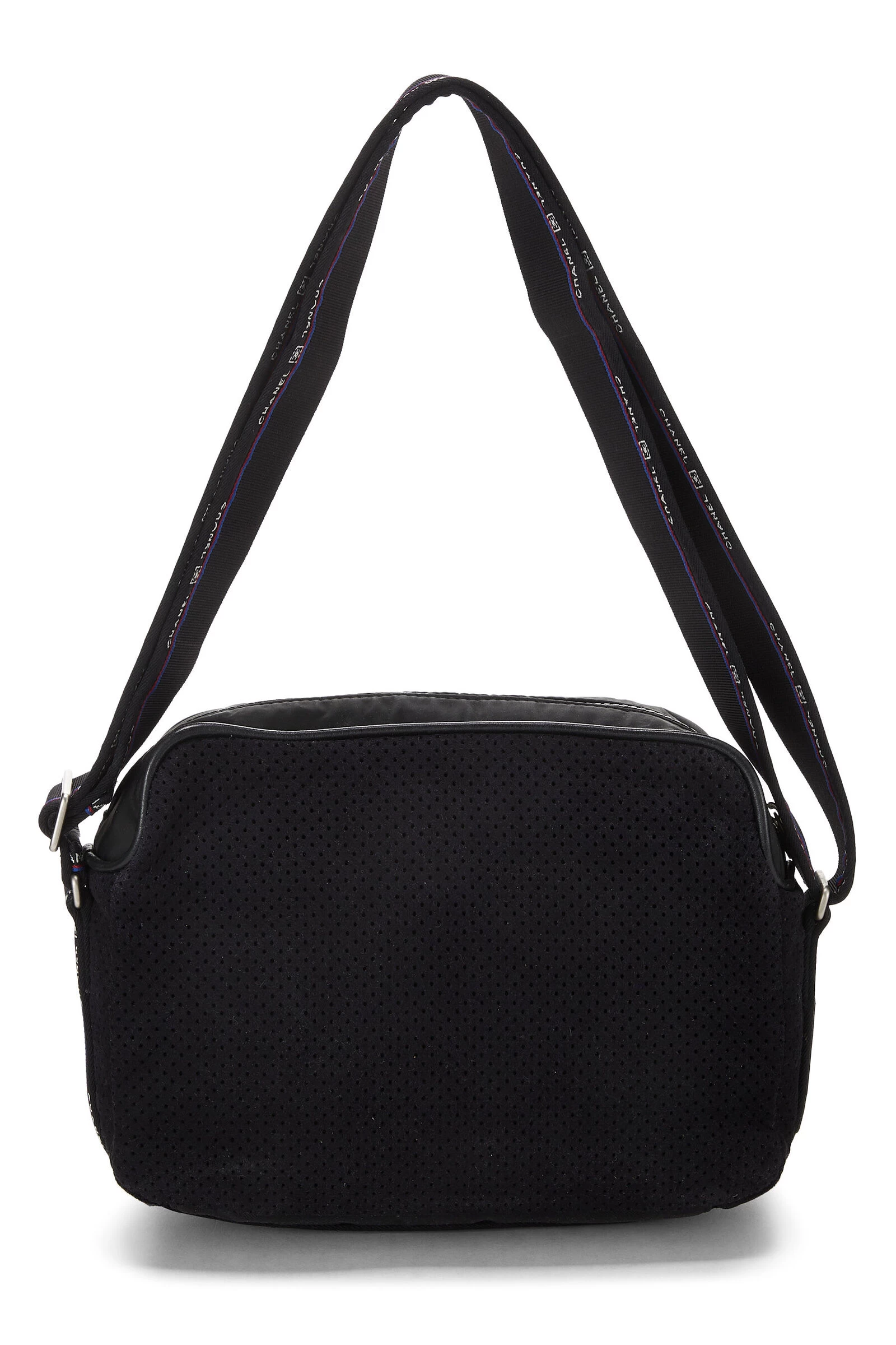 Chic and functional, this circular sportline shoulder bag is rendered in a mixture of perforated suede and nylon, with classic ‘CC’ logo on bag, along with adjustable canvas strap.