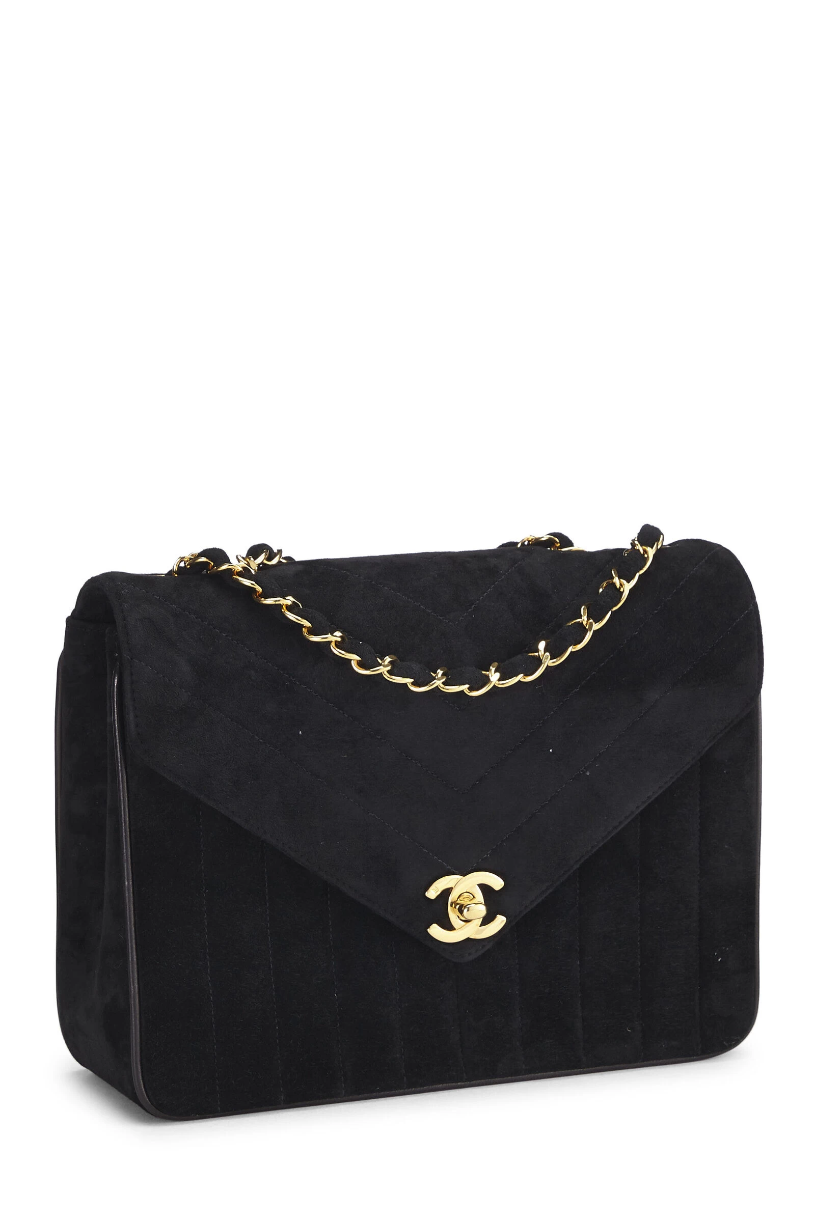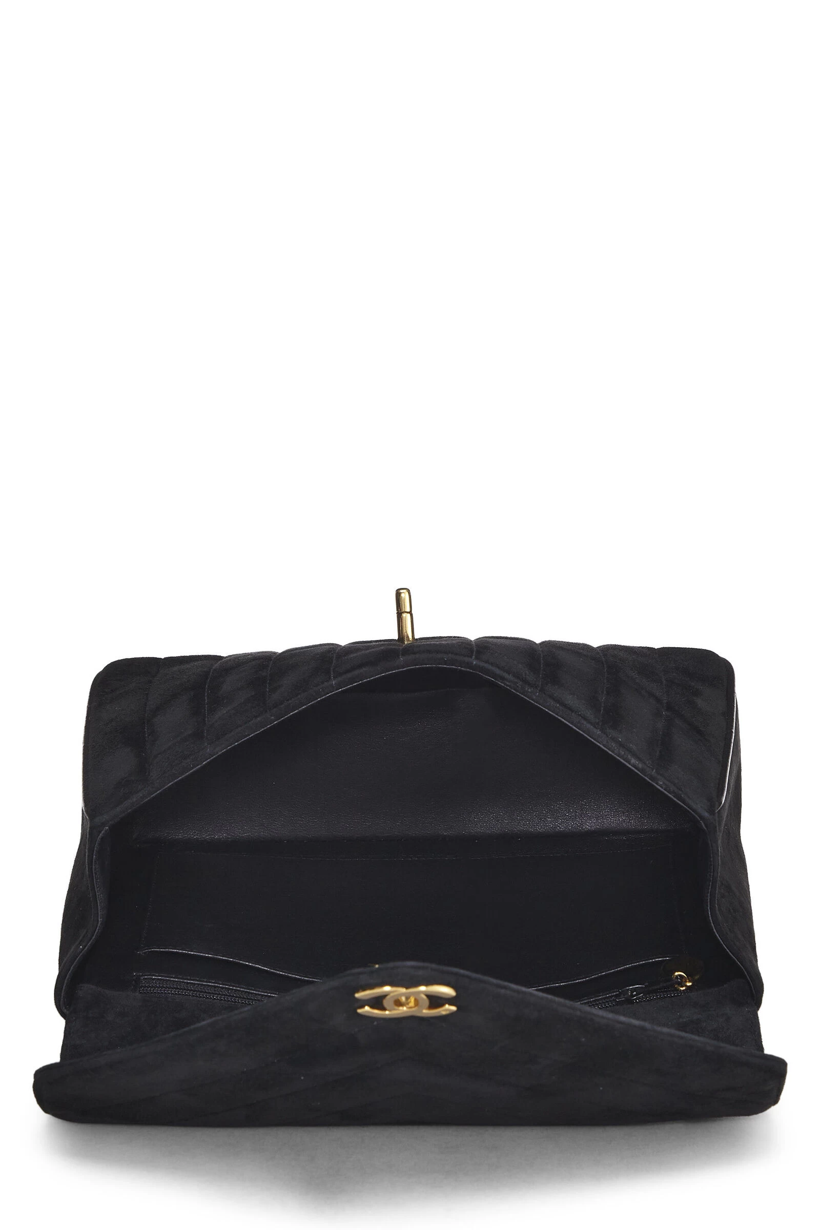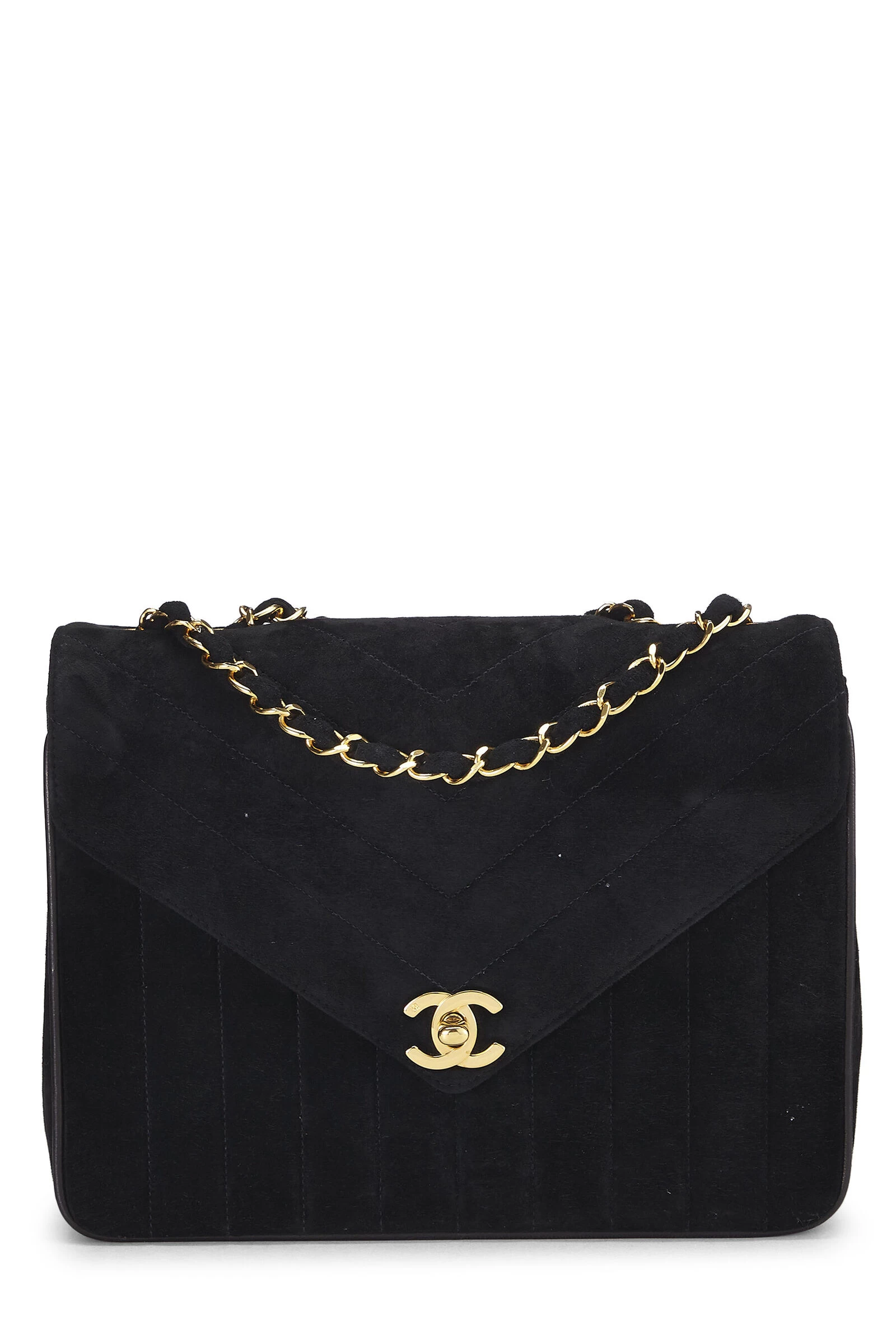 The perfect bag to jazz up any outfit, this Chanel flap bag is crafted in black chevron stitched suede, with black leather lining and finished with ‘CC’ turnlock closure at front envelope shaped flap.