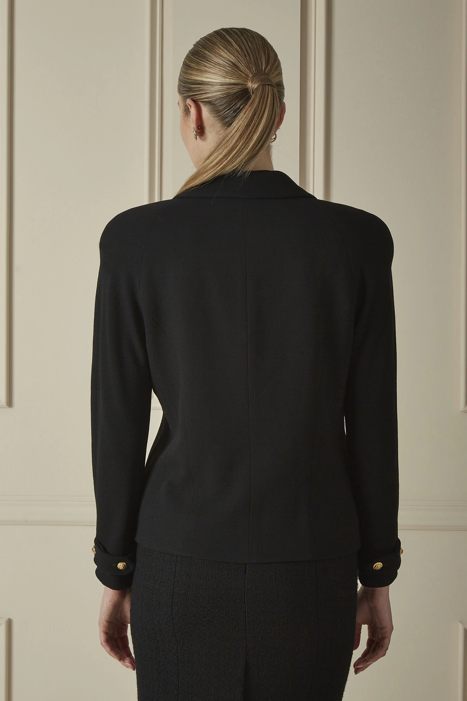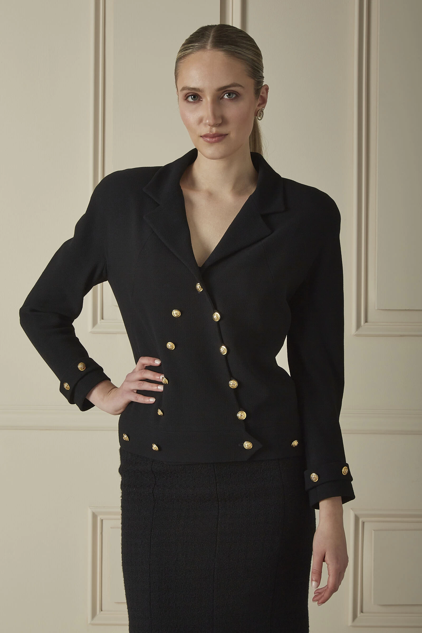 A very-vintage silhouette by Chanel, this jacket features a unique double-breasted construction and cites a V-shaped button design and ultra-padded shoulders. It was crafted with a wool exterior, lined in silk, and adorned with shiny gold-plated ‘CC’ hardware at every turn. Pair yours with your favorite jeans and sleek, pointed-toe pumps for your next evening plans.