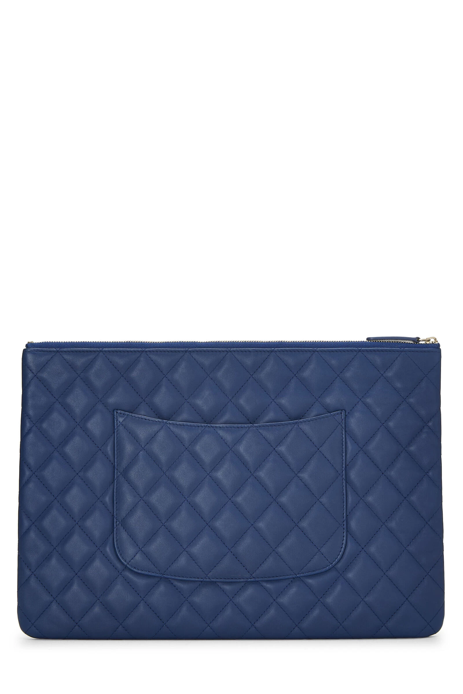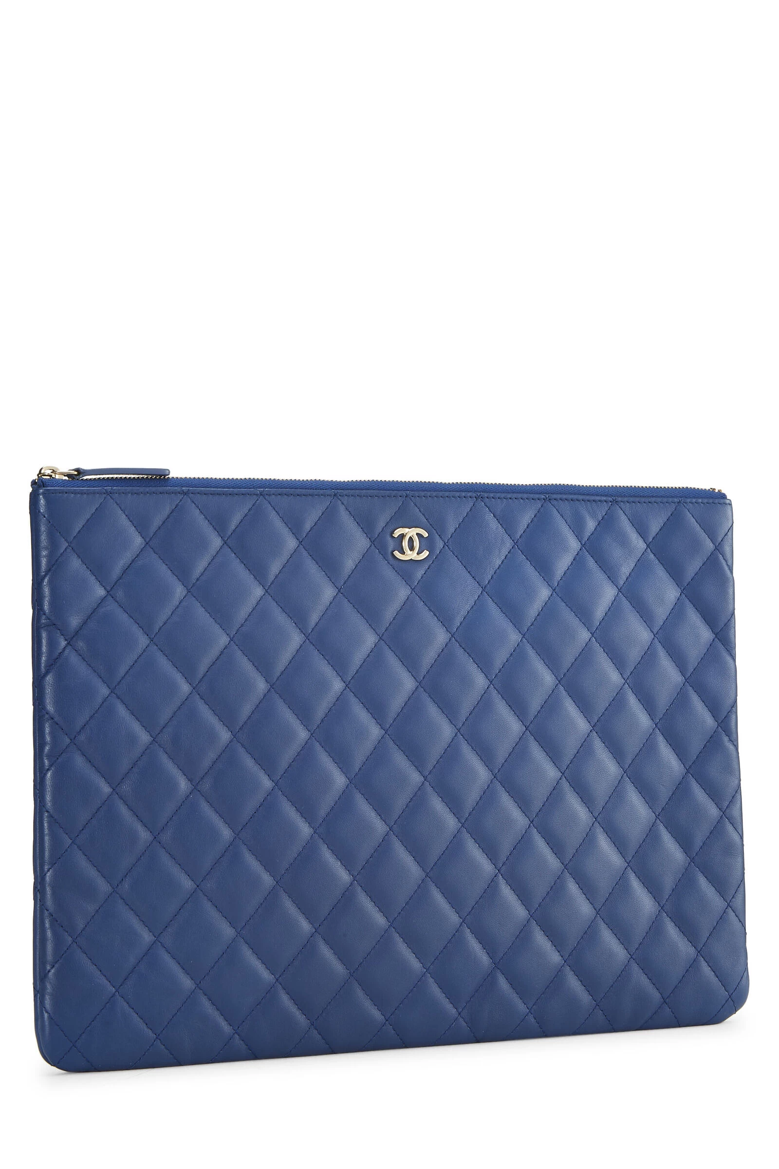 Large Chanel O Case zip pouch crafted in blue lambskin leather, featuring signature diamond quilting and gold-tone ‘CC’ logo hardware at front.