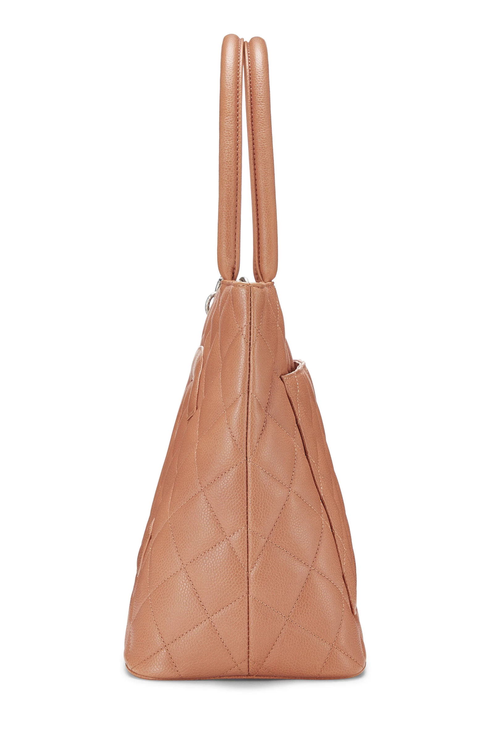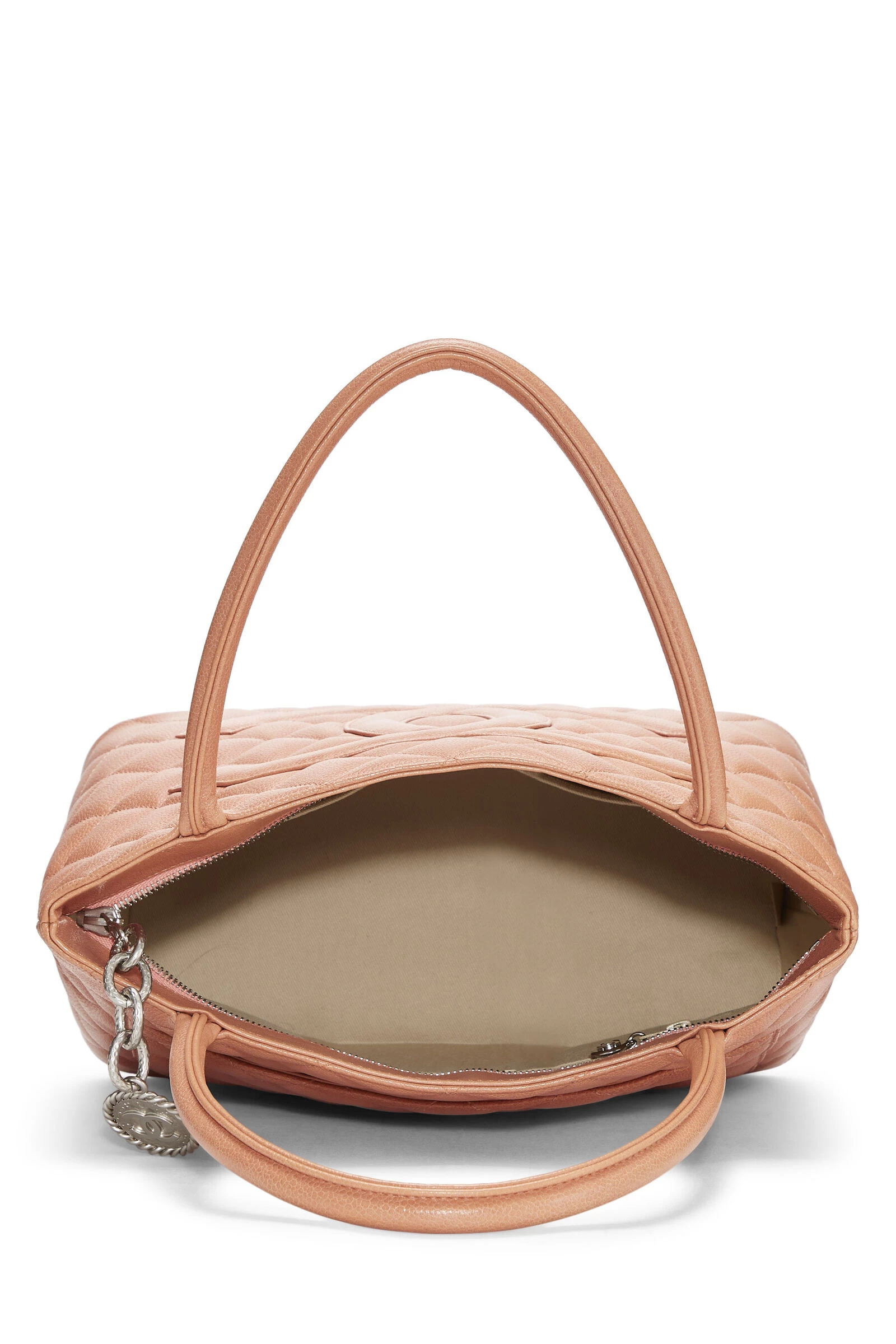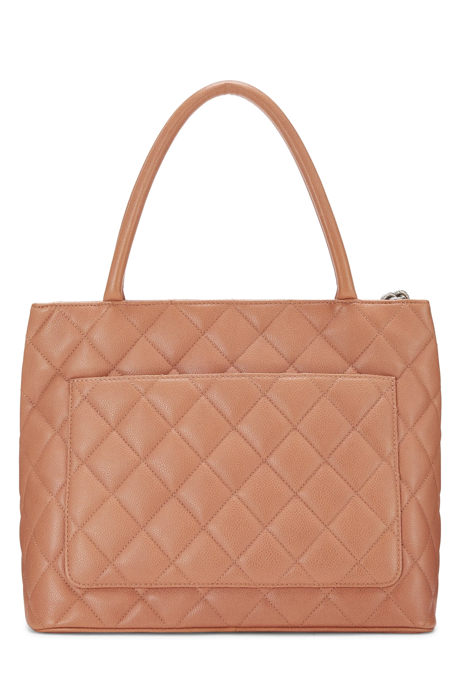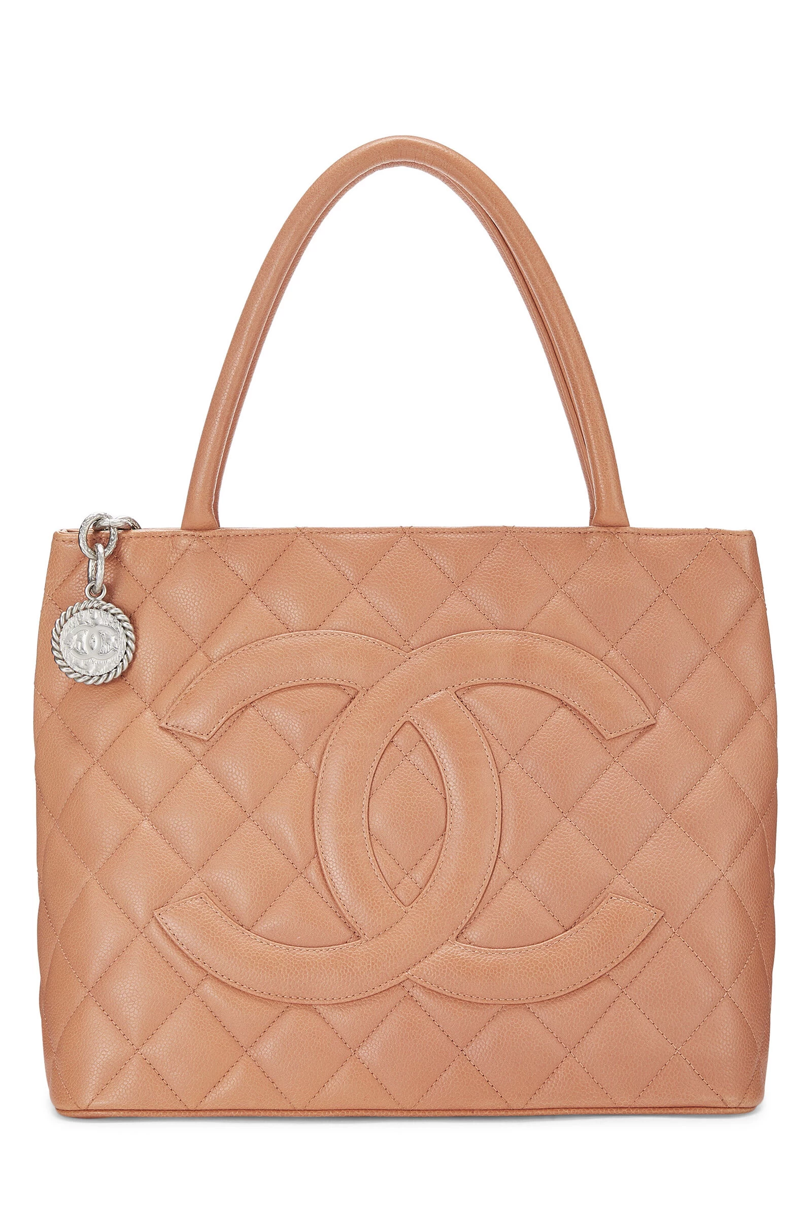 A timeless classic, this Chanel Medallion tote is rendered in coral pink grained Caviar leather with the house’s signature diamond quilting, featuring a large interlocking ‘CC’ appliqué, and finished with a silver-tone hammered chain zipper pull and an engraved ‘CC’ medallion charm.