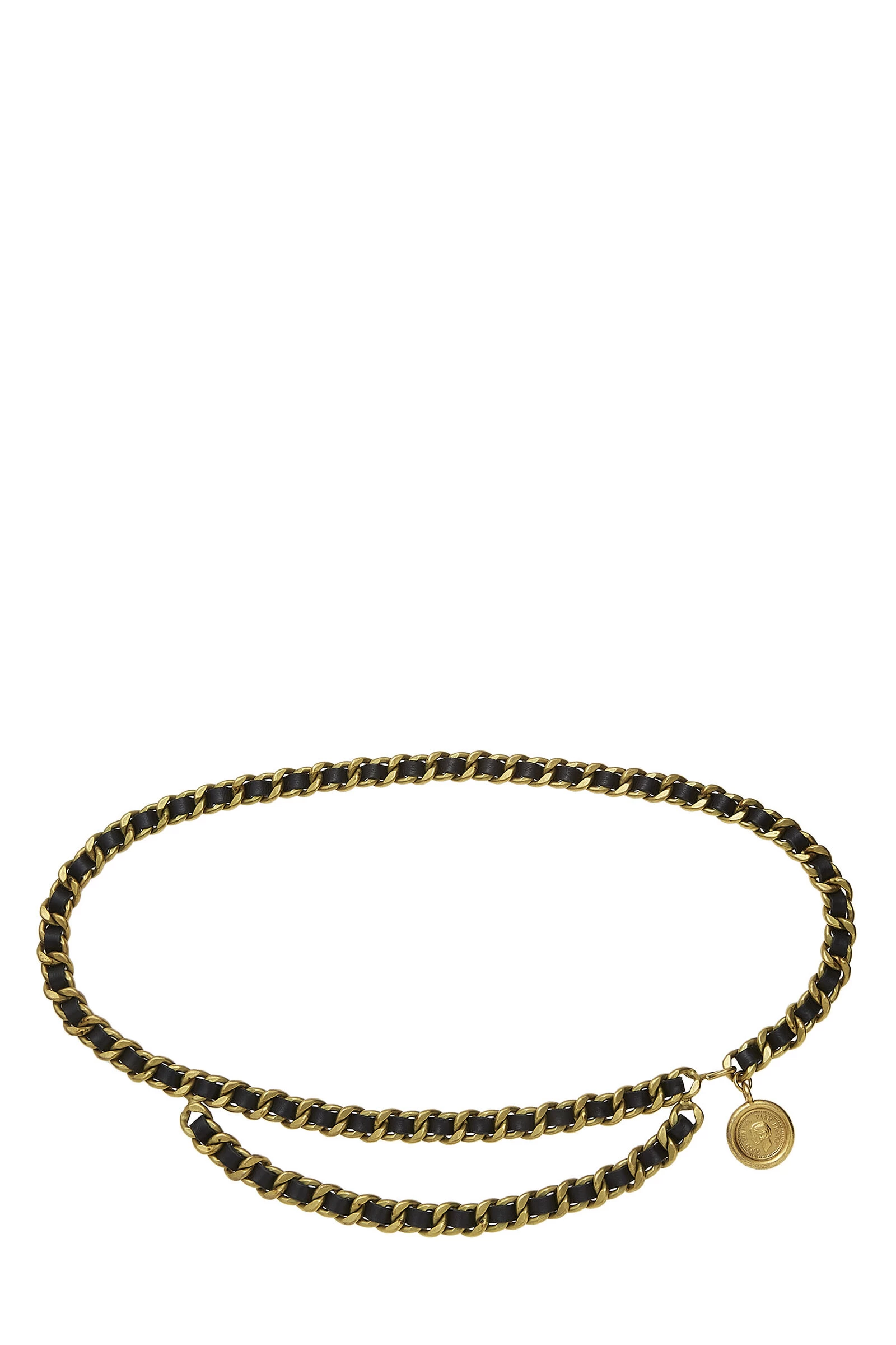 Vintage Fall 1994 Chanel chain belt crafted in gold-plated hardware with woven black leather, featuring a draped second chain and ‘CC’ logo pendant. Closure can be hooked on multiple links for a variety of fits.
