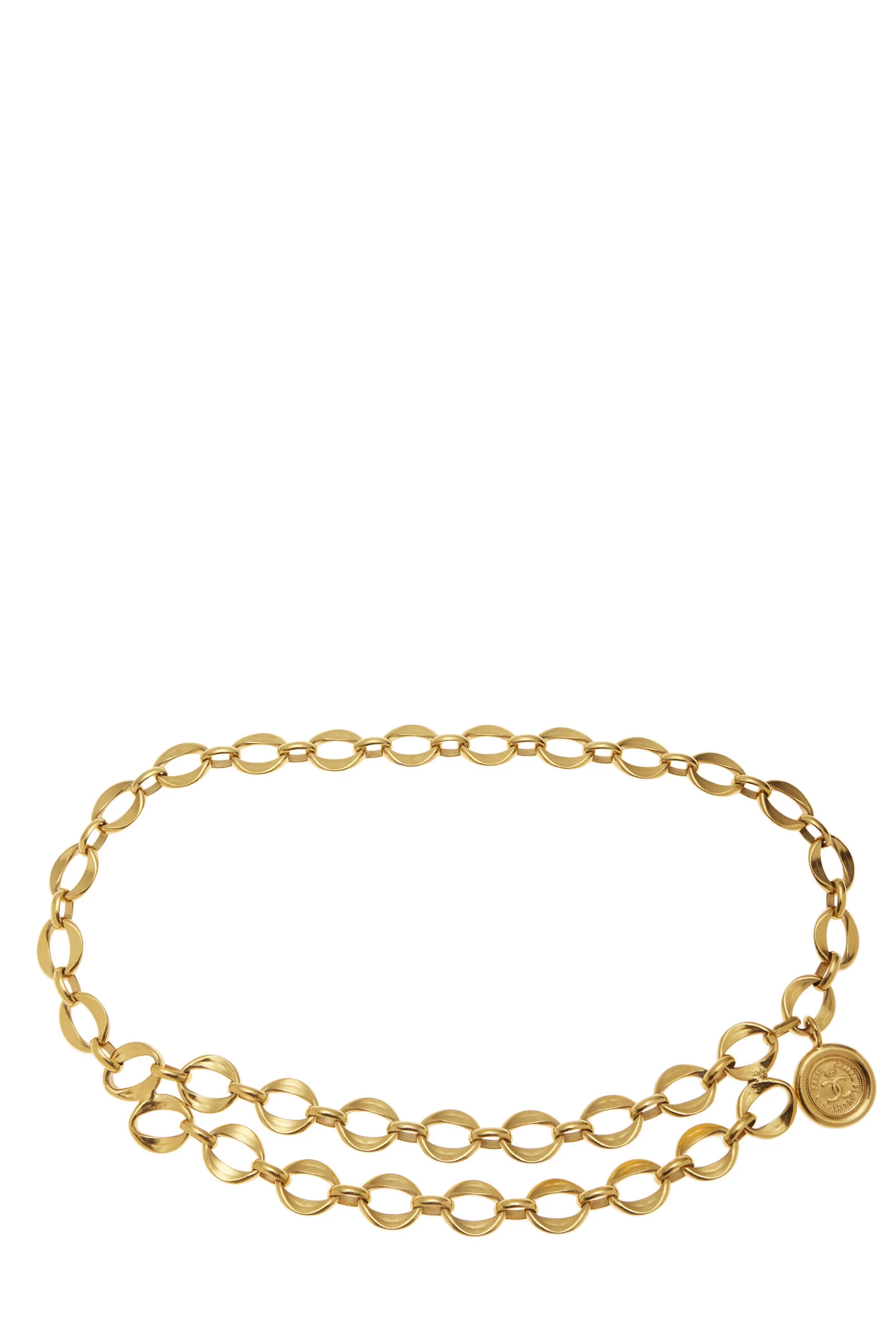 Vintage Chanel chain belt crafted in gold-plated hardware, featuring a draped second chain and ‘CC’ logo pendant. Closure can be hooked on multiple links for a variety of fits.