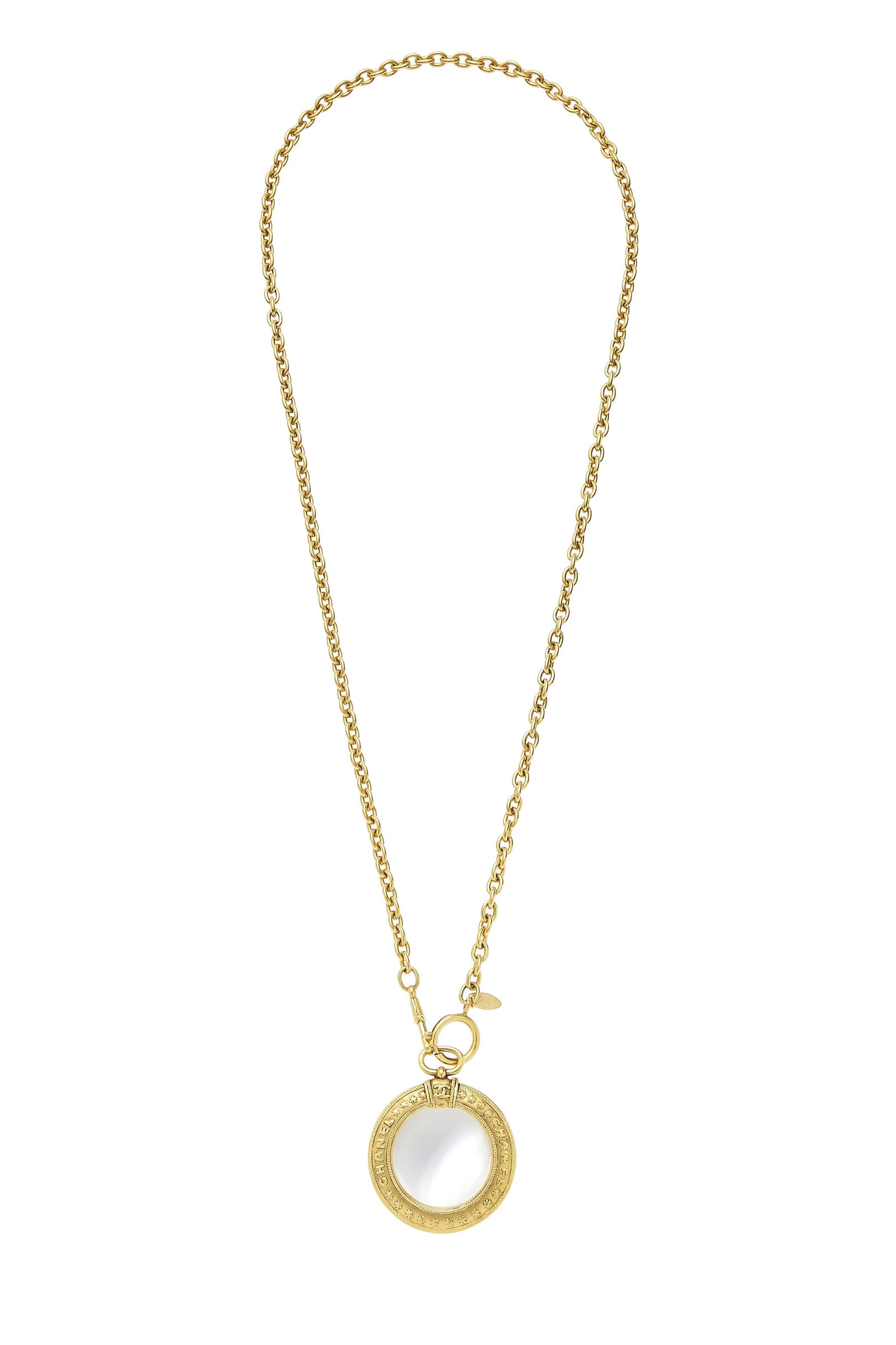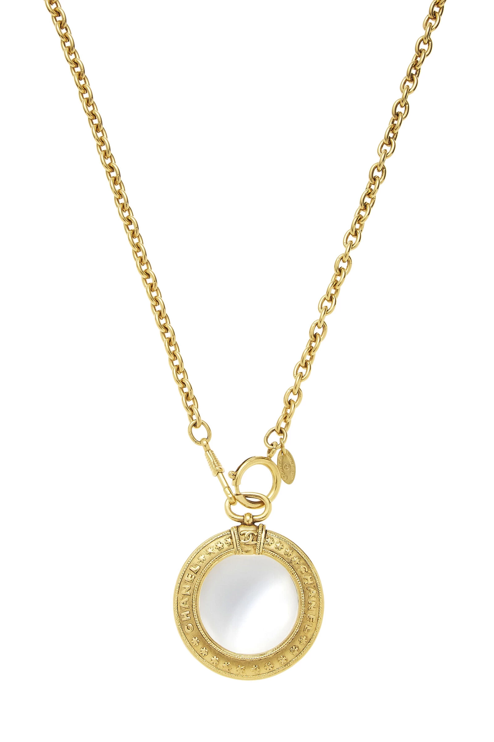 Vintage Chanel gold-plated necklace featuring a long chain and a round loupe pendant with engravings and ‘CC’ logo at the border. Pendant measures 1.9″ x 1.9″