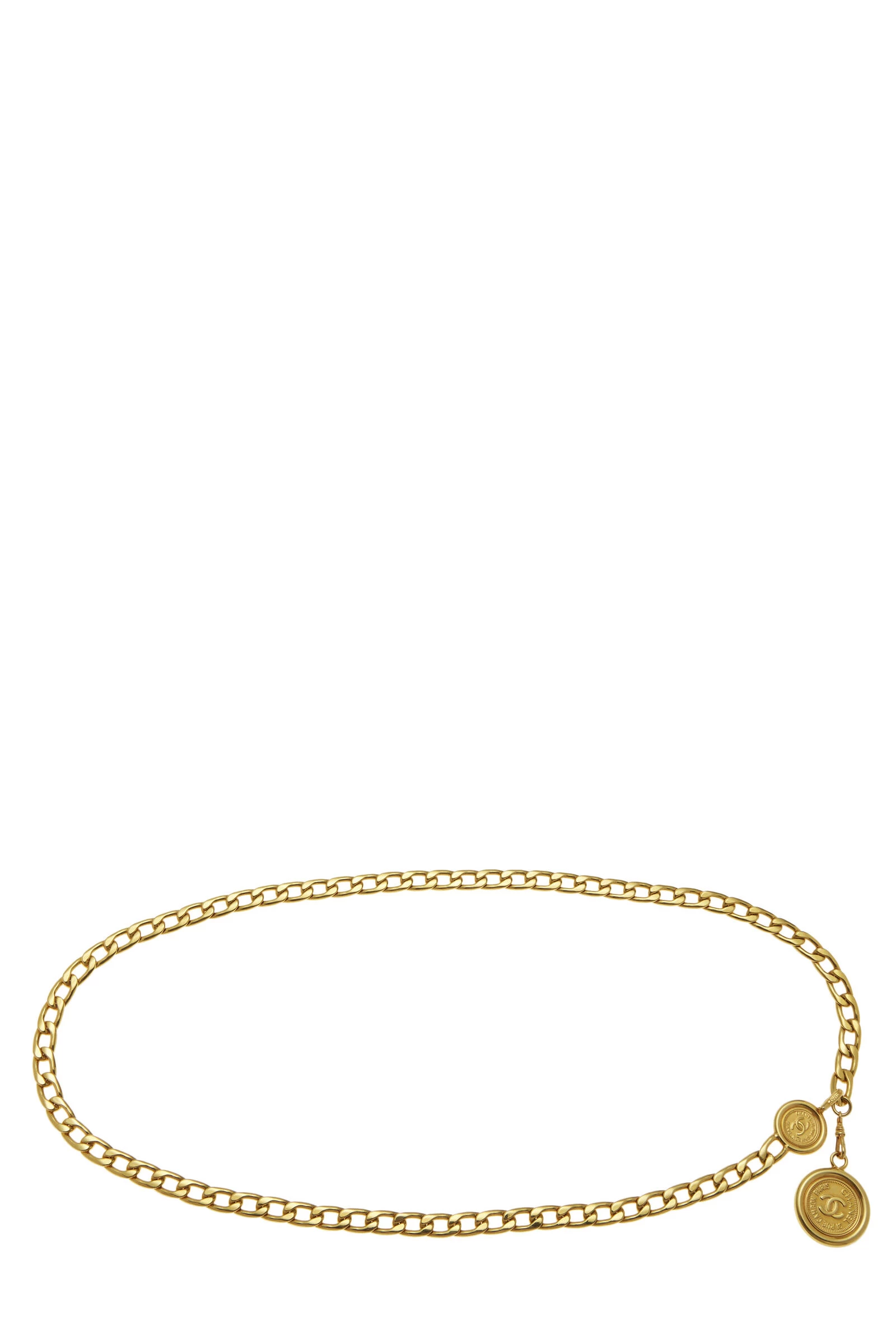 Vintage Spring 1995 Chanel gold-plated chain belt featuring ‘CC’ logo-stamped medallions. Closure can be hooked on any link for a variety of fits.