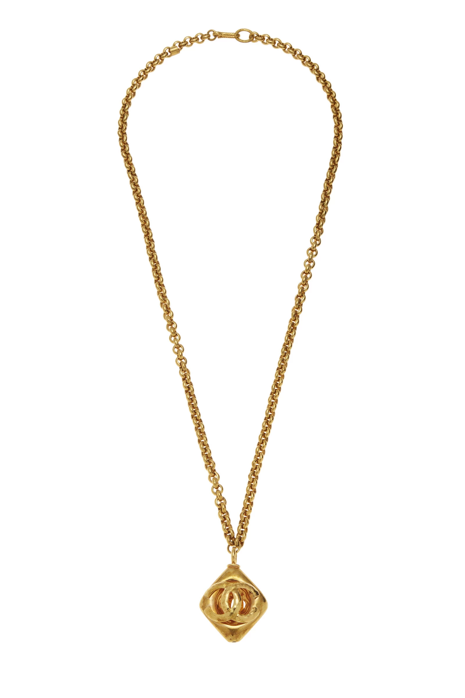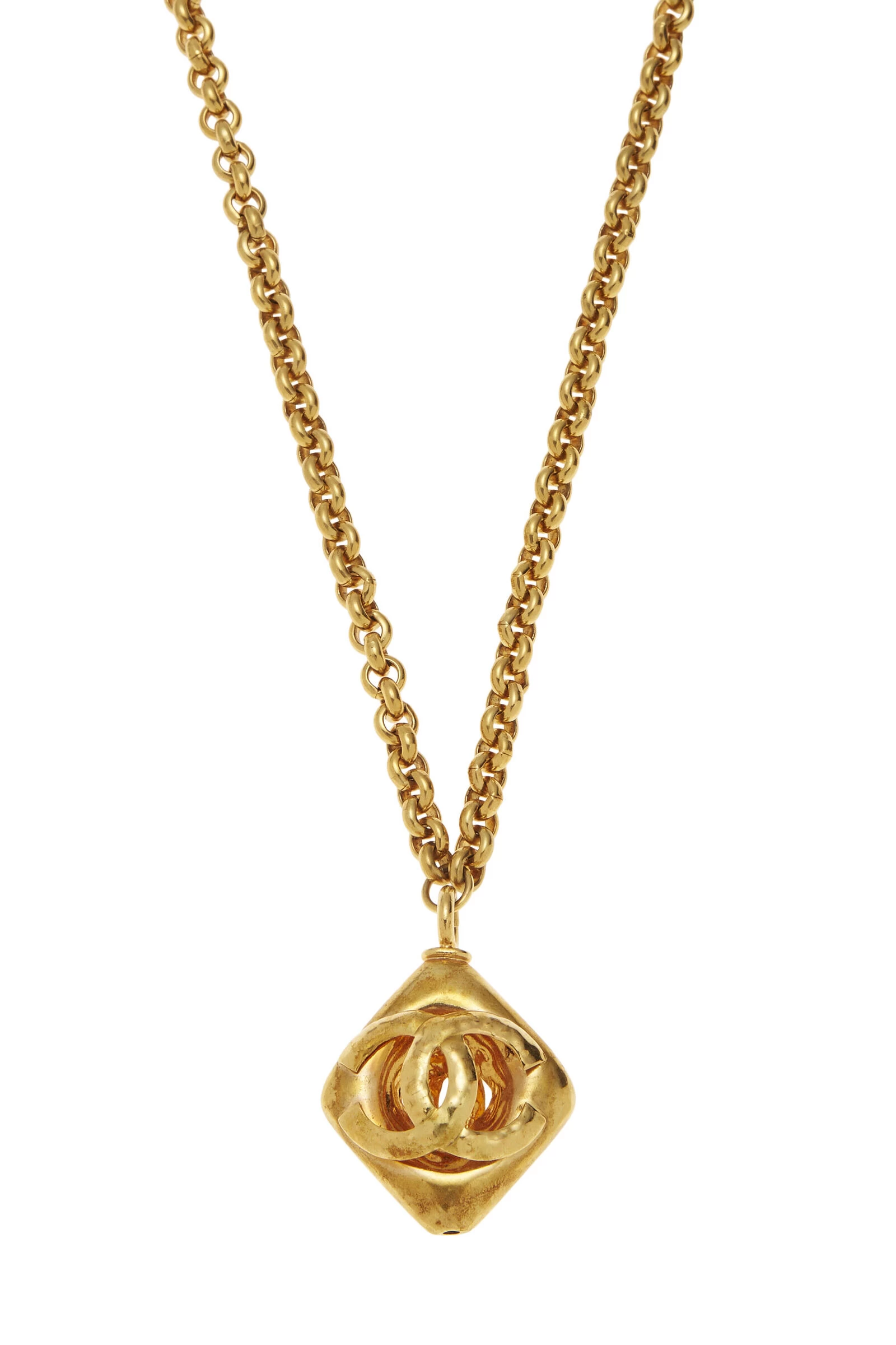 Vintage Chanel gold-plated long chain necklace from collection 29 featuring a diamond-shaped pendant with interlocking ‘CC’ logo. Pendant measurements 2″ x 1.25″