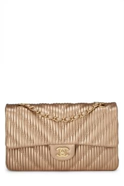 From the iconic Cruise 2018 collection, the Chanel Classic Double Flap bag, featured here in the medium size, crafted in chevron-quilted lambskin leather with pleated detail throughout – giving the bag a three-dimensional finish – and accented with gold-tone ‘CC’ turnlock and chain hardware.