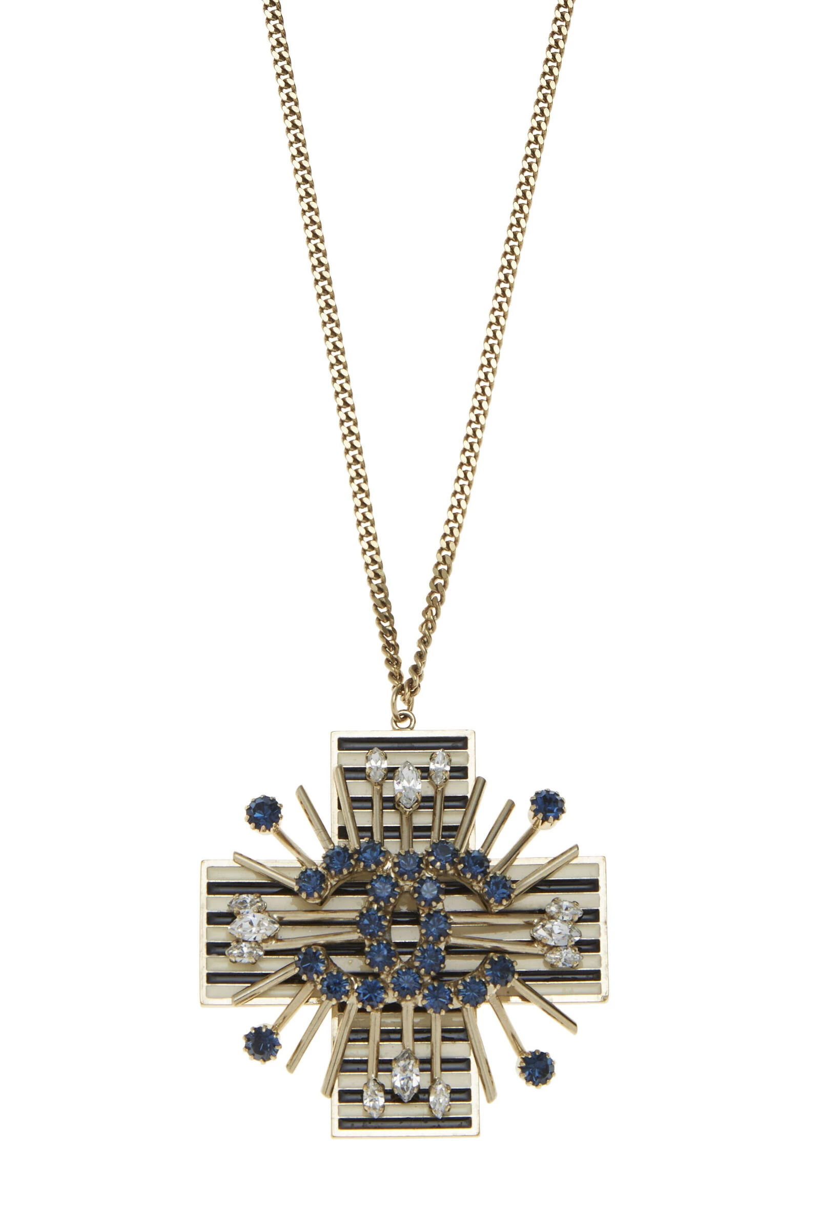 From the Fall of 2003, this Chanel necklace features a gold-tone long chain, a cream and black enamel cross pendant embellished with bead and crystal details and finished with the ‘CC’ logo adorned from blue crystal.