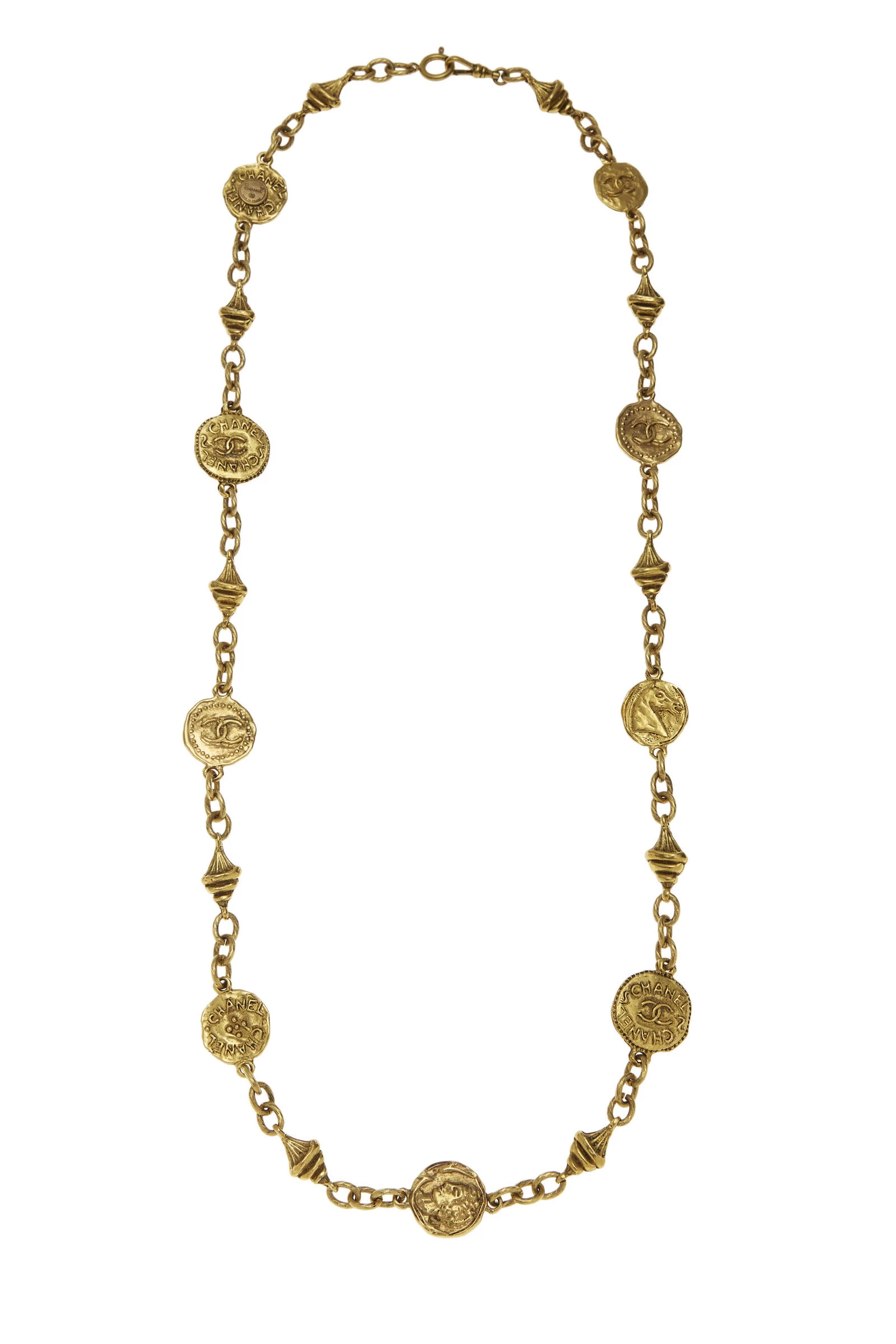 Stylish Chanel gold-plated chain necklace featuring coin-shaped hammered pendants adorned with iconic Chanel imagery engraving.