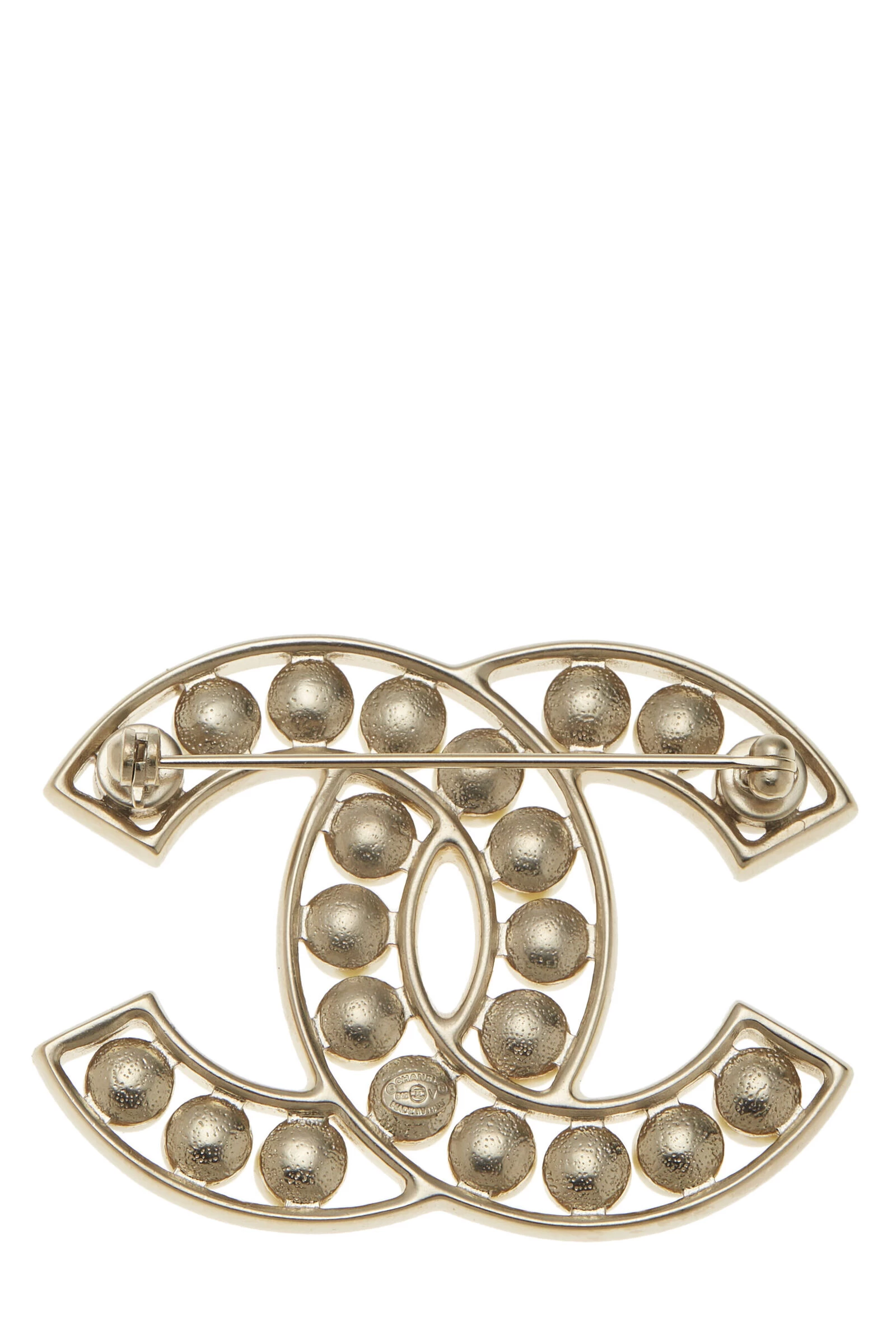 A classic staple piece, this Chanel pin is crafted in pale gold-tone metal, featuring the iconic interlocking ‘CC’ logo adorned with faux pearls.