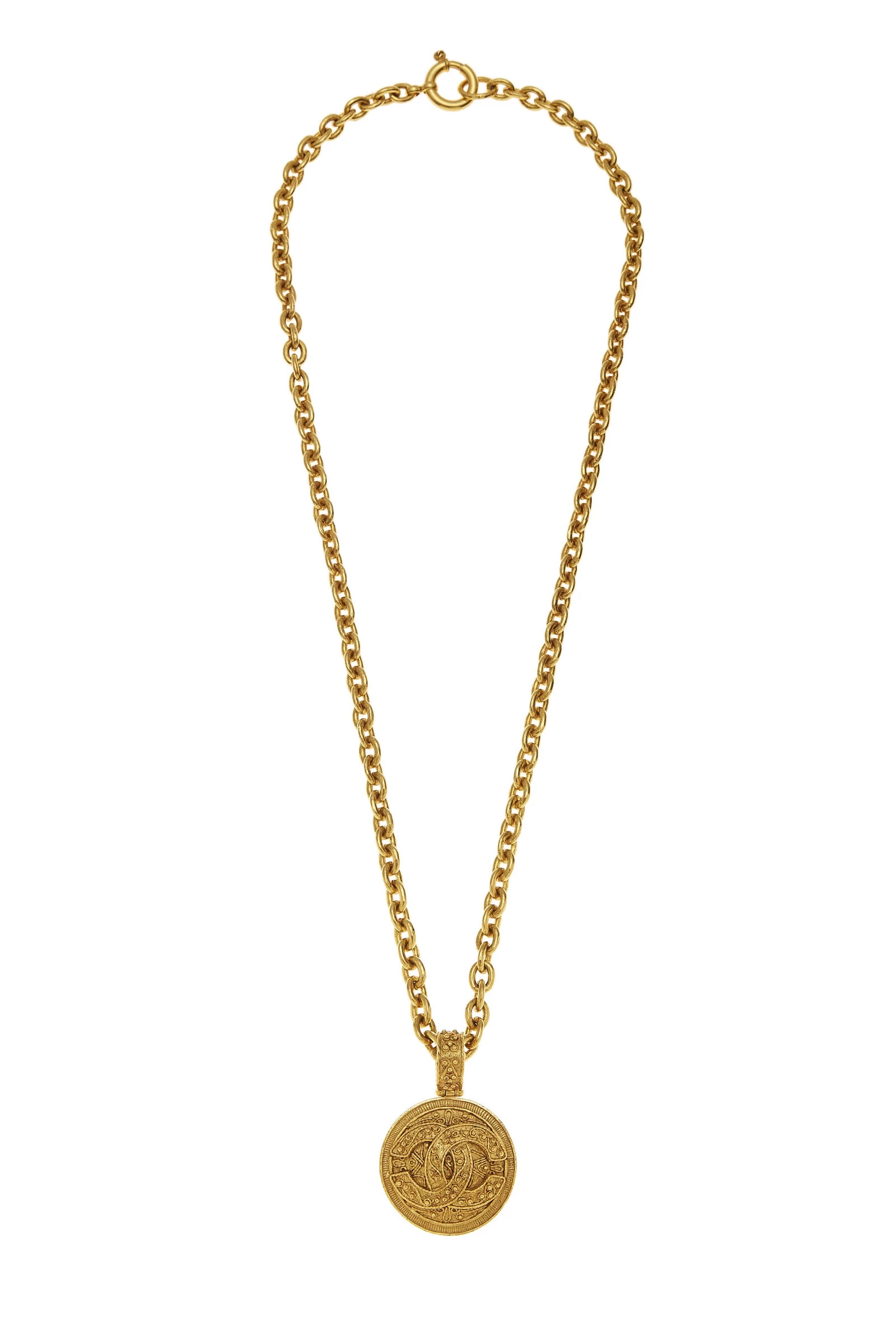 From the Fall 1994 collection, this Chanel gold-plated long chain necklace features a round pendant with filigree engravings and cutout ‘CC’ logo at center.