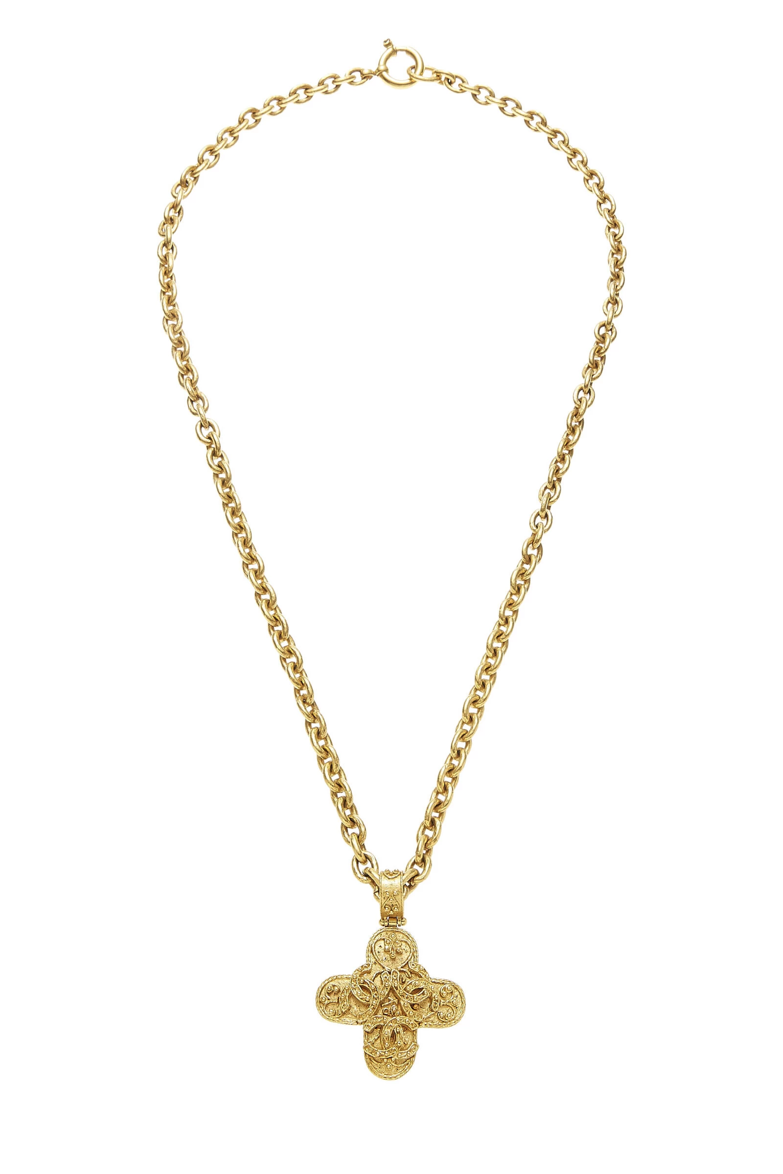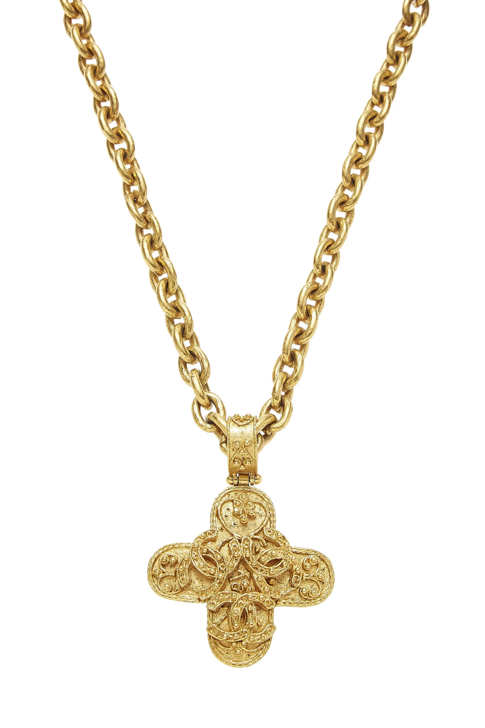 From the Fall 1994 collection, this vintage Chanel long necklace features a thick chain and a hinged cross pendant, embellished with ornate Filigree and logo detailing. Pendant measurements 3′ x 3.5′.