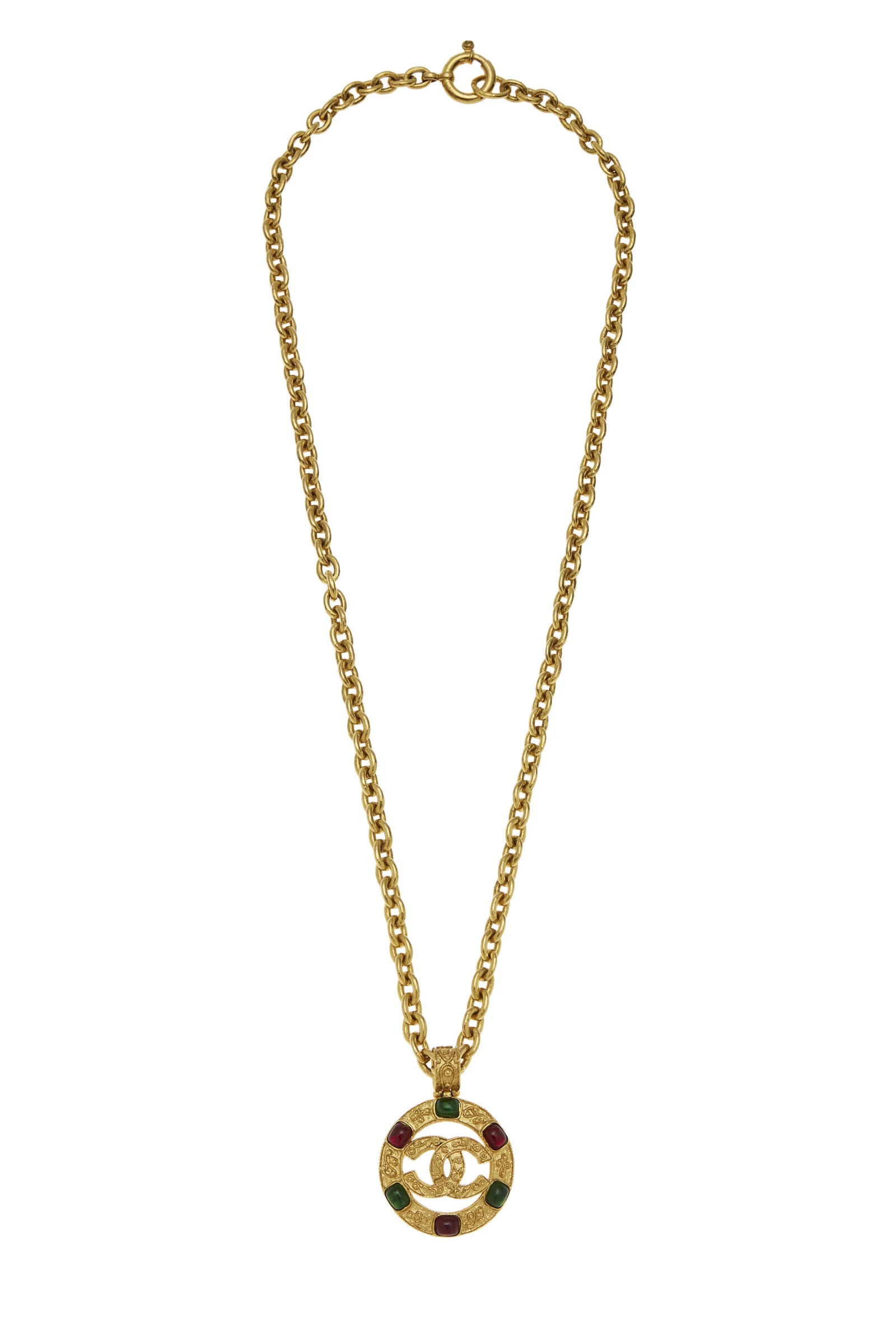 Vintage Fall 1994 Chanel necklace crafted in gold-plated hardware, featuring a hinged round pendant with filigree etching, red and green Gripoix embellishments, and large ‘CC’ logo at the center.