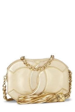 Vintage late 80s Chanel mini oval bag crafted in supple lambskin leather, featuring interlocking ‘CC’ appliqué on front and finished with gold-plated hardware with tassel zipper pull.