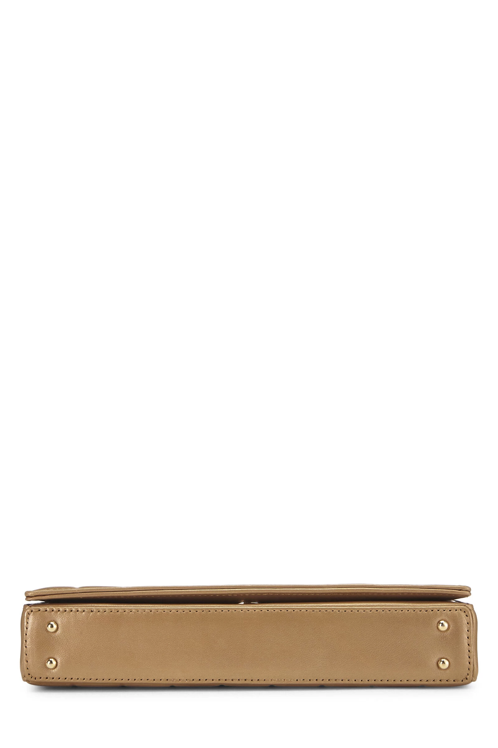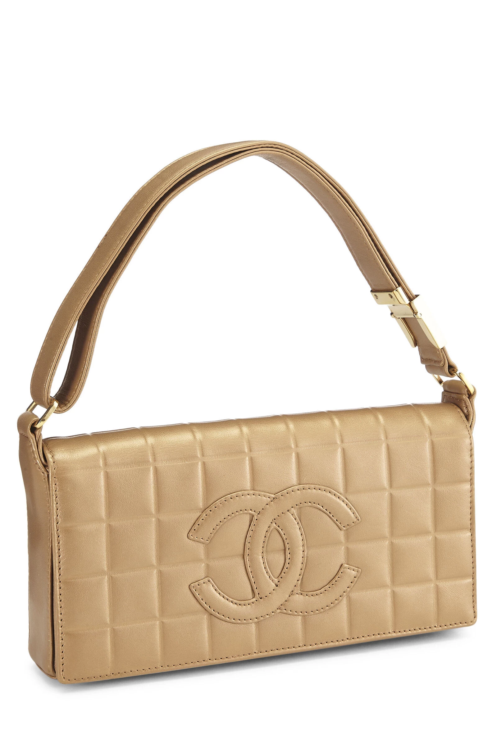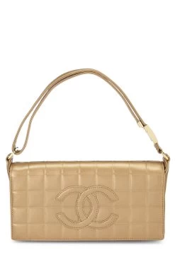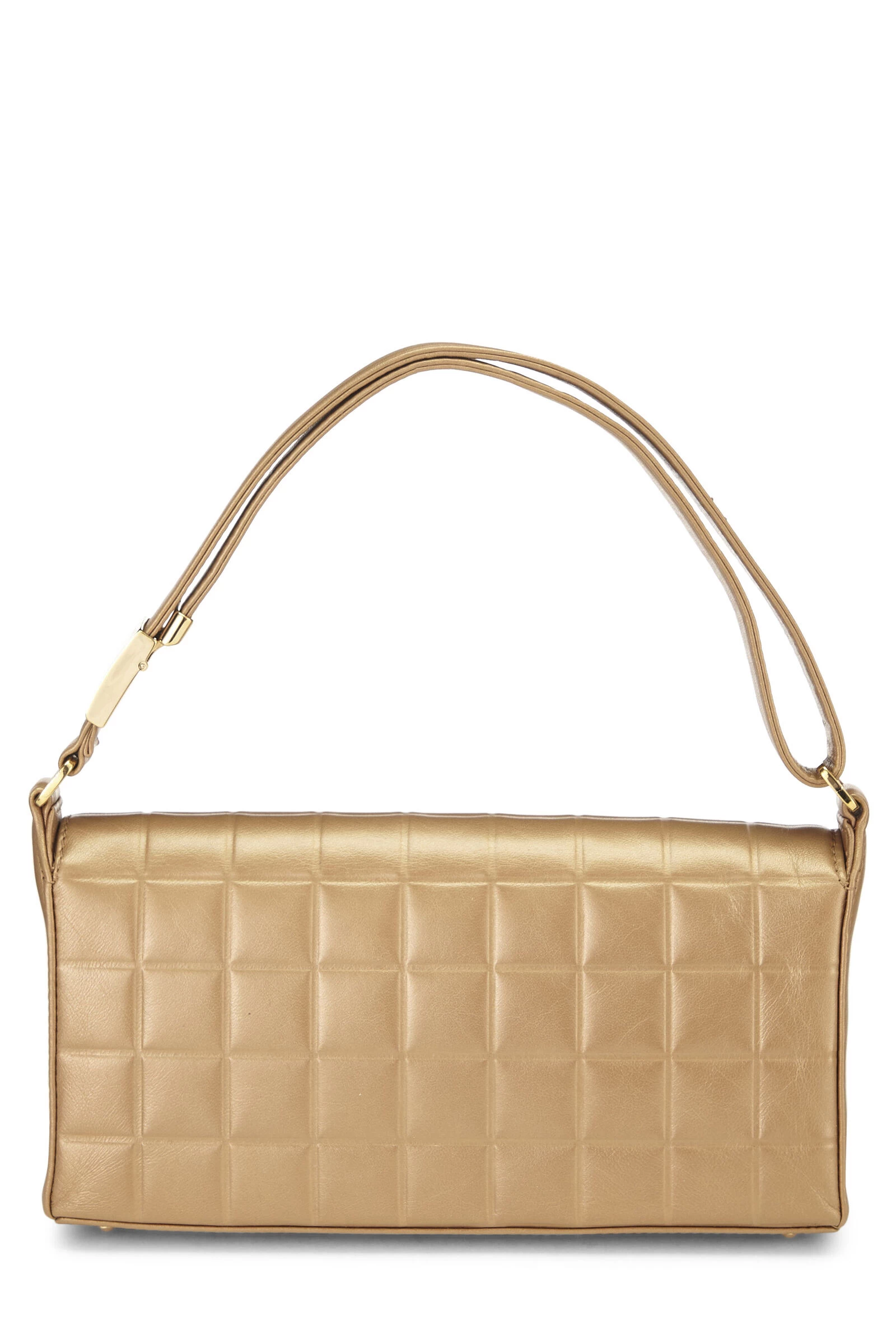 Structured and chic, this early-2000s Chanel Chocolate Bar shoulder bag is crafted in metallic gold quilted leather, accented with a tonal interlocking ‘CC’ appliqué on the front flap, and finished with gold-plated hardware.