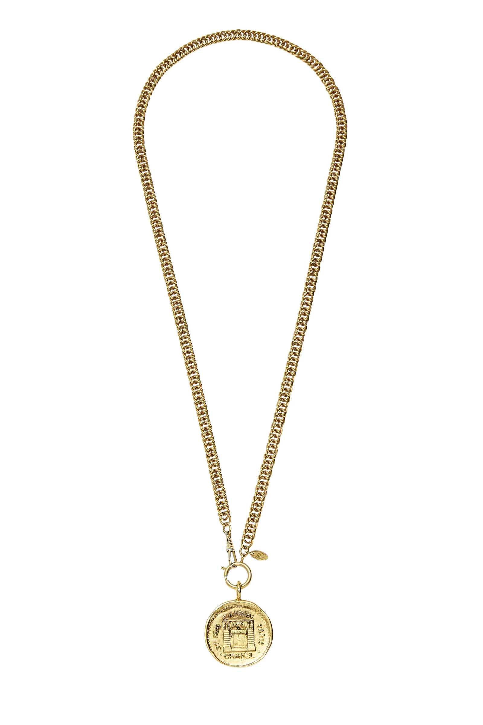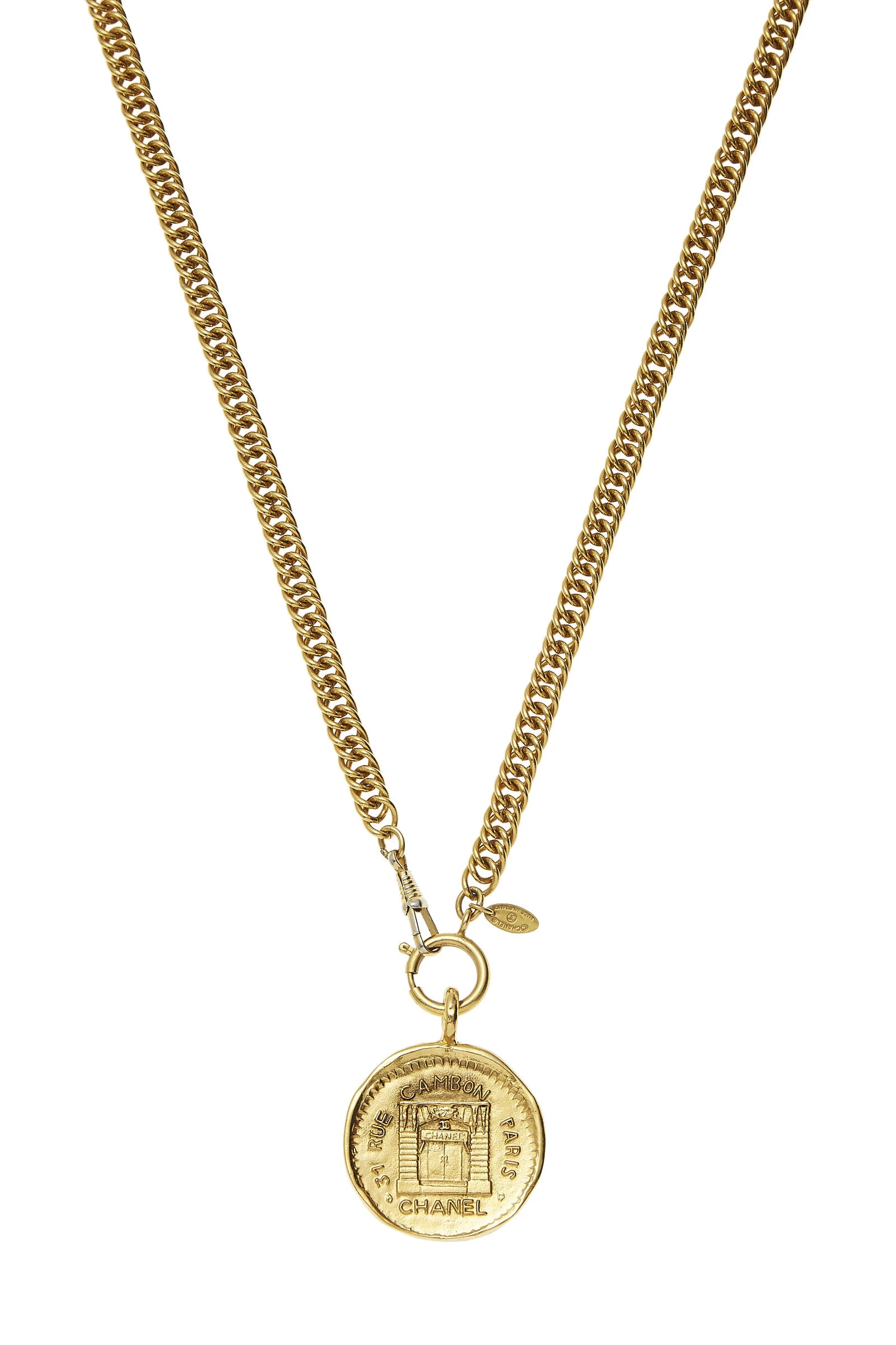Vintage Chanel long chain necklace featuring a round Rue Cambon stamped pendant.