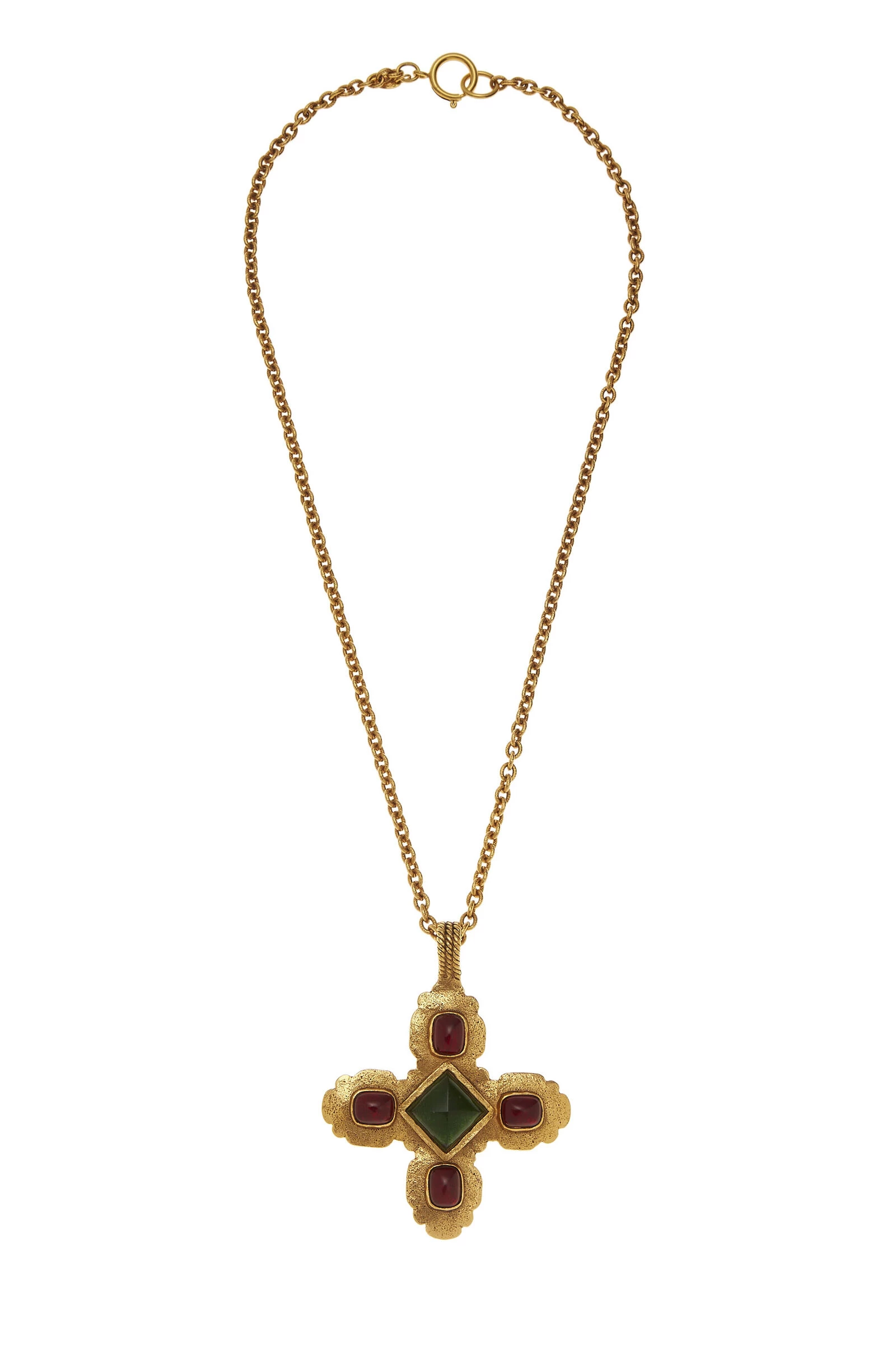 An iconic presentation of the intricate glasswork the house of Chanel is known for, this vintage late 80s necklace is from Collection 25. It is crafted in gold-plated metal, featuring a long chain broken up with diamond-shaped Gripoix beads, and finished with a hanging cross pendant that’s adorned with signature Gripoix poured glass in various colors. Pendant measurements 3.5″X3″.