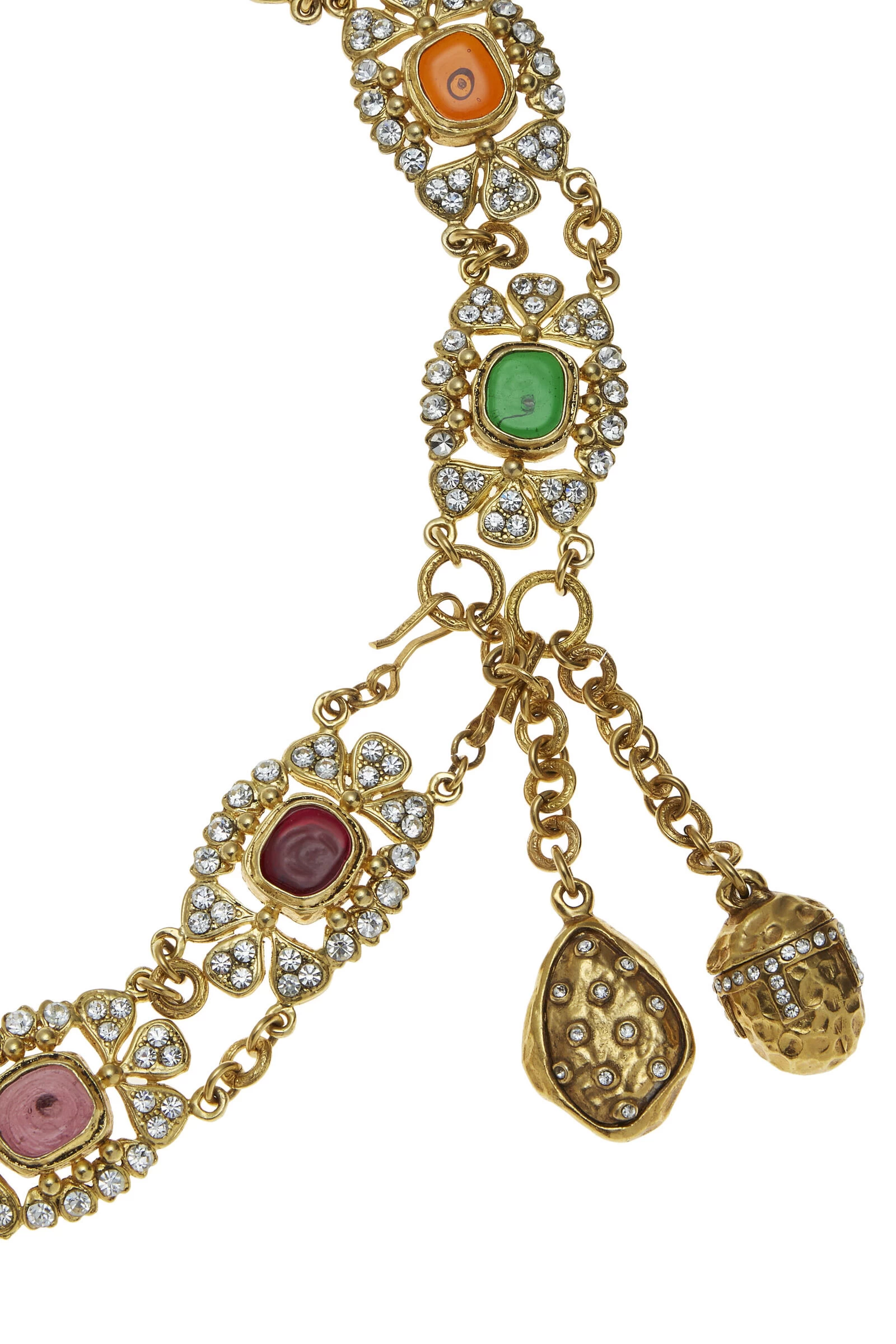 Rare vintage Chanel gold-tone chain belt from 1984, featuring multicolored Gripoix pendants with crystal-embellishment at the borders. Belt closure can be hooked on any chain link for a variety of looks and sizes.