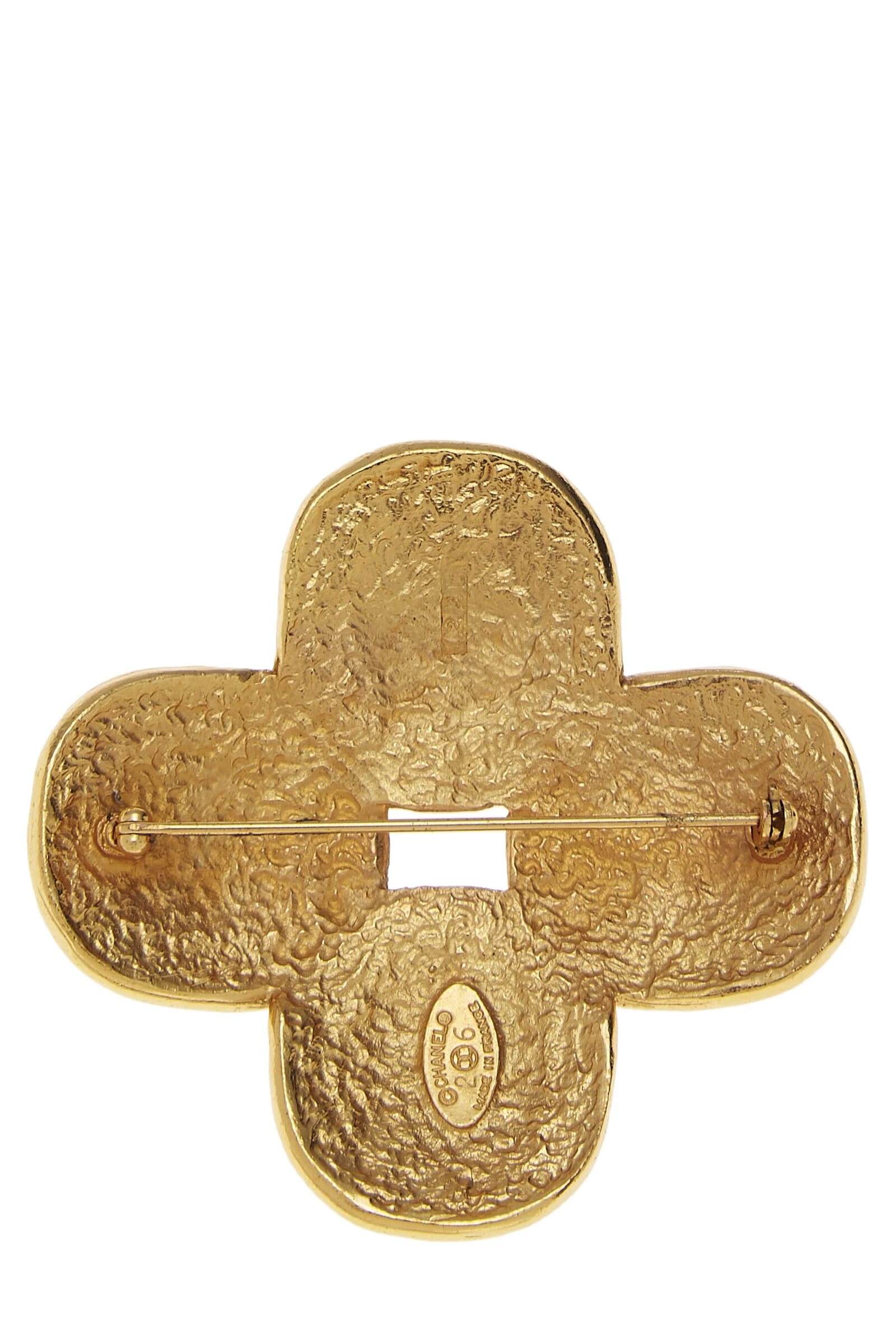 This striking vintage late-80s Chanel pin is crafted in gold-plated metal, featuring a logo-engraved cross silhouette adorned with large multicolor Gripoix embellishments.