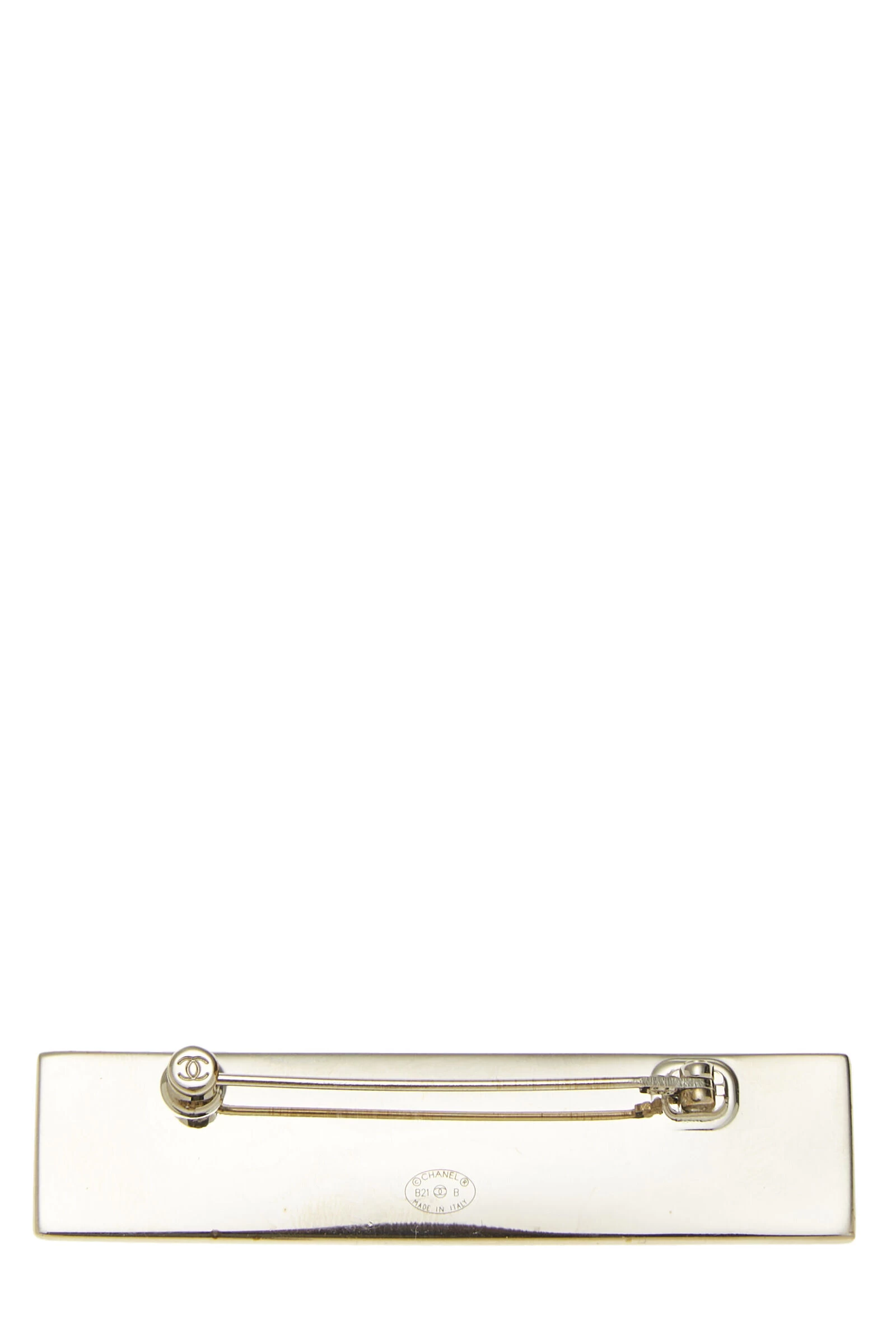 Classic Chanel nameplate pin crafted in gold-tone metal and featuring a rectangular shape and brand engravings.