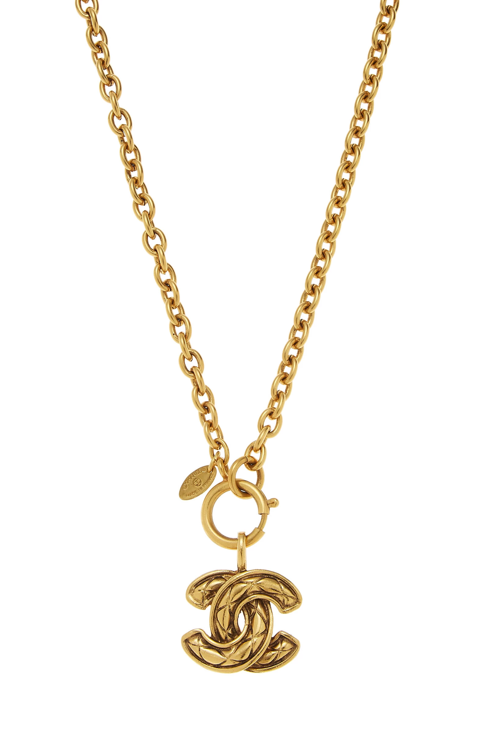 Classic Chanel necklace featuring a gold-tone chain and a small quilt-engraved ‘CC’ logo pendant. Pendant measures 1.2″ x 1″