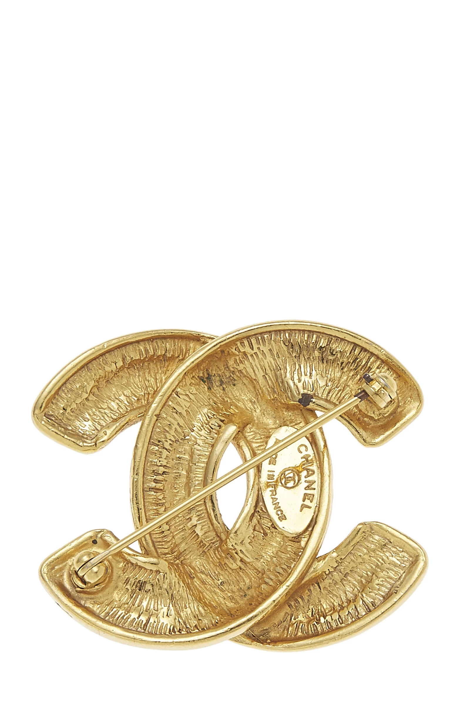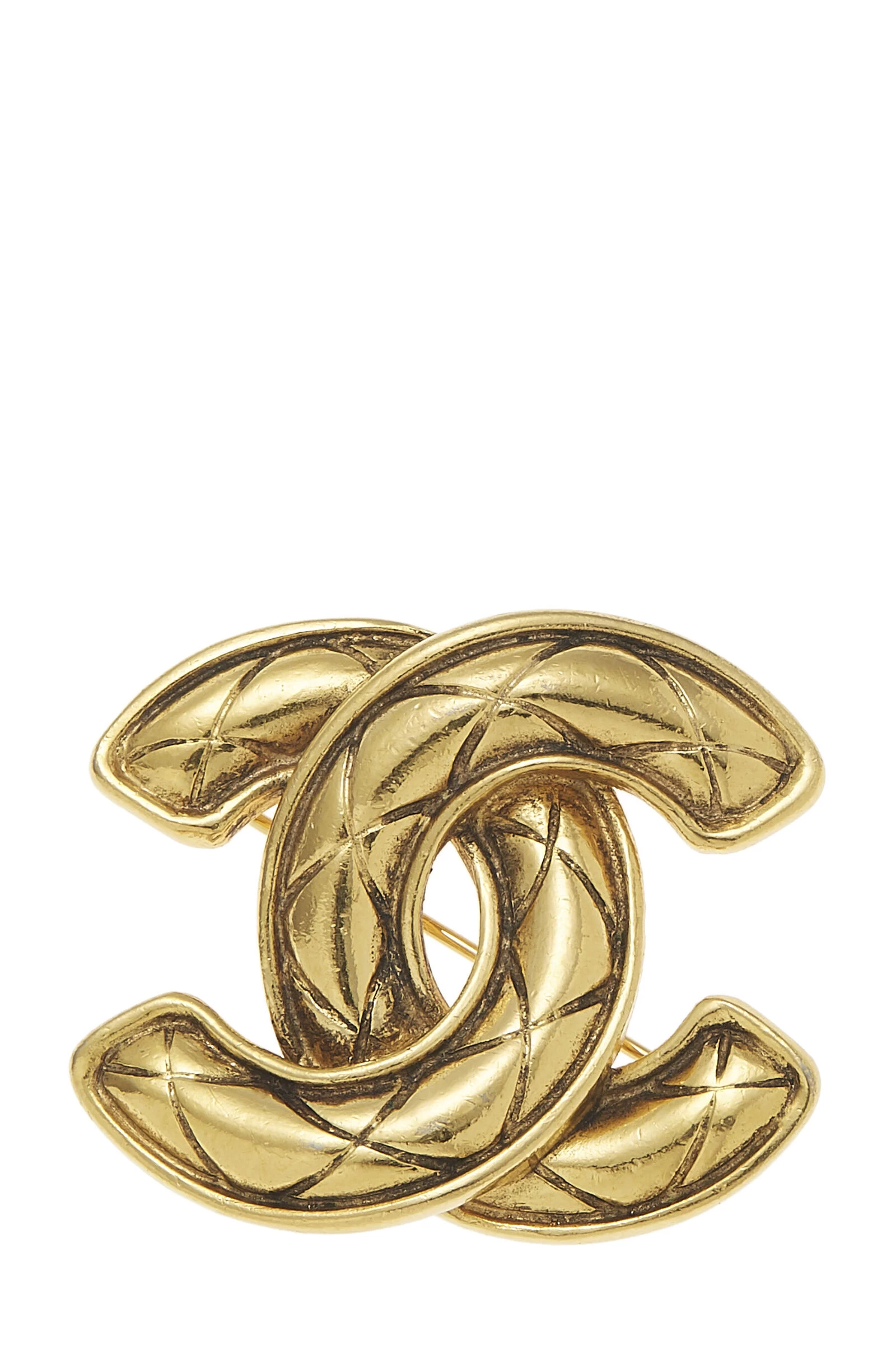 Vintage Chanel gold-plated medium pin featuring the iconic ‘CC’ logo accented with quilted engravings.